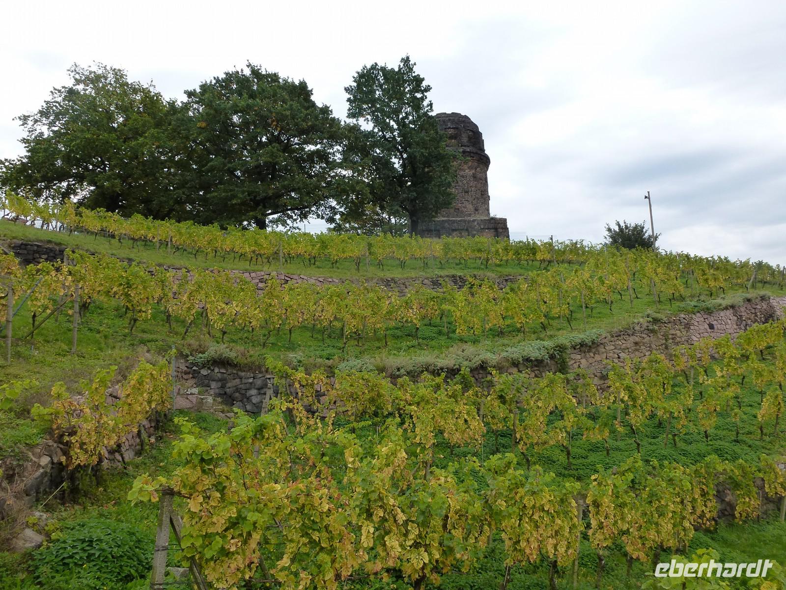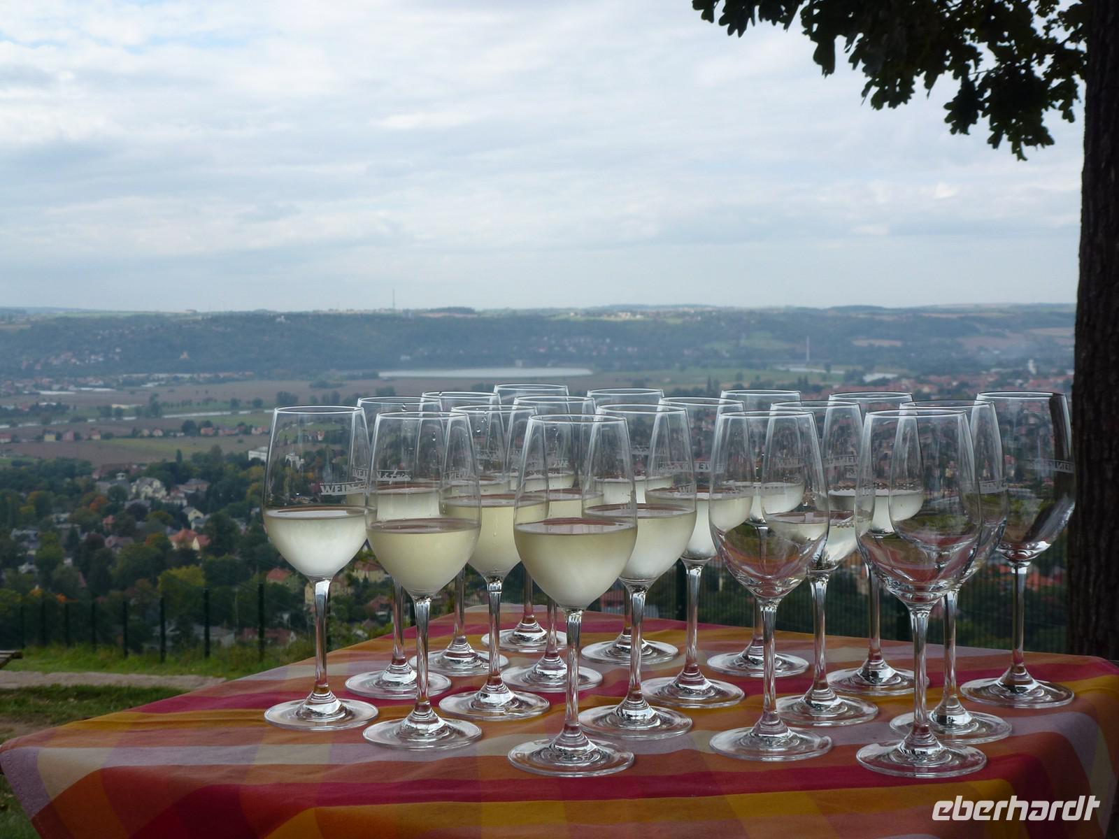 Unsere Wanderung führte uns oberhalb der Radebeuler Weinberge zum beliebten Aussichtspunkt „Bismarckturm". Der Bismarckturm in Radebeul, auch Bismarcksäule, ist einer von etwa 145 in Deutschland noch existierenden Bismarcktürmen zu Ehren des Fürsten Otto von Bismarck (1815-1898). Der Radebeuler Turm wurde von Wilhelm Kreis als individueller Entwurf gestaltet, von Baumeister Alfred Große aus Kötzschenbroda erbaut und am 2. September 1907 eingeweiht. Er hat eine Höhe von 18 Metern. Hier oben erwartete uns das nächste Schlückchen. Mit einem tollen Ausblick auf das wunderschöne Elbtal genossen wir einen schmackhaften Weißwein-Cuvee und verkosteten selbstgebackenes Brot mit einem Käse nach Maasdamer Art. Hmmmm! Viele Besucher fragten uns, wo sie denn diese Kostprobe erwerben könnten - doch unsere Weinwanderung inklusive der Verkostungen war nur für unsere Gäste organisiert!