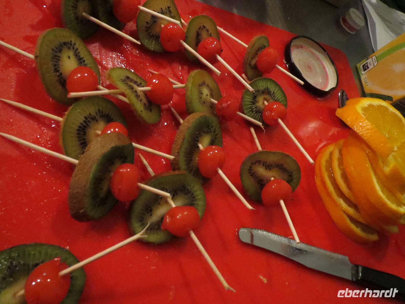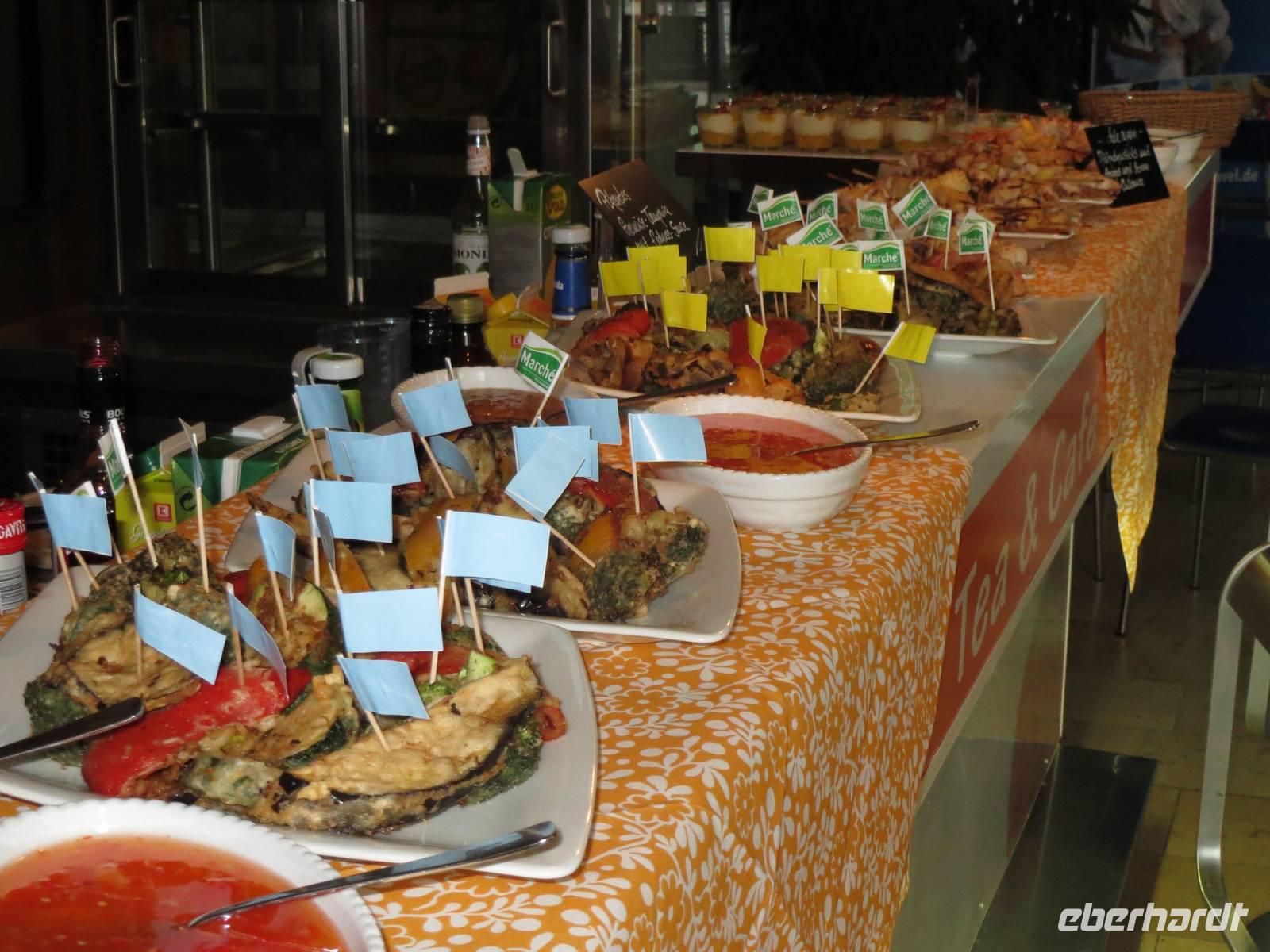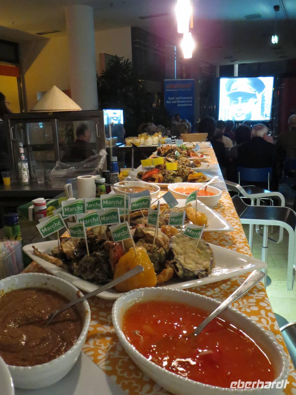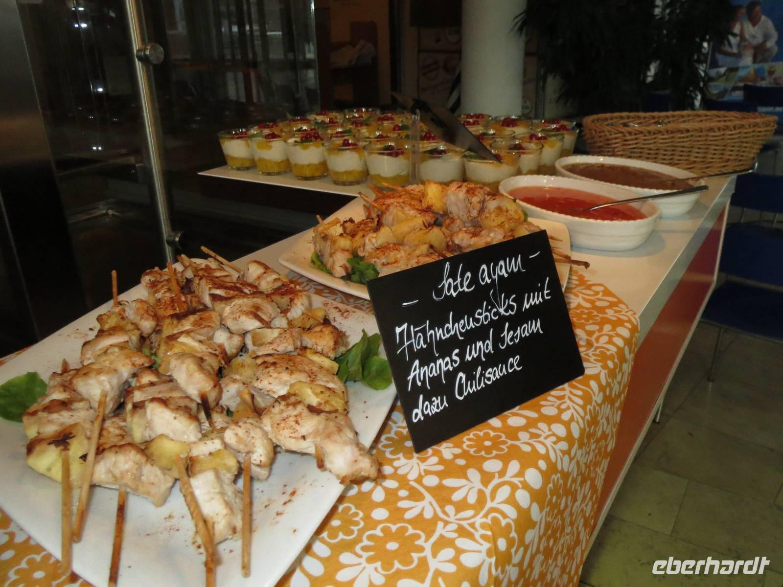 Als Auftakt gab es für jeden einen leckeren Cocktail - cremig, kokosnussig oder fruchtig, orangig! Es folgten köstliche exotische Snacks wie Saté-Spieße, Gemüse tempura und Mango-Créme. Mmmhh, so kamen die Geschmacksnerven schon mal in Stimmung, bevor es um 16:30 Uhr mit unserer Vortragsreihe los geht.