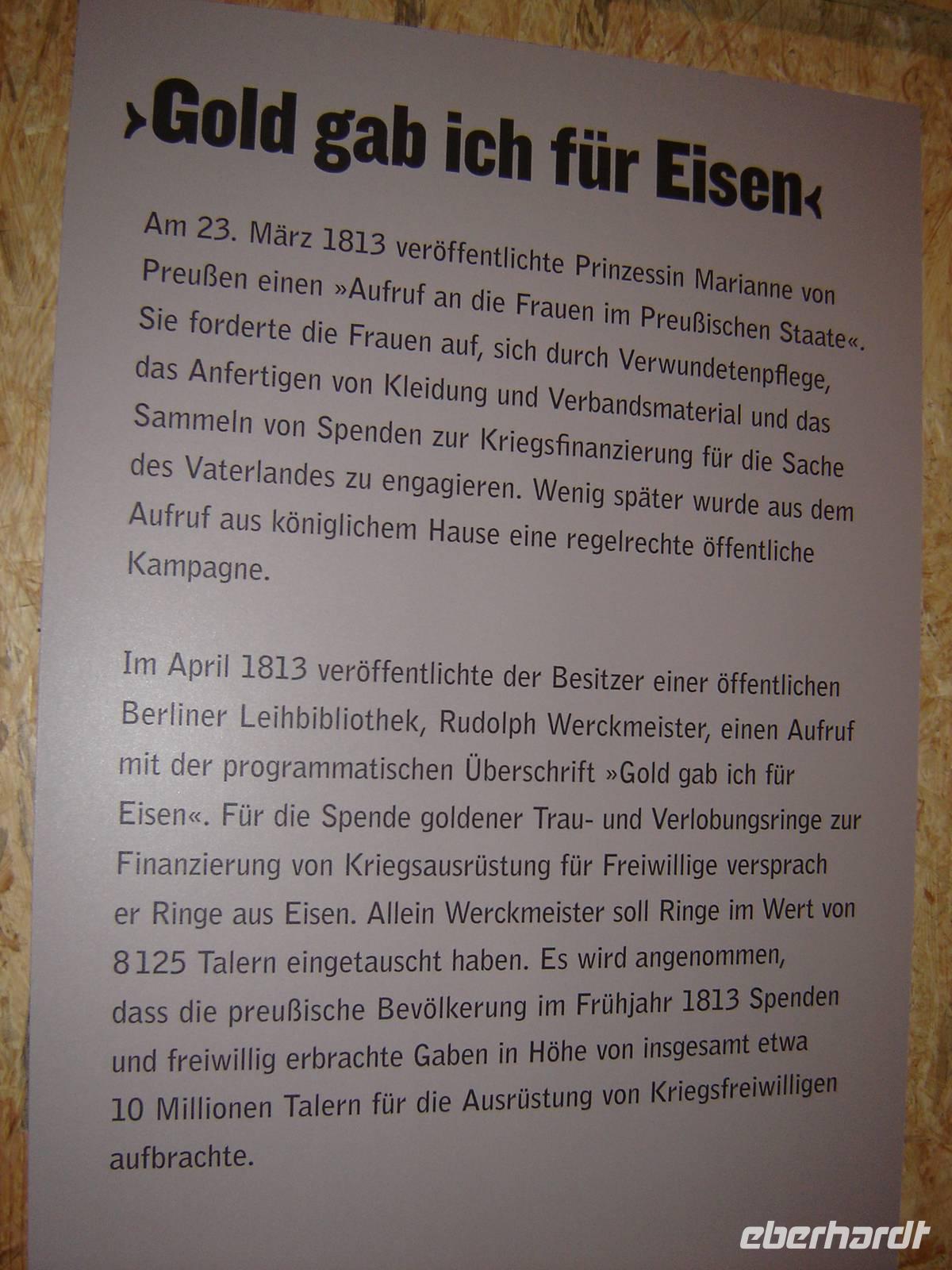 Die interessante und amüsant gestatltete Stadtführung von Marktfrau Marlene endete am alten Rathaus, welches heute das Stadtgeschichtliche Museum beherbergt. In dessen neuem Gebäude besuchten wir die Sonderausstellung „Helden nach Maß", die sich Heldengeschichten, Symbolen und Legenden aus der Zeit der Befreiungskriege widmet. Sämtliche Zeugnisse, Biografien der Helden wie Theodor Körner oder Eleonore Prochaska (bekannt als Jeanne d'Arc) sowie Napoleon-Karikaturen veranschaulichten das Thema.