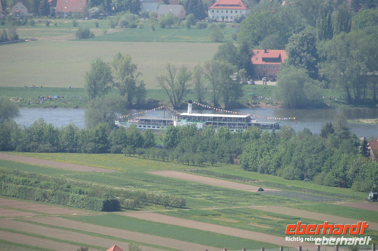 Von hier ging es durch den schattigen Wald in Richtung Pillnitz. Unterwegs machten wir eine Pause, in der Uns Herr Winn Musik von Wagner vorspielte und wir wieder ein Schlückchen Wein genossen. Des Weiteren stoppten wir an einem herrlichen Aussichtspunkt, wo wir unser Eberhardt-Lunchpaket verzehrten und dazu noch einen Blick auf die Dampferparade auf der Elbe werfen konnten.