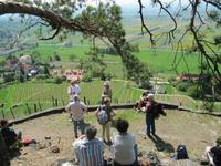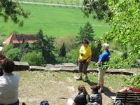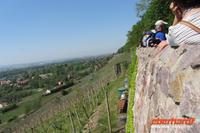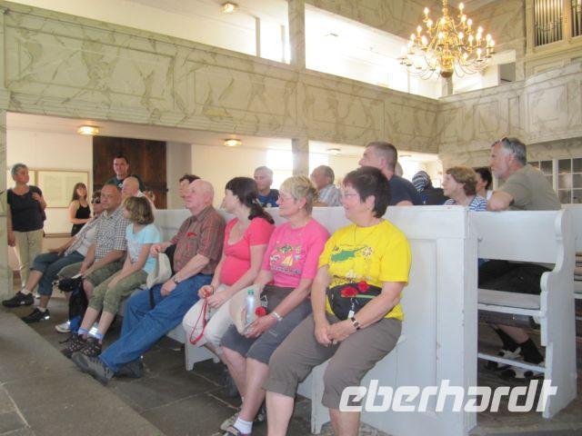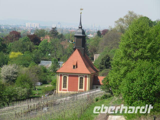 Bei einem Schluck Rotwein genossen wir die herrliche Aussicht auf den Weinberg, Schloß Pillnitz und Dresden bis in die naheliegende Sächsische Schweiz. Wir genossen noch einmal eine schattige Pause oberhalb des Weinbergs mit vielen Erläuterungen zu Wagner und zum Weinanbau bevor wir den Weinberg hinab stiegen. Zum Anschluß gab es noch Erklärungen zur Weinbergkirche, die mit Unterstützung privater Geldgeber wieder aufgebaut wurde.
