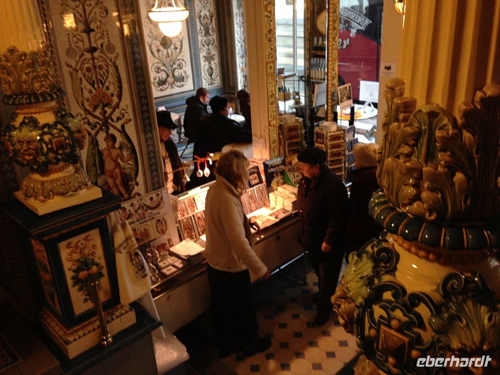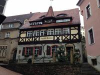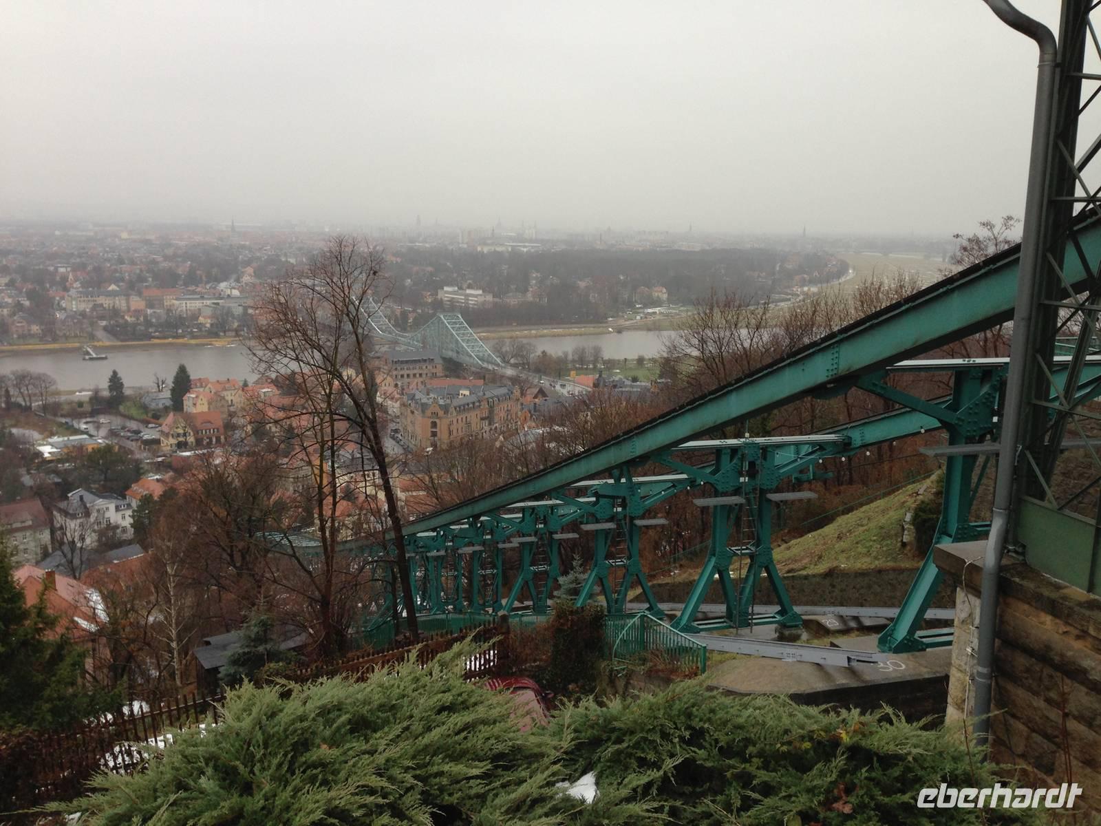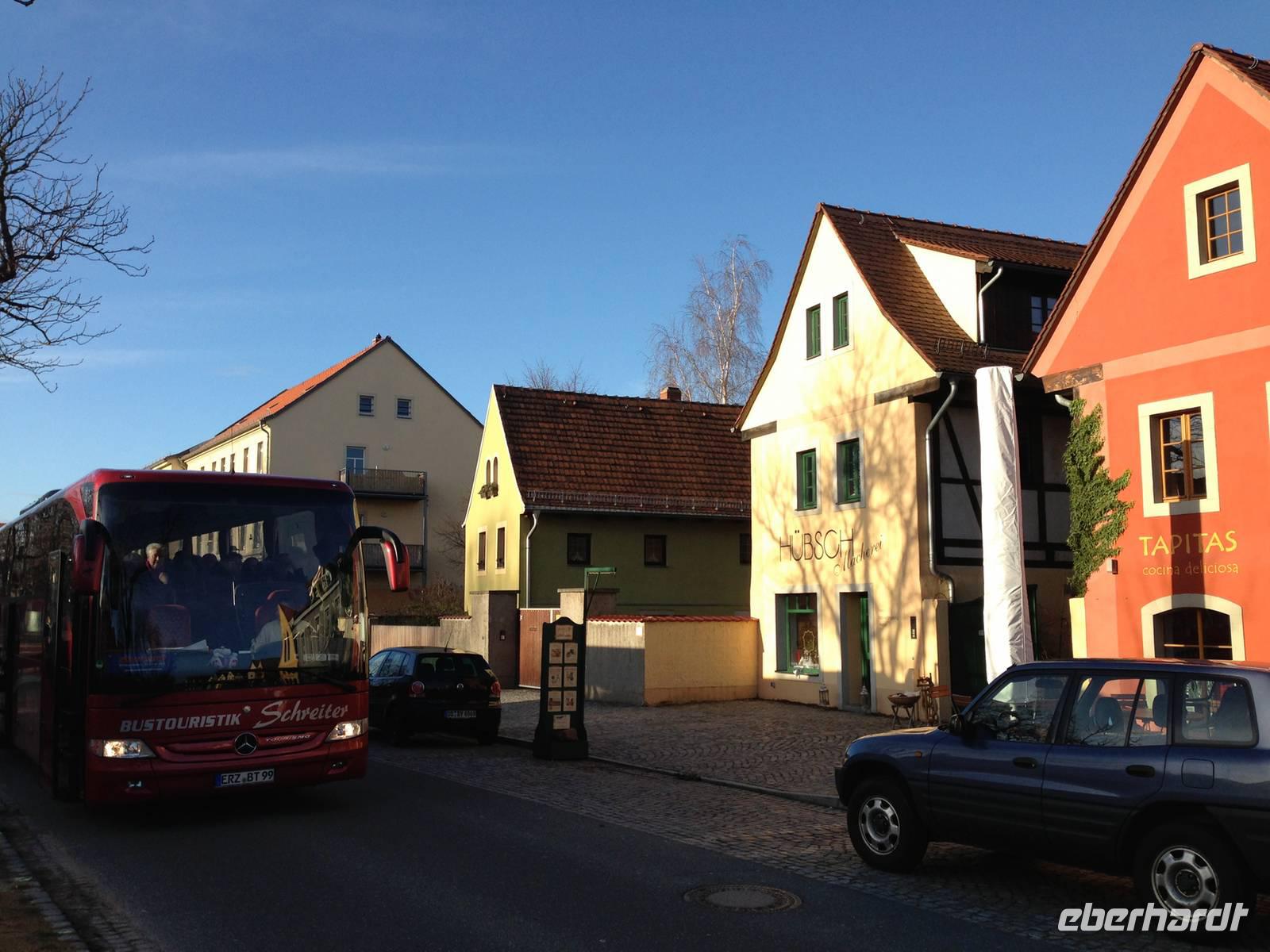 Um zehn Uhr ist unsere 35-köpfige Reisegruppe komplett und nach einer kleinen Kaffeepause am Flughafen Dresden geht die Fahrt in Richtung Stadtzentrum weiter. Die Stadtführerin erwartet uns schon am Zwinger - mit einem großen Schirm, welcher nicht nur Erkennungszeichen, sondern vielmehr als Schutz vor dem mittlerweile immer stärkeren Regen dient. Immerhin können wir den Anblick von Zwinger, Semperoper, Hofkirche, Schloss und Striezelmarkt im Trockenen genießen! Vorbei an den Elbschlössern geht es über das Blaue Wunder zum Schillerplatz. Von dort unternehmen wir einen kleinen Spaziergang zur Talstation der Dresdner Schwebebahn, welche seit 1901 die Stadtteile Loschwitz und Oberloschwitz verbindet. Der Blick von der Bergstation über das Elbtal und auf das Blaue Wunder ist auch bei Regen beeindruckend und die Fahrt mit der als Historisches Wahrzeichen ausgezeichneten Bahn ist ein kleines Erlebnis. Vom Schillerplatz fährt uns Frank mit seinem roten "Forchheimer" anschließend zu Pfund's Molkerei, dem schönsten Milchladen der Welt. In der Tat sind die komplett mit Majolikafliesen in Jugendstilformen ausgestatteten Räume sehenswert, denn vom Fußboden bis zur Decke ist alles original, wie 1892 von Villeroy&Boch ausgestattet, erhalten. Der Rückweg führt uns über den Albertplatz, wo wir Erich Kästner in Form einer Plastik auf der Mauer zum gleichnamigen Museum begegnen. Leider regnet es immer heftiger, sodass der Besuch auf dem Striezelmarkt eine sehr feuchte Angelegenheit wird. Bereits um 15:30 Uhr machen wir uns auf den Weg zur Fuchsbergklause in Dresden-Weixdorf und freuen uns auf das Abendessen im gemütlichen Restaurant der dazu gehörigen Wildgaststätte.