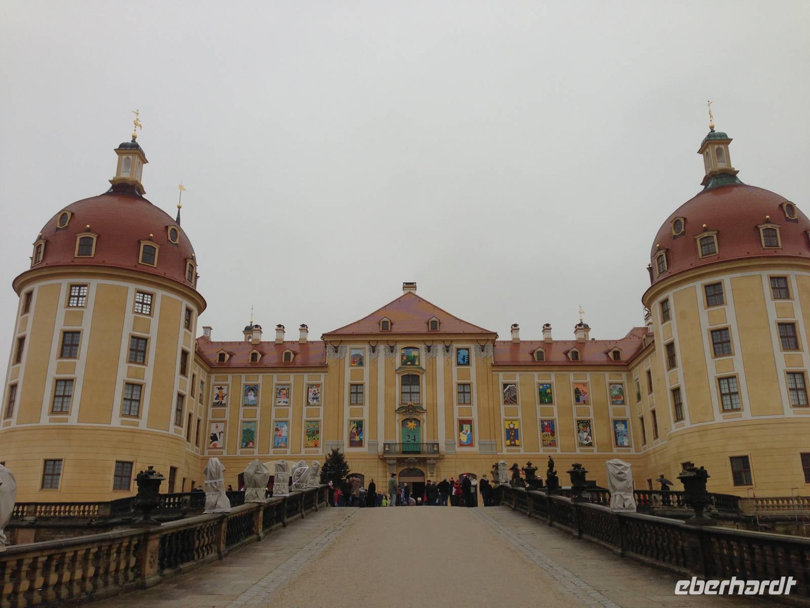 Der Bus bringt uns nach Moritzburg, wo wir einen kleinen Spaziergang zum Schloss machen, welches auf einer Insel inmitten des großen Schlossteiches thront. Zur Zeit wird die Ausstellung "Drei Haselnüsse für Aschenbrödel" gezeigt und es herrscht reger Andrang durch Familien, die ihren Kindern das Warten auf die Bescherung mit einem Ausstellungsbesuch verkürzen. Unser nächster Programmpunkt ist ein weiterer Weihnachtsmarkt: Wir fahren nach Meißen und besuchen den historischen Marktplatz, wo wir uns bei einem Glühwein vor der beeindruckenden Front des Rathauses und weiteren prächtigen Renaissancebauten aufwärmen. Durch das Elbtal, vorbei am Stausee von Cossebaude geht es zurück nach Dresden. Auf der Cockerwiese beim Hygienemuseum erwartet uns die Erlebniswelt der phantastischen Funkelstadt mit mittelalterlichem Treiben auf den Plätzen, einer Weihnachtsshow, Modelleisenbahn, Märchenerzähler, und vieles mehr. Weihnachtlich gestimmt geht es zurück zur Pension, wo eine Kaffeetafel mit Stollen und Gebäck auf uns wartet. „Von drauß' vom Walde ..." kommt Knecht Ruprecht mit Säcklein und Rute. Es gibt besinnliche Weihnachtsgedichte und Lieder, ein lustige Geschichte von einem Weihnachtsbaumständer, weitere, auch lustige Gedichte, Geschenke und einen Weihnachtsquiz mit Preisen. Das anschließende Weihnachtsmenü beschließt eine funkelnde Eistorte!