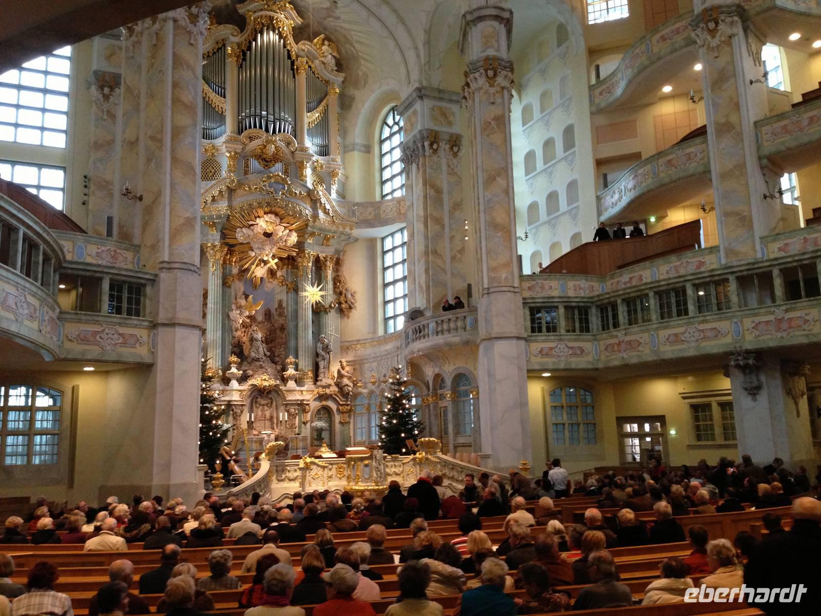 Gestärkt von Nachtruhe und dem ausgezeichneten Frühstücksbuffet können wir das heutige Programm beginnen: Der Besuch des Dresdner Schlosses steht an und somit die Auswahl zwischen mehreren interessanten Ausstellungen: Das Neue Grüne Gewölbe mit der Pretiosensammlung August des Starken beherbergt Kostbarkeiten wie den Kirschkern mit den 113 Gesichtern und Köpfen, aufwändige Elfenbeindrechselkunst sowie die große Fregatte aus Elfenbein, kurfürstlichen Schmuck, Edelsteingefäße und vieles mehr. Das Goldene Kaffeezeug, welches August sich nach dem Probieren von Kaffee auf der Leipziger Messe beim Hofjuwelier Melchior Dinglinger bestellt hat, soll damals den Gegenwert eines Schlosses gehabt haben! In der türkischen Kammer ist die älteste und weltweit bedeutendste Sammlung osmanischer Kunst außerhalb der Türkei zu bestaunen. Die Bewunderung für das damalige osmanische Reich erreichte unter August dem Starken ihren absoluten Höhepunkt, sodass er seinen Adjutanten Spiegel auf exotische Einkaufstour nach Konstantinopel schickte. Das größte Objekt ist ein osmanisches Dreimastzelt: Ein 6 Meter hoher Traum aus Seide und Gold! Im kleinen Schlosshof geht das Staunen weiter: Alle Blicke richten sich 'gen Himmel auf das in der Tat luftige Dach aus Luftkissen, welches aus dem einstigen Hof ein geräumiges Museums-Foyer gemacht hat. "Dresden 1900" ist das Motto des Erlebnisrestaurants am Neumarkt, wo wir Sächsische Kartoffelsuppe und Dresdner Sauerbraten zu Mittag essen. Nach dem Essen ist noch Zeit für einen kleinen Spaziergang auf dem Neumarkt bevor wir uns zur "Geistlichen Festtagsmusik" ins Kirchenschiff der Frauenkirche begeben. Nach dem barocken Weihnachtskonzert in g-Moll von Corelli und dem Sopran "Vom Himmel hoch" von der höchsten Empore folgt das romantische Weihnachtsoratorium von Camille Saint-Saens und zum Abschluss die Weihnachtshymne von Felix Mendelsohn Bartholdy. In der Zwischenzeit ist es dunkel geworden und es ist die richtige Zeit für eine Lichterfahrt entlang der Elbe, vorbei an den drei Historismus-Elbschlössern Albrechtsburg, Lingnerschloss und Schloss Eckberg bis zum Blauen Wunder und zum Abschluss über die Albertbrücke mit dem schönsten Dresdner Blick auf die beleuchtete Altstadt mit den Kuppeln von Frauenkirche und Kunstakademie sowie auf die Türme von Hofkirche, Schloss und Ständehaus.
