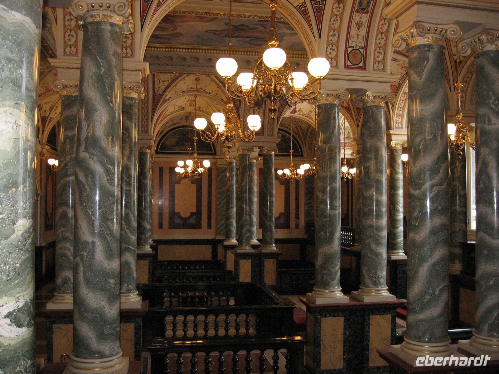 Bei der Besichtigung des Zuschauerraumes können wir einen Blick auf die gesamte Bühne nehmen, da der „Eiserne Vorhang" gerade nicht geschlossen ist. Gleichzeitig ist es interessant bei den laufenden Arbeiten auf der Bühne zu zusehen. Viele bekannte Kapellmeister hat das Orchester der Oper, die Sächsische Staatskapelle, erlebt. Unter Ihnen waren solche bekannten Namen wie Carl-Maria von Weber, Richard Wagner, Fritz Busch, Karl Böhm oder Guiseppe Sinopolie.