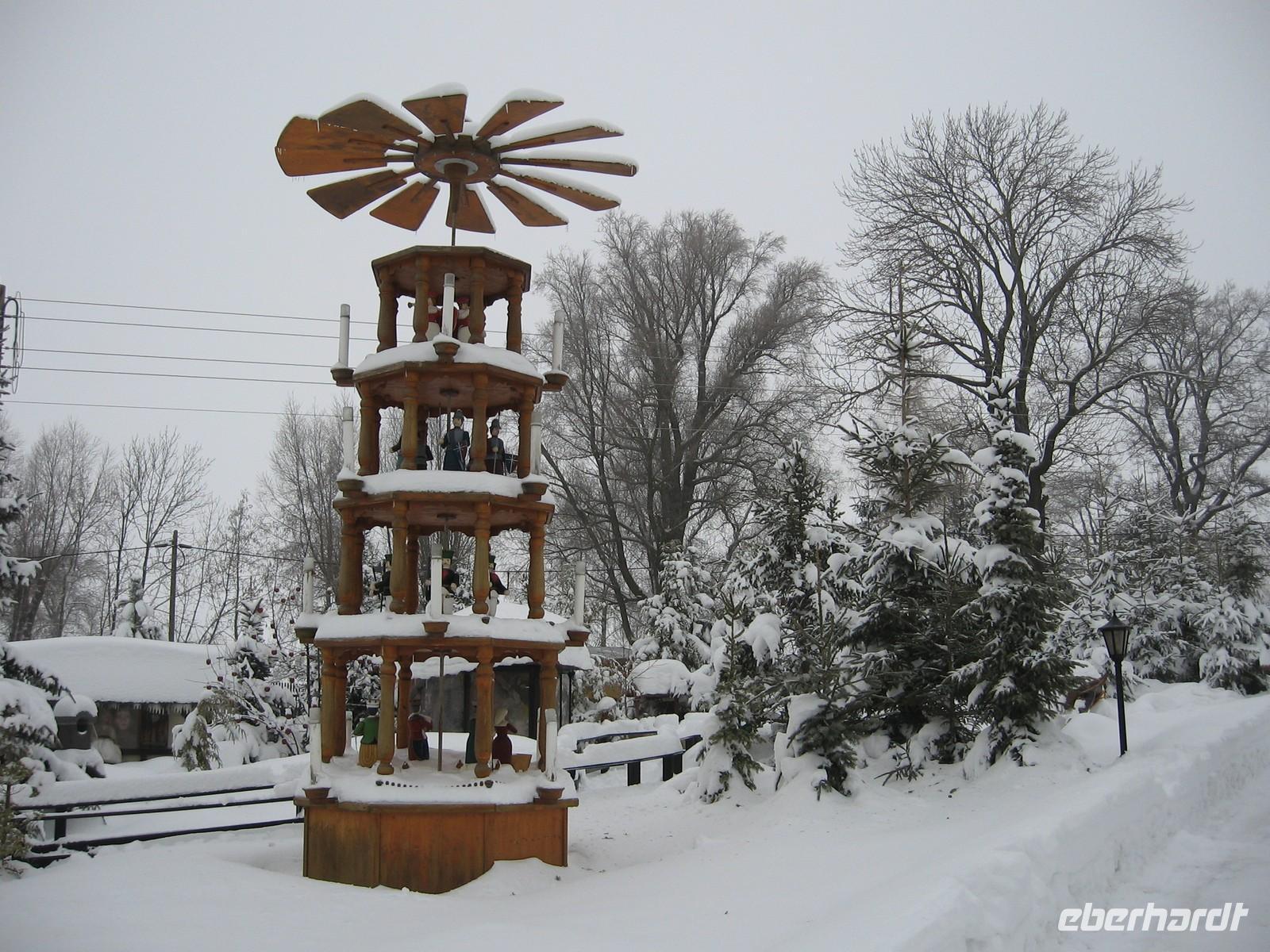 Heute ist es etwas wärmer geworden, dafür nieselt es ganz leicht. Wir fahren zunächst Richtung Stolpen, die Burg versteckt sich allerdings im Nebel und ist wegen Schnee- und Eisglätte geschlossen. Burg Stolpen war für Gräfin Cosel, eine der wichtigsten Mätressen von August dem Starken, 28 Jahre Gefängnis. Nach Augusts Tod hätte Sie die Burg verlassen können, aber Sie tat es nicht und blieb noch einmal freiwillig 21 Jahre auf der Burg. Einen Halt können wir dann in Langenwolmsdorf machen, dort gibt es das Kunsthandwerkerhaus. Ein umfangreiches Angebot an erzgebirgischer und sächsischer Volkskunst lockt zum Kauf. Und so konnte mancher nicht widerstehen und hat schon für das kommende Weihnachtsfest vorgesorgt. Um uns herum eine tief verschneite Landschaft, herrlich anzusehen.