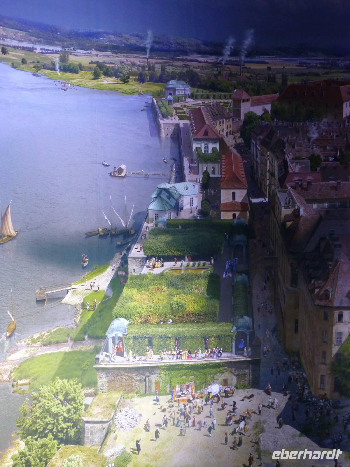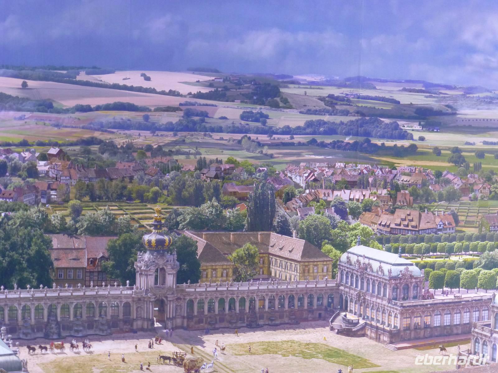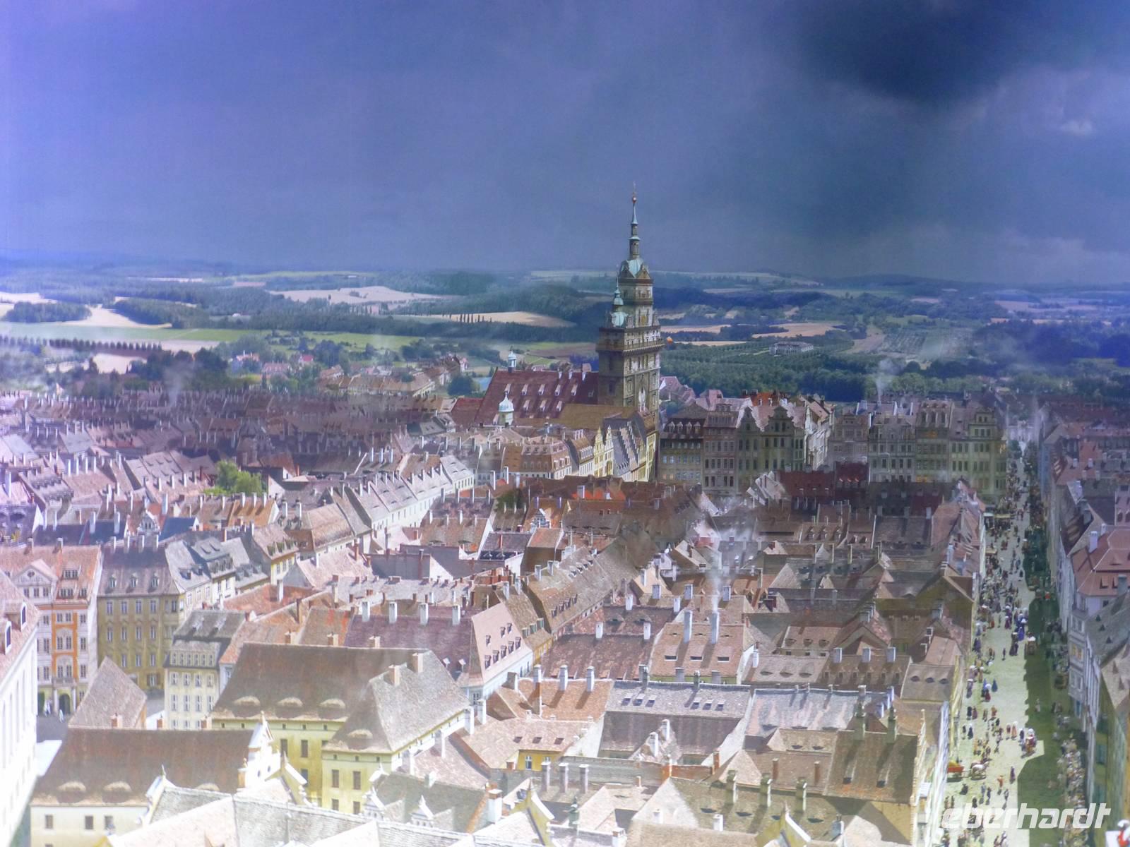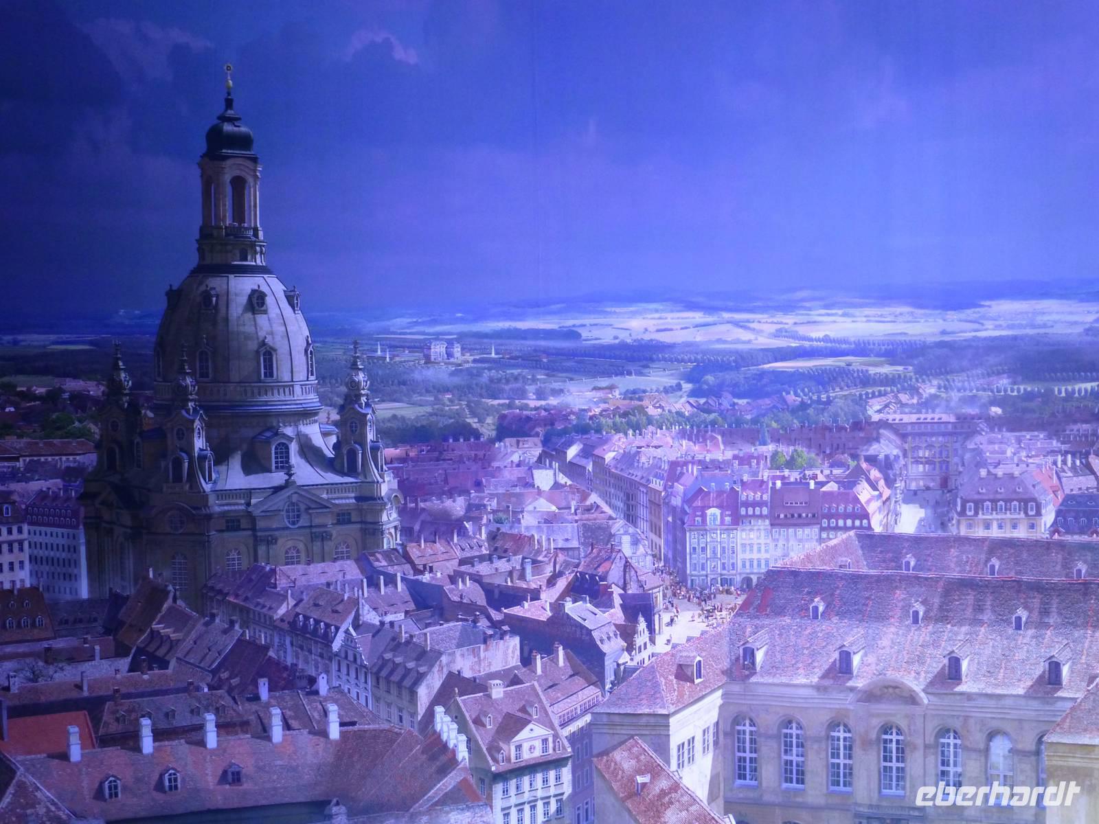 Am Vormittag erwartete ich als Reiseleiterin die Gruppe in Chemnitz. Das Wetter war schön und wir fuhren zum Hotel Bellevue. Vom Parkplatz ging es direkt an das Elbufer zum Glockenspiel Pavllion. Wir konnten nicht nur das Glockenspiel, sondern auch die Farbenpracht der blühenden Japanischen Wildkirchen genießen. Auch der Blick auf das Panorama der Altstadt, der sogenannte Canaletto Blick konnte uns begeistern. Damit hatten wir auch einen Eindruck was uns für ein Bild im Panometer erwarten wird. Kurz darauf