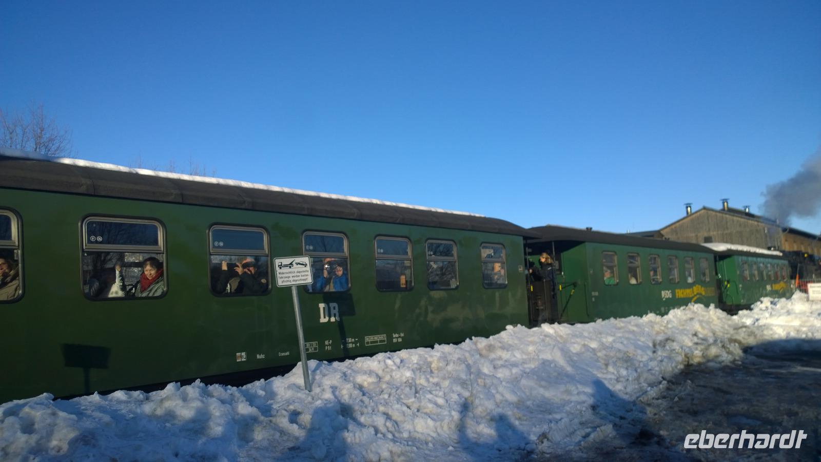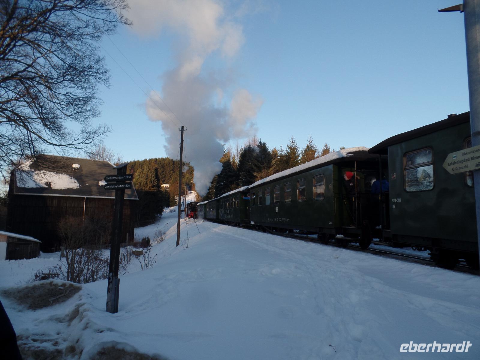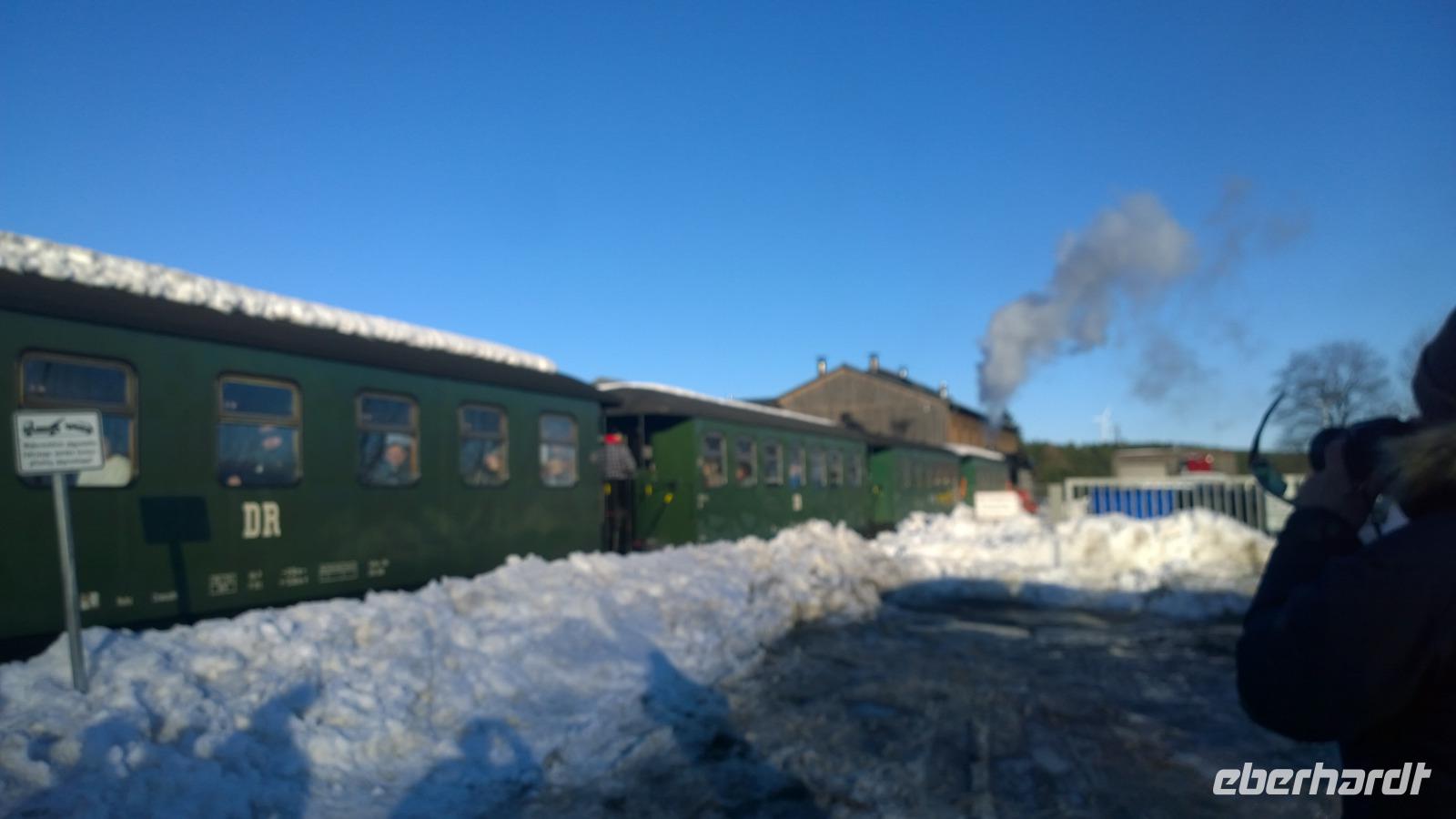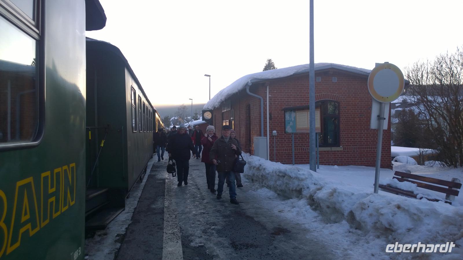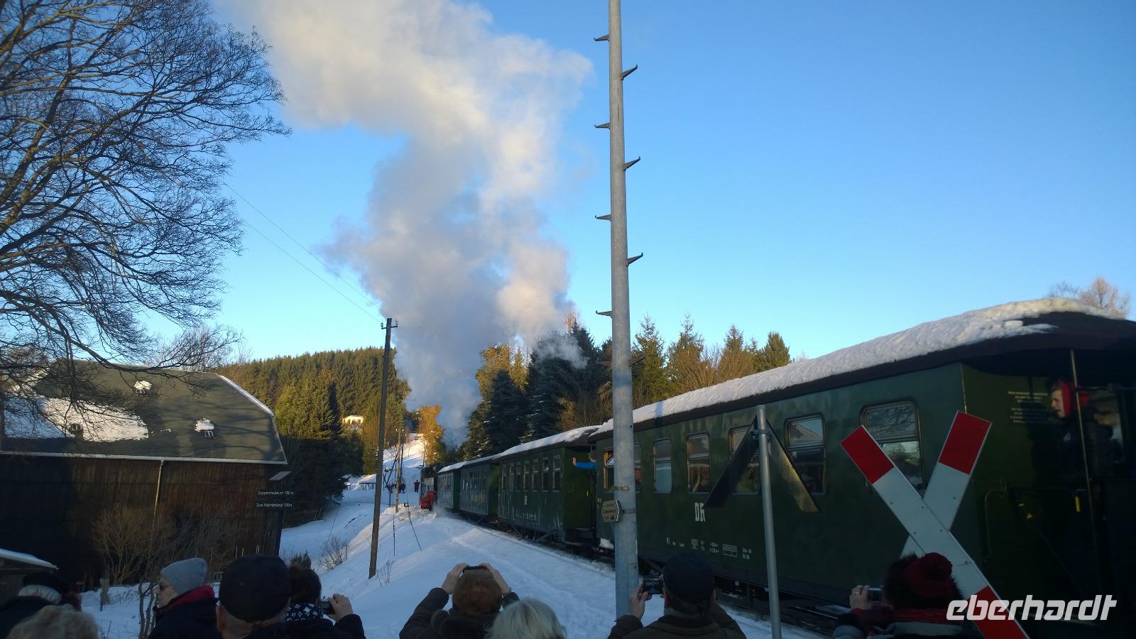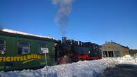 Nach dieser schönen Zeit auf dem Berg brachte uns Peter zum Bahnhof im Ort und wir fuhren mit der dampfenden Fichtelbergbahn im für uns reservierten Abteil durchs Erzgebirge bis Neudorf. Die schöne Fahrt durch kleine Dörfer und verschneite Wälder hat uns gut gefallen. In Neudorf wartete Peter bereits auf uns und überraschte uns mit einem kleinen Besuch in der KNOX Räuchermännlstube "Zum Weihrichkarzl". Dort konnte man ein paar schöne Mitbringsel mitnehmen oder einfach nur den schönen Hof genießen. Am Bus hatte Peter Glühwein und Pfefferkuchen vorbereitet und wir ließen es uns gut schmecken. Nach diesem sehr erlebnisreichen Tag in der verschneiten Landschaft fuhren wir zurück in usner Hotel. Am Abend machen wir es uns bei einem 3-Gang-Menü in der Gaststube gemütlich. Der Abend klang lustig in einer schönen Runde aus...