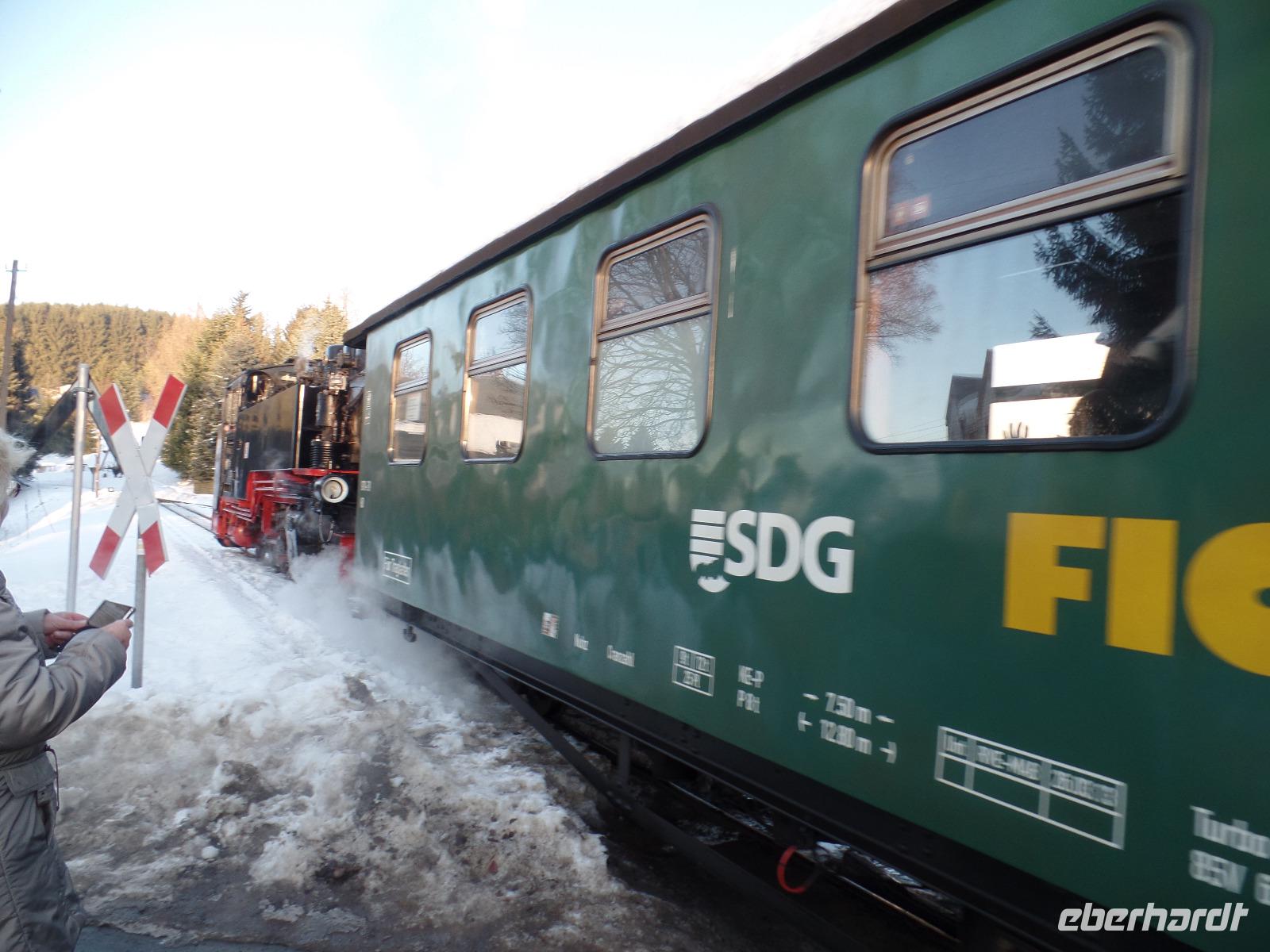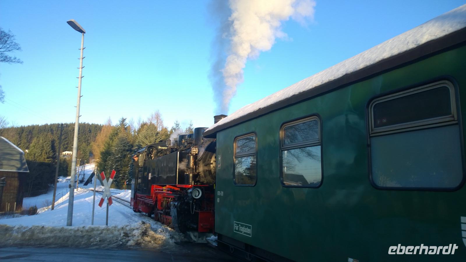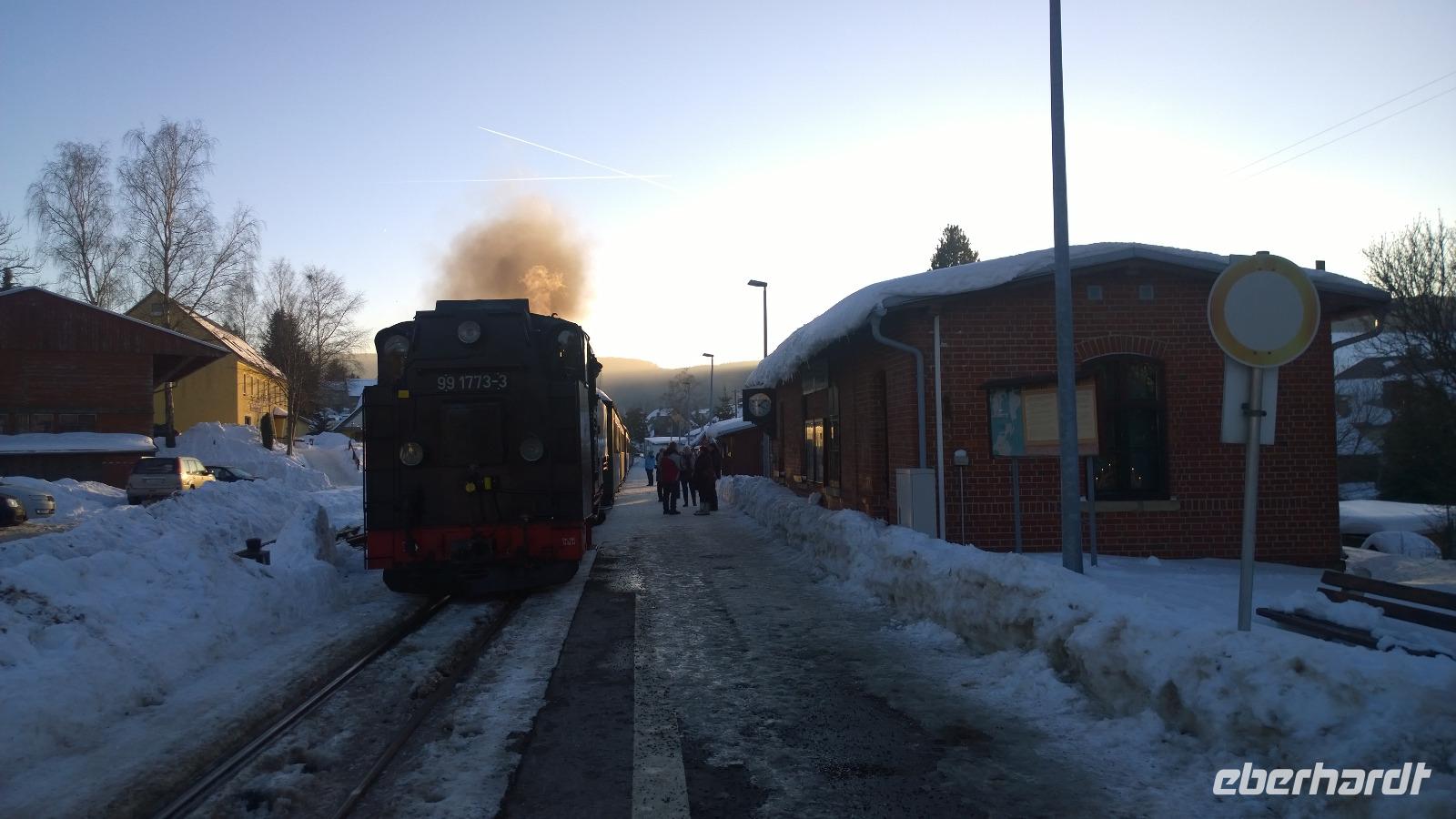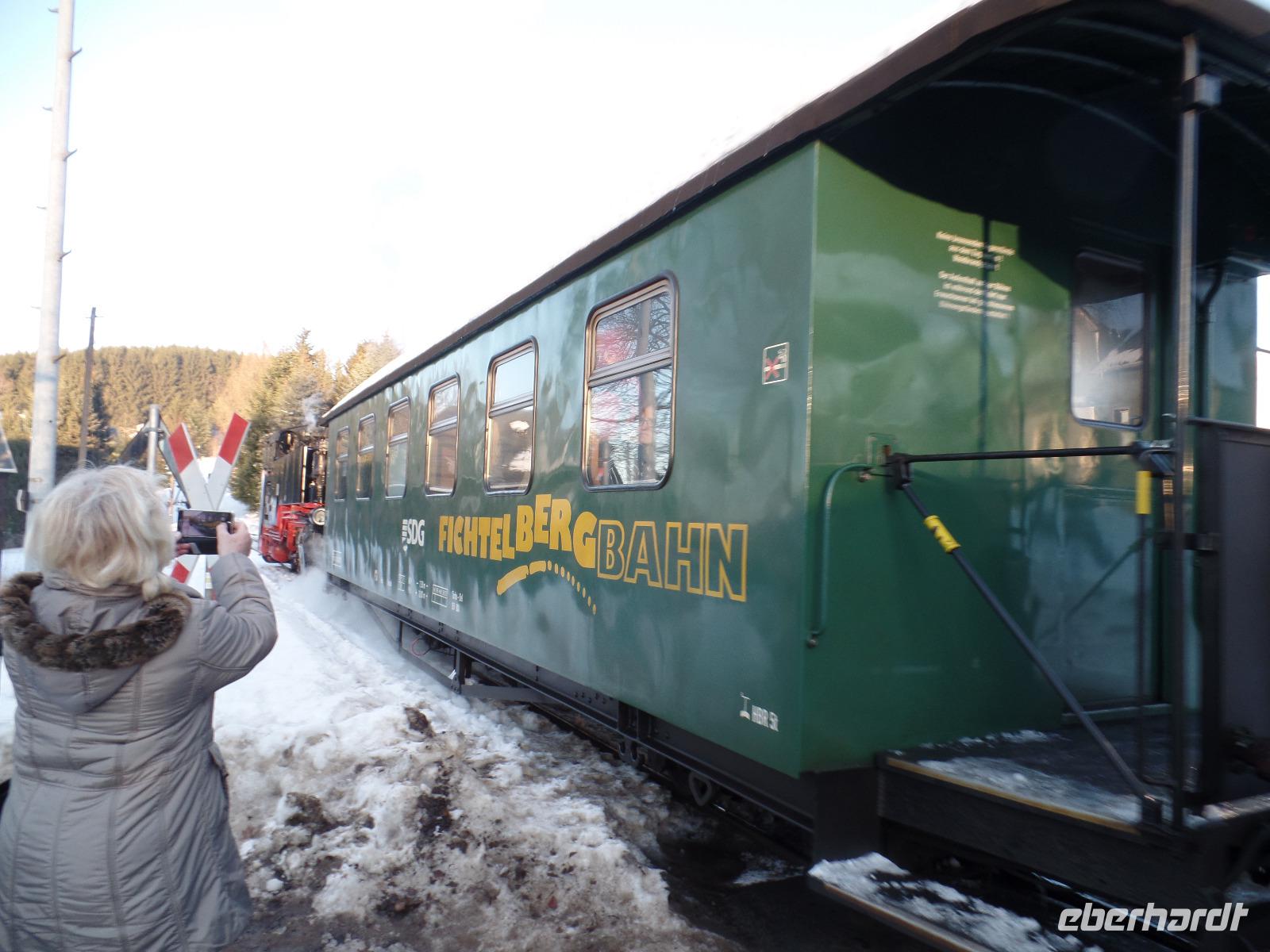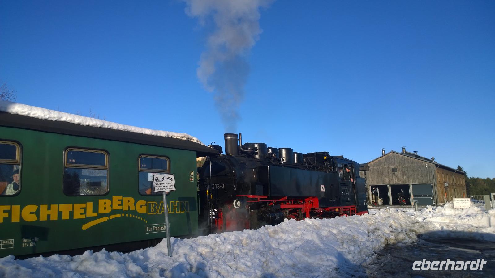 Nach dieser schönen Zeit auf dem Berg brachte uns Peter zum Bahnhof im Ort und wir fuhren mit der dampfenden Fichtelbergbahn im für uns reservierten Abteil durchs Erzgebirge bis Neudorf. Die schöne Fahrt durch kleine Dörfer und verschneite Wälder hat uns gut gefallen. In Neudorf wartete Peter bereits auf uns und überraschte uns mit einem kleinen Besuch in der KNOX Räuchermännlstube "Zum Weihrichkarzl". Dort konnte man ein paar schöne Mitbringsel mitnehmen oder einfach nur den schönen Hof genießen. Am Bus hatte Peter Glühwein und Pfefferkuchen vorbereitet und wir ließen es uns gut schmecken. Nach diesem sehr erlebnisreichen Tag in der verschneiten Landschaft fuhren wir zurück in usner Hotel. Am Abend machen wir es uns bei einem 3-Gang-Menü in der Gaststube gemütlich. Der Abend klang lustig in einer schönen Runde aus...