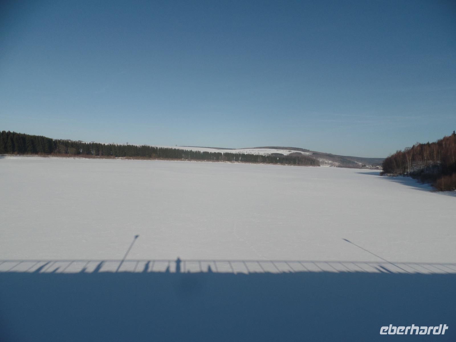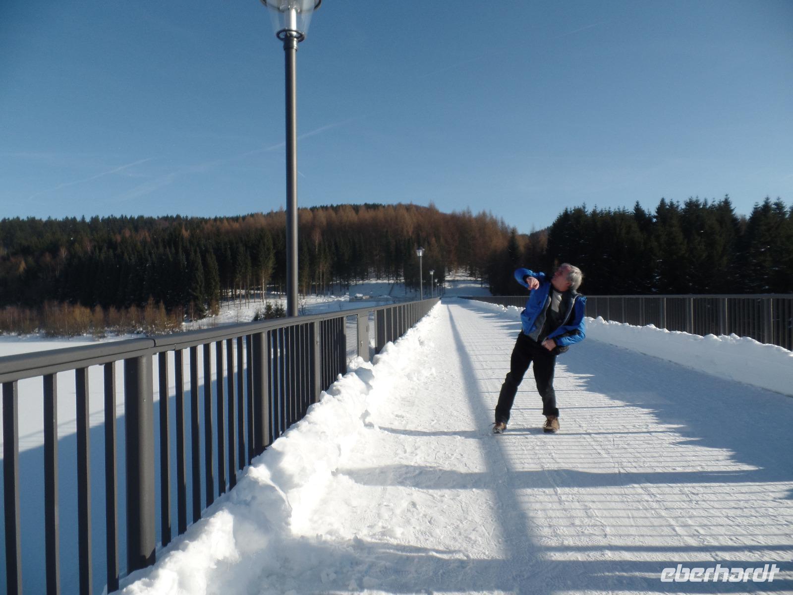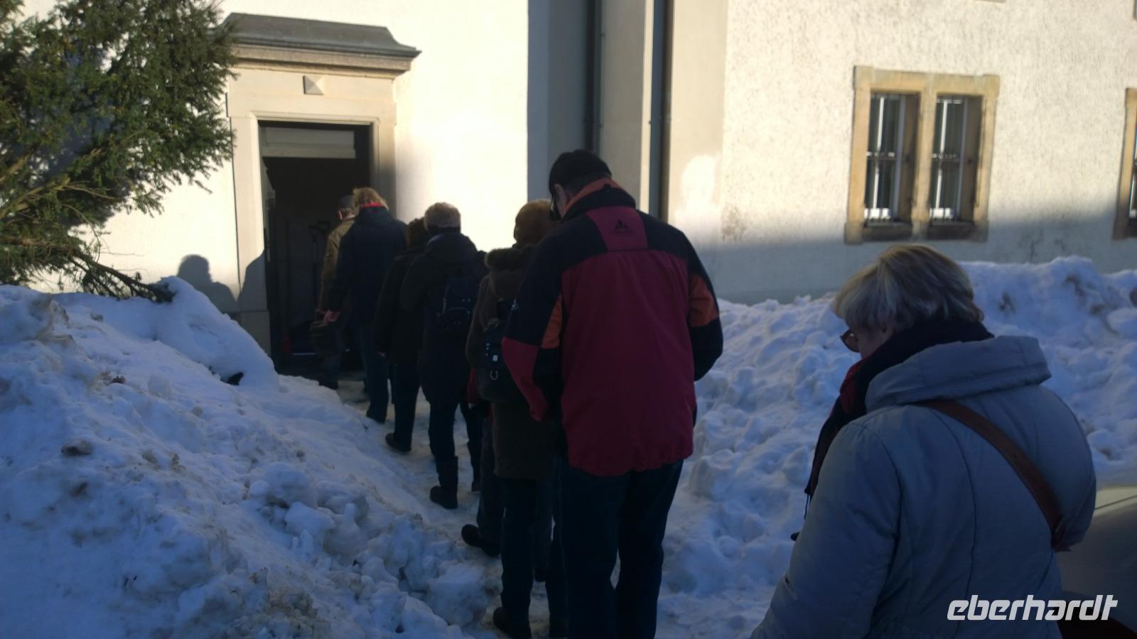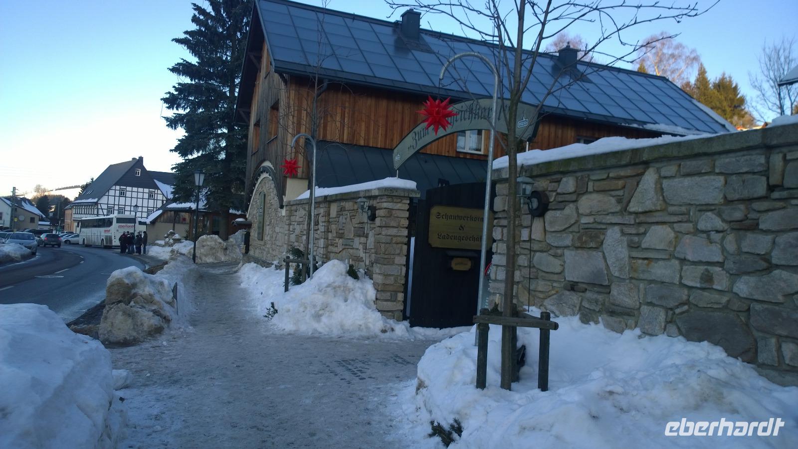 Nach dem schmackhaften Frühstück begrüßte uns noch einmal Herr Güttler und wollte uns etwas besonderes zeigen: er hatte den Schlüssel zur Kirche bei sich! So gingen wir rüber zur Kirche und bekamen die Möglichkeit, bei dem tollen Wetter mit bester Aussicht auf den Kirchturm zu steigen! Von oben offenbarte sich uns eine wunderschöne Sicht auf das umliegende Erzgebirge - ein schöne Start in den Tag! Wieder unten angekommen fuhren wir heute nach Rechenberg-Bienenmühle. Die Gemeinde ist ebenfalls bekannt für ihr Ski- und Wintersportangebot - aber Sie hat noch viel mehr zu bieten. Und so besichtigten wir vor dem Mittagessen die außergewöhnliche Rechenberger Privatbrauerei bei einer sehr lebhaften und unterhaltsamen Führung. Nachdem wir viel gelacht und gelernt hatten durfte eine Verkostung natürlich nicht fehlen. Mit einem Bier und einer warmen Semmel in der Hand machen wir es uns im alten Schalander, dem ehemaligen Pausenraum der Arbeiter zum Mittagessen mit Schwarzbierbraten gemütlich. Es war ein sehr geselliges Mittagessen. Nach diesem Erlebnis fuhren wir weiter in die Spielzeugstadt Seiffen. Unterwegs hielten wir an der Talsperre Rauschenbach, wo wir den Blick von der Staumauer auf den zugefrorenen Stausee und die schneebedeckten Bäume am Ufer genossen - traumhaft.