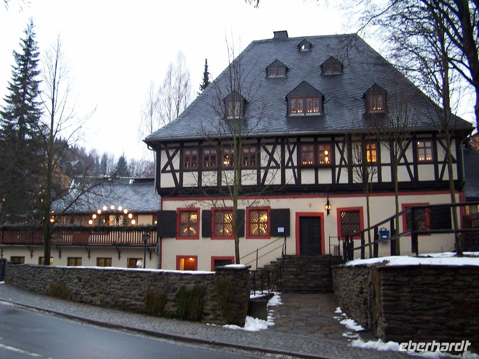 Gleich nebenan befindet sich die Bergkirche. In der Kirche werden 26 geschnitzte Figuren der Annaberger Geschichte ausgestellt. Diese Figurengruppe nennt man den Annaberger Krippenweg und an ihm wird die Verbindung zwischen Bergbau und Glauben dargestellt. Als kleine Zugabe fuhren vom Annaberger Weihnachtsmarkt in den Ortsteil Frohnau zum Frohnauer Hammer. Dieses ehemalige Hammerwerk ist heute ein historisches Museum und bei einer Führung wurde die Geschichte wieder lebendig. Anschließend ging die Fahrt ins Pöhlwassertal zu unserem Landhotel in Rittersgrün. Hier wurden wir bereits erwartet und nach dem Zimmerbezug mit einem Vuglbeerschnaps auf das herzlichste begrüßt.