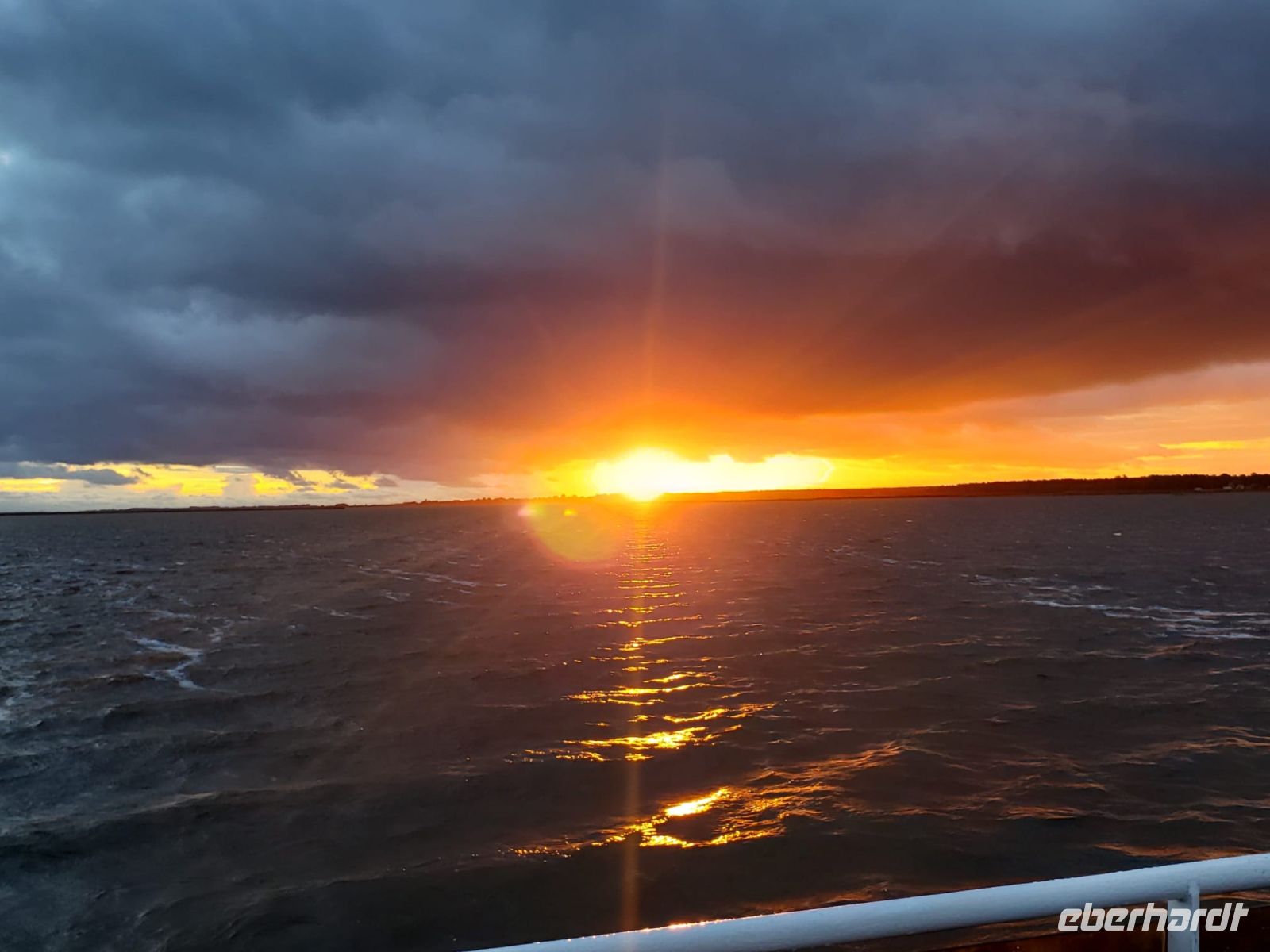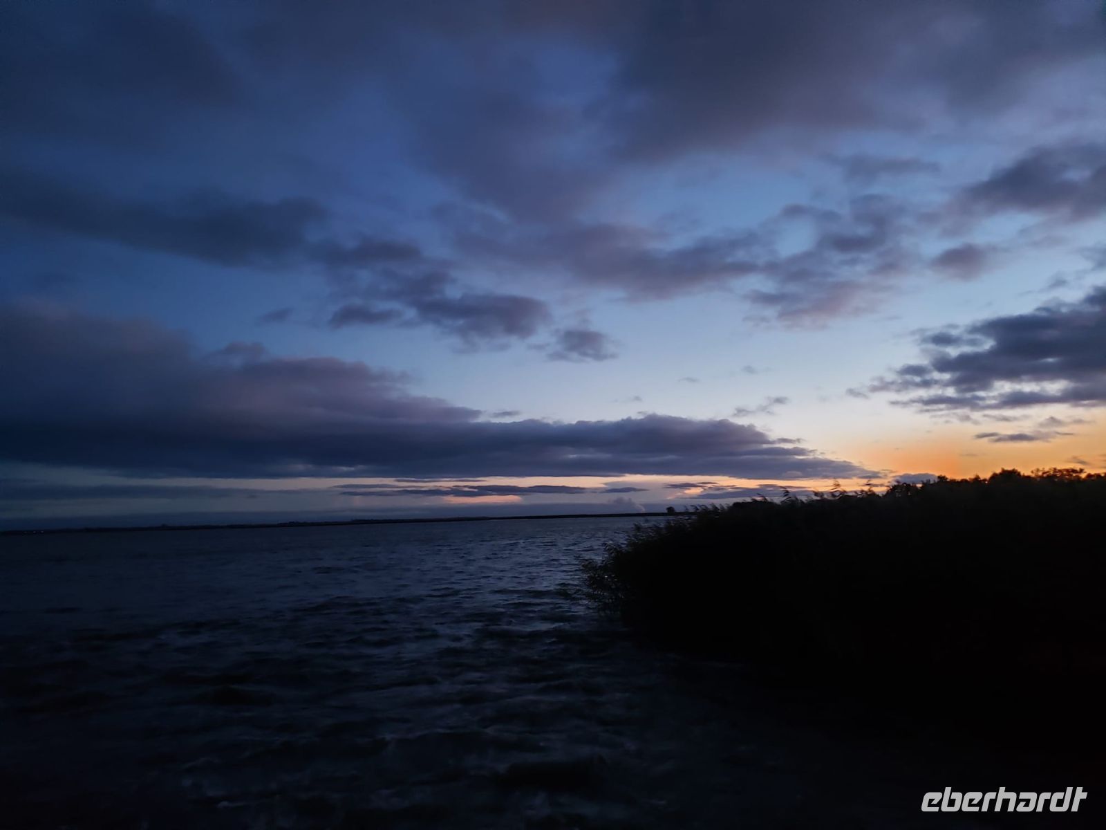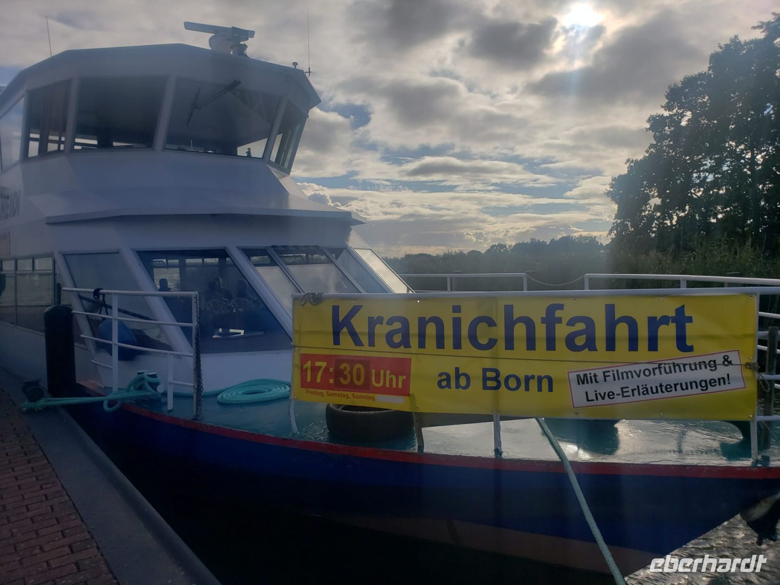Am Abend geht es für einen Teil der Gruppe aufs Wasser. Wir haben uns für eine Kranichtour auf dem Bodden entschieden, es ist ja schließlich Herbst. Viele Tausend Kraniche machen hier halt, um sich für den Weiterflug gen Süden zu stärken. Wir sehen einige Schwärme am Himmel, wenn auch nur aus der Ferne.