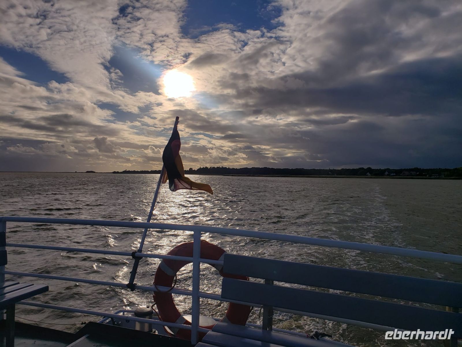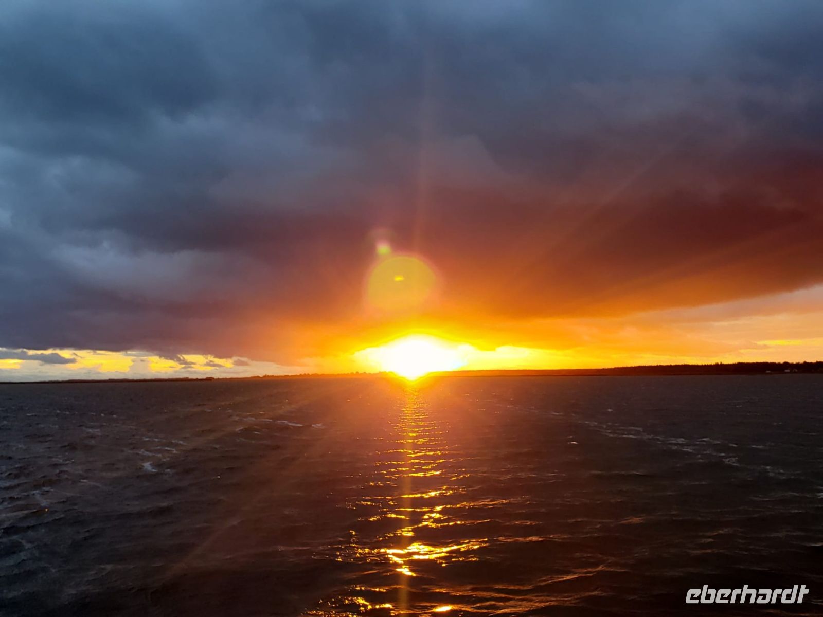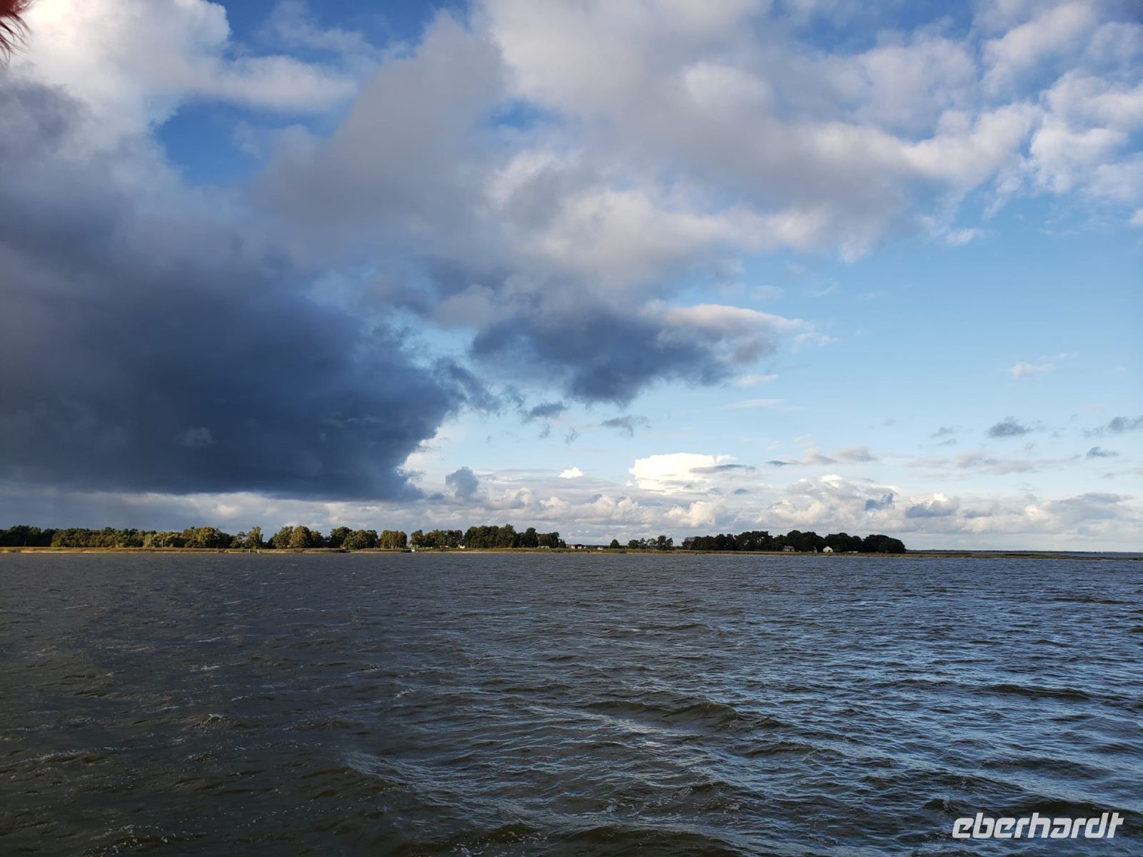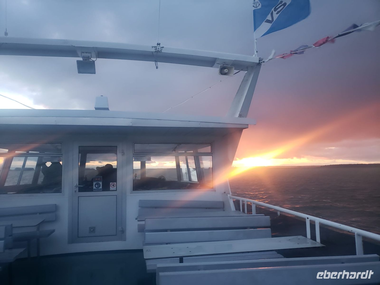 Am Abend geht es für einen Teil der Gruppe aufs Wasser. Wir haben uns für eine Kranichtour auf dem Bodden entschieden, es ist ja schließlich Herbst. Viele Tausend Kraniche machen hier halt, um sich für den Weiterflug gen Süden zu stärken. Wir sehen einige Schwärme am Himmel, wenn auch nur aus der Ferne.