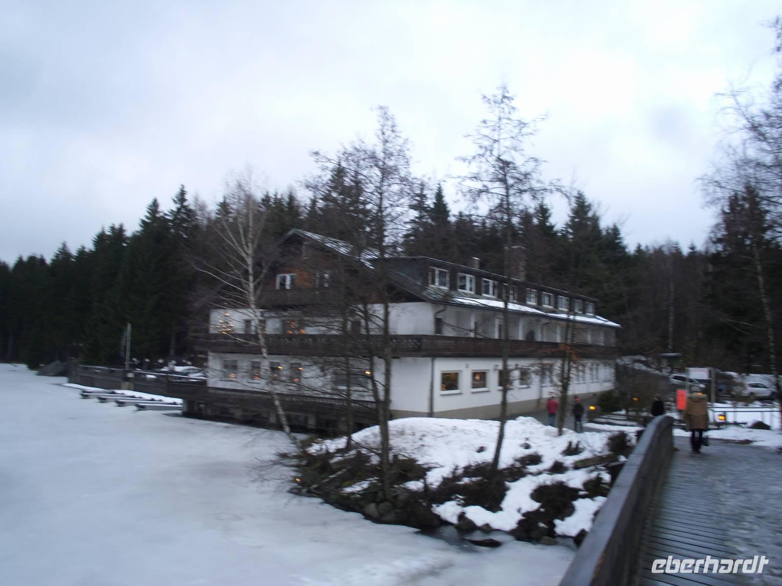 Am vorletzten Tag des Jahres statteten wir zunächst einmal der Stadt Bayreuth einen Besuch ab. Erstes Ziel war das Festspielhaus auf dem Grünen Hügel, welches zu den herausragenden Sehenswürdigkeiten der Stadt gehört. Während einer etwa 45-minütigen Führung im Festspielhaus erfuhren wir interessante Details über das Leben Richard Wagners und das Gebäude schlechthin. Einzigartig in Architektur und Akustik, zählt es zu den größten Opernbühnen der Welt. 1872 ließ Richard Wagner das einmalige Gebäude am nördlichen Stadtrand Bayreuths erbauen, um sich an einem Ort ohne andere Ablenkung in voller Konzentration allein den Darbietungen seiner Werke widmen zu können. Bereits 1876 fanden hier die ersten Festspiele mit der erstmals vollständigen Aufführung des "Ring des Nibelungen" statt. Besonderes Merkmal des Festspielhauses ist, neben seiner einzigartigen Architektur, die unvergleichliche und weltbekannte Akustik. Sie beruht vor allem auf dem gänzlich mit Holz verkleideten Innenraum und darauf, dass es keine Logen an den Seiten des Zuschauerraums gibt. Außerdem sind die Sitze der Zuschauerreihen ungepolstert, so dass wenig Schall geschluckt wird und sich der Klang im ganzen Raum verteilen kann. Weiter ging es nun in die Innenstadt, wo wir einen kleinen Stadtspaziergang unternahmen - wir sahen unter anderem das Alte Schloss und das Markgräfliche Opernhaus. Am Nachmittag stand nun noch eine gemütliche Fichtelgebirgs-Rundfahrt auf dem Programm. Leider hatte der Wettergott nur teilweise ein Einsehen mit uns und der Ochsenkopf, die mit 1.024 Metern Höhe zweithöchste Erhebung des Fichtelgebirges, hüllte sich etwas in Wolken. Doch den "harten Kern" (immerhin über die Hälfte unserer Gruppe!) hielt nichts davon ab, dennoch mit dem Sessellift hinauf zu fahren. Diese Gäste wurden zumindest kurzzeitig mit einem herrlichen Panoramablick auf die Umgebung belohnt. Nach diesem Aufenthalt in Bischofsgrün führte uns unsere Route nun weiter über Weißenstadt, Wunsiedel und Fichtelberg zum Fichtelsee. Alte Beschreibungen des Fichtelsees berichten von einem tiefen Gebirgssee, der mit seinen Wellen bis an den Ochsenkopf stößt. Nach heutigen Erkenntnissen hat es einen solchen See nie gegeben. Vielmehr hat seine Entstehung mit dem Bergbau zu tun. 1650 wurde im Hochmoor aus nach Fichtelberg ein Graben gezogen. Er sollte neben der Fichtelnaab zusätzliche Wasserkraft zum Antrieb der Hämmer liefern. Mit fortschreitender Zeit trocknete das Moor jedoch immer mehr aus. Da das Wasser nun knapp wurde, errichtete man daher 1739 einen künstlichen Stauweiher - den Fichtelsee! Nach einem kurzen Aufenthalt am Fichtelsee ging es nun über Warmensteinach zurück. Nach dem Abendessen stand heute noch eine Fackelwanderung inklusive Feuerzangenbowle durch den Ort Waischenfeld an - sehr romantisch!