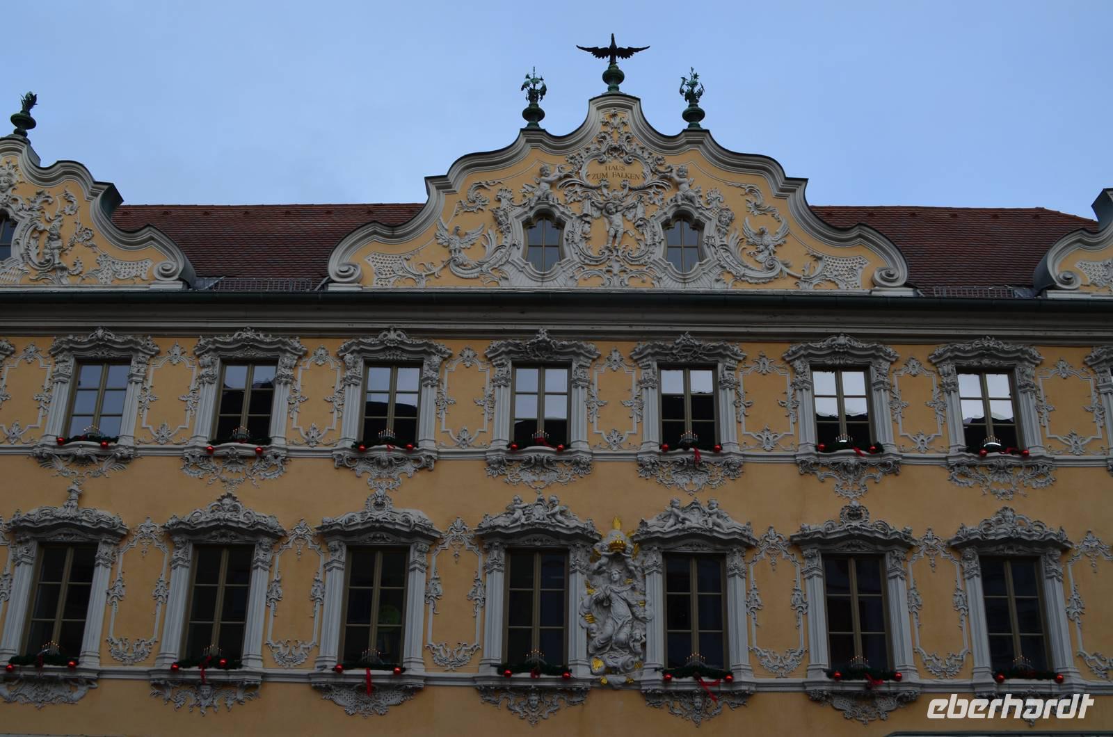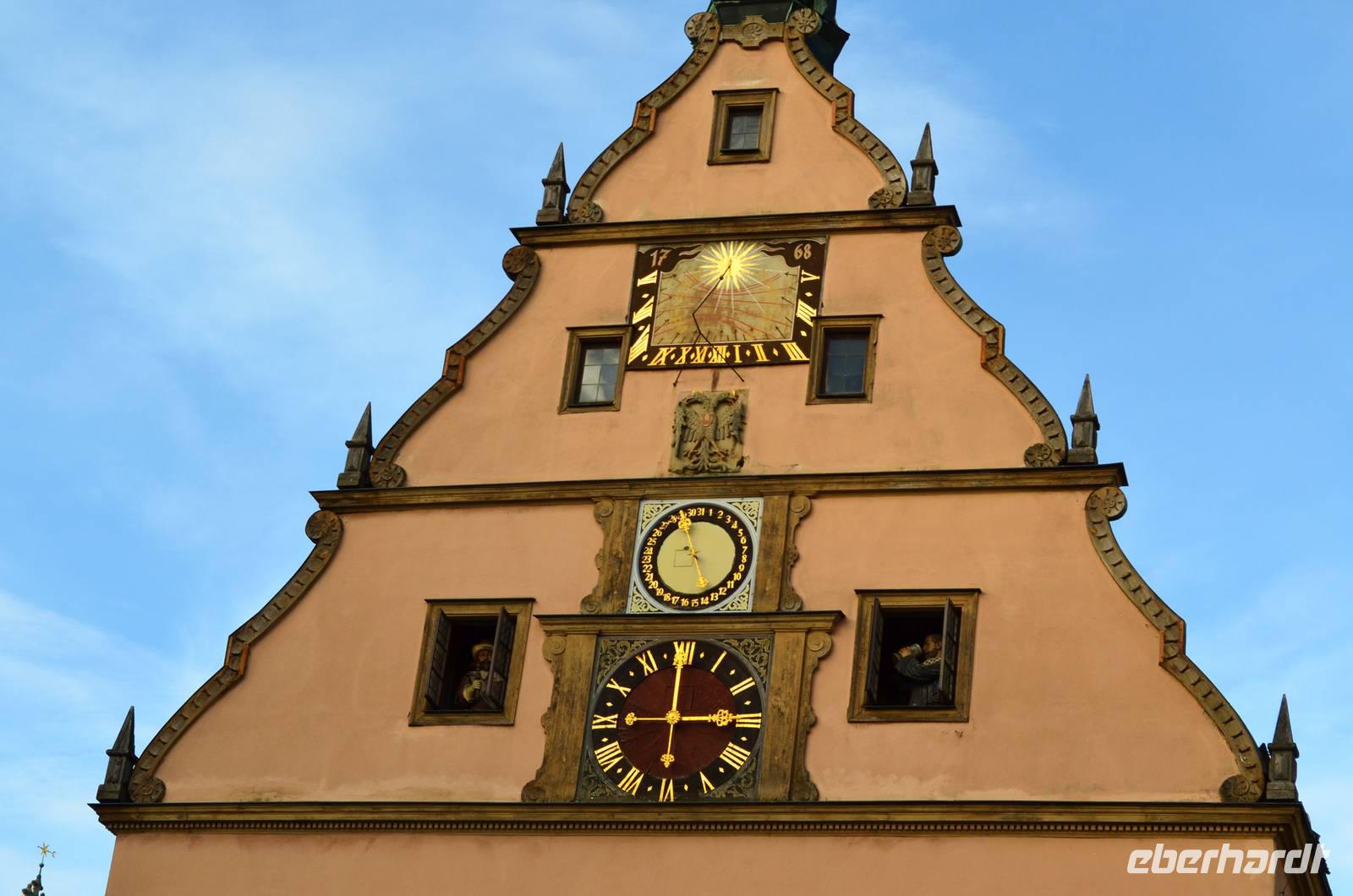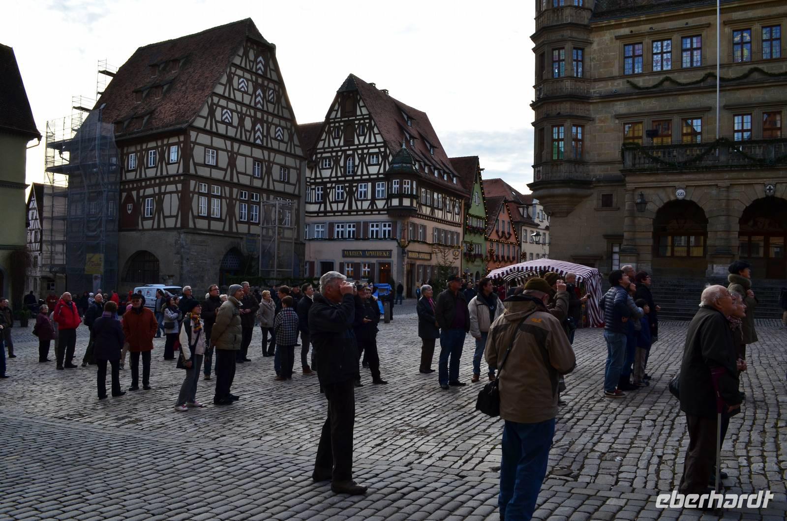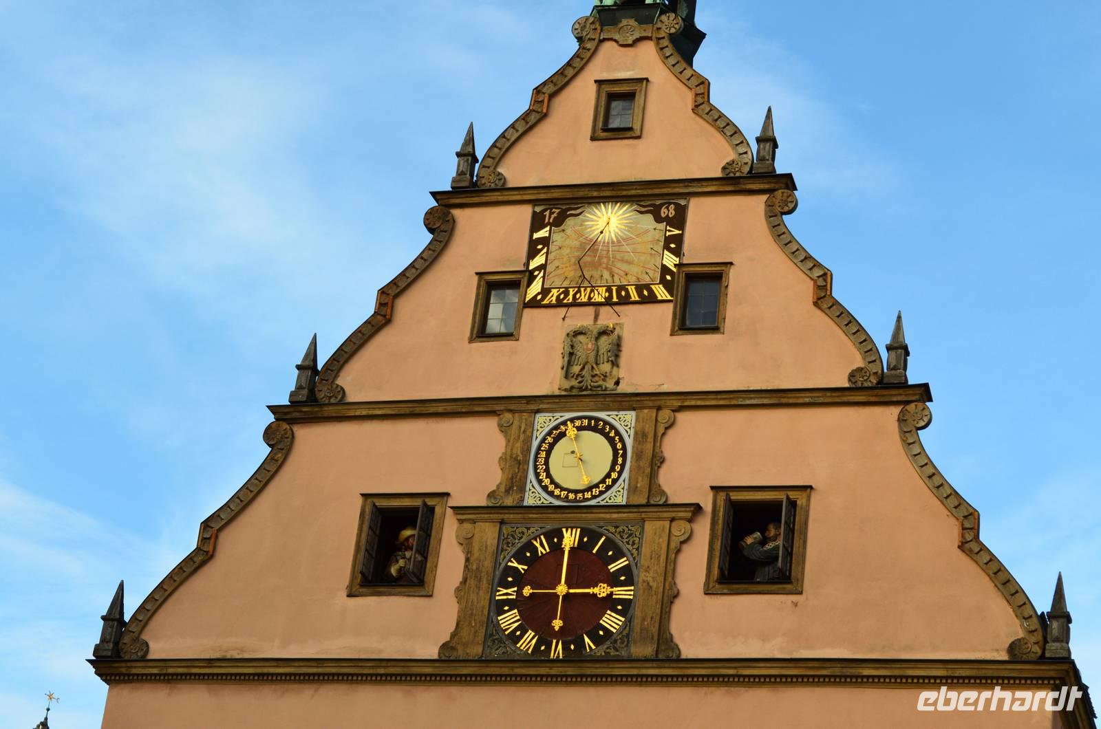Von der Spitalbastei im Süden, dem Zipfel, spazierten wir zum hübschen Hegereiterhaus im Spitalhof, dann durch den Siebersturm zum Plönlein, vorbei am Topplerhaus und am Kriminalmuseum zum Baumeisterhaus, dem Bürgerhaus mit den sieben Todsünden und den sieben Tugenden. Von hier sind es nur ein paar Schritte zum Marktplatz der Stadt. Der Brunnen des heiligen Georg, das Fleisch- und Tanzhaus, das Rathaus, die Ratstrinkstube mit ihrer Mechanischen Uhr beeindruckten uns hier. Alle Gäste wurden mit Stadtplänen ausgestattet und genau 15:00 Uhr besichtigten wir an der Turmuhr der Ratsstube den „Meistertrunk", mit dem Bürgermeister Nusch seine Stadt vor der Plünderung durch die kaiserlichen Truppen mit General Tilly bewahrte.