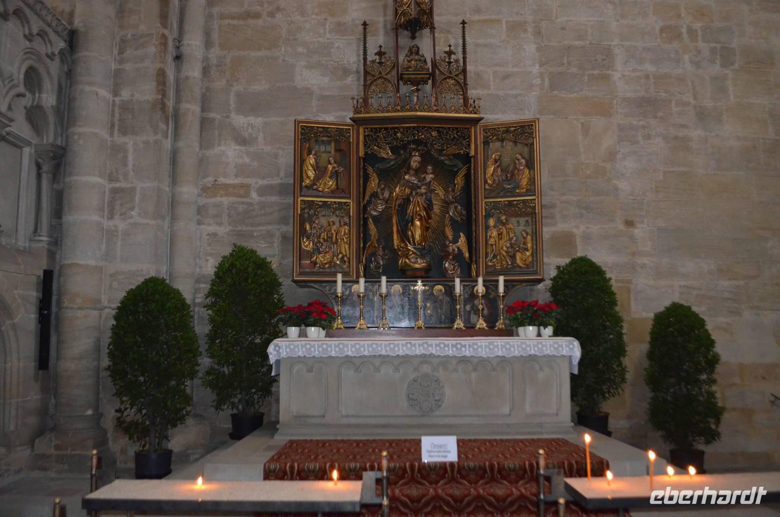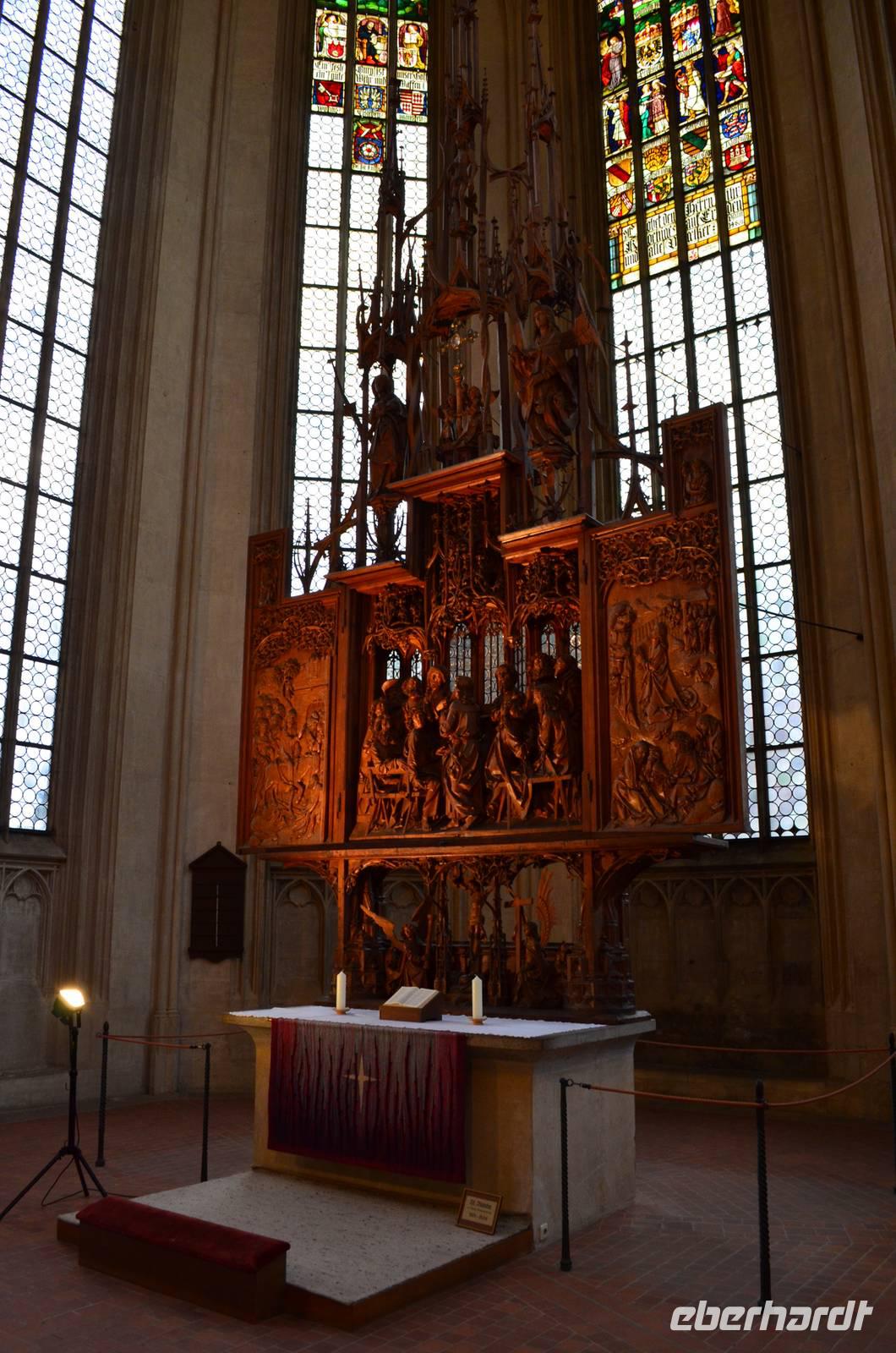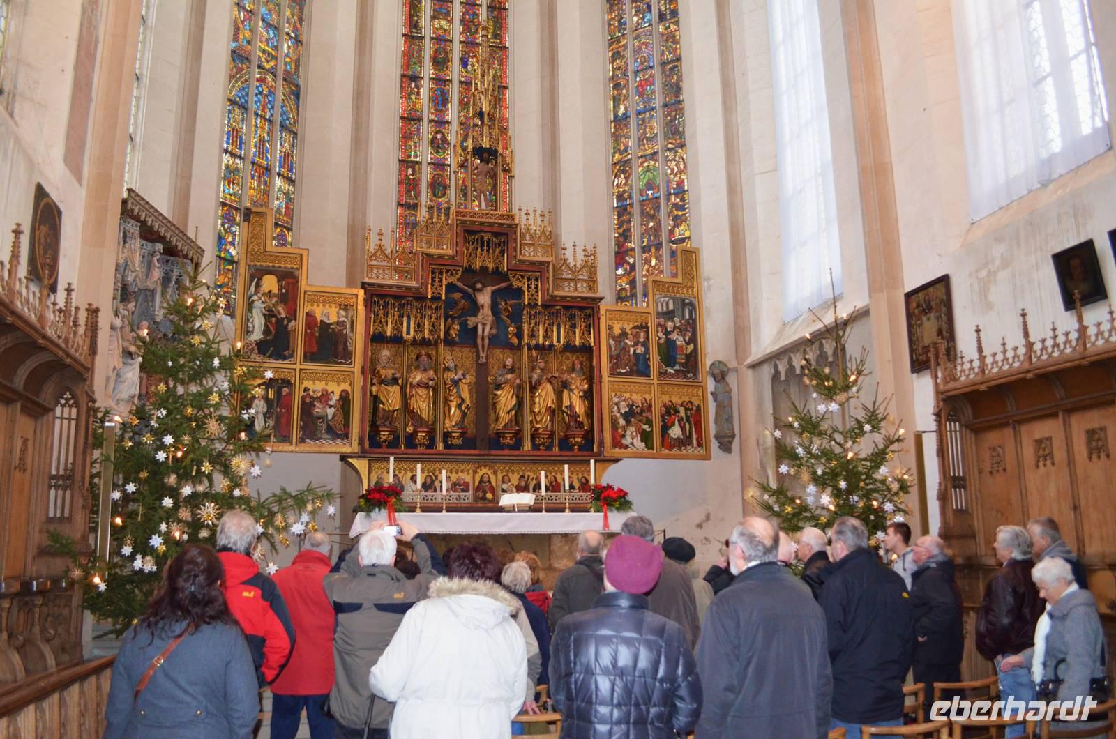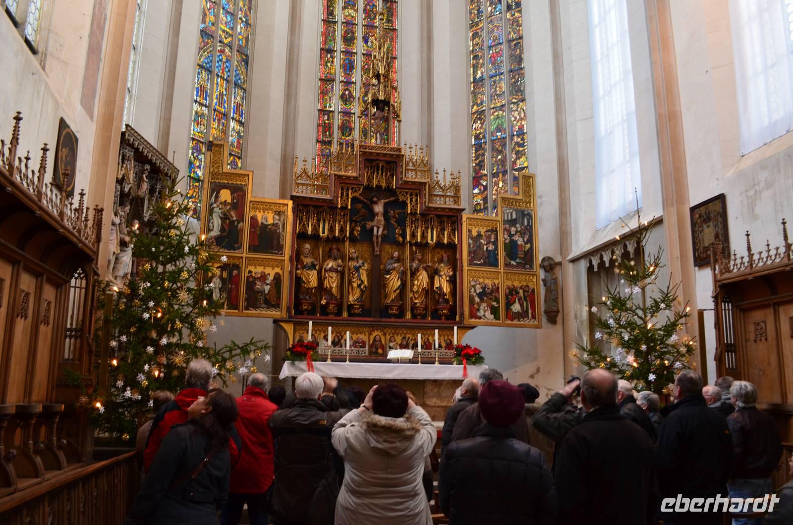 Der weitere gemeinsame Fußweg führte uns zur St.-Jacobs-Kirche, wo wir als eberhardt-Wow diese schöne Kirche besichtigten. Ihren weltberühmten Altäre, den „Zwölfbotenaltar" von schwäbischen Meistern und den „Heilig-Blut-Altar" von Tilman Riemenschneider erklärte uns Herr Müller, die freundliche Kirchenführer.