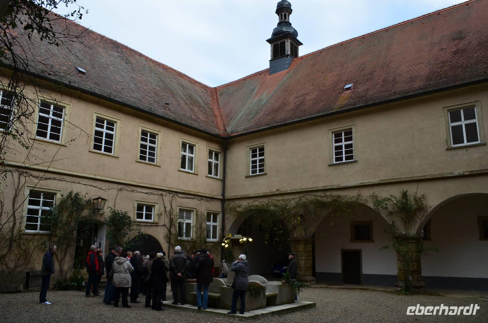 Die anschließende Weiterfahrt brachte uns in die historische Stadt Volkach. Vom Oberen Stadttor spazierten wir durch die Stadt, vorbei an den sehenswerten Gebäuden der Altstadt zum Markt mit seinem Renaissance-Rathaus, weiter durch die Promenaden am Ufer der Volkach. Von hier aus sahen wir ebenfalls die Flussschleife und die Kirche Maria am Weinberg, deren Riemenscheider-Madonna im Winter leider nicht besichtigt werden kann.