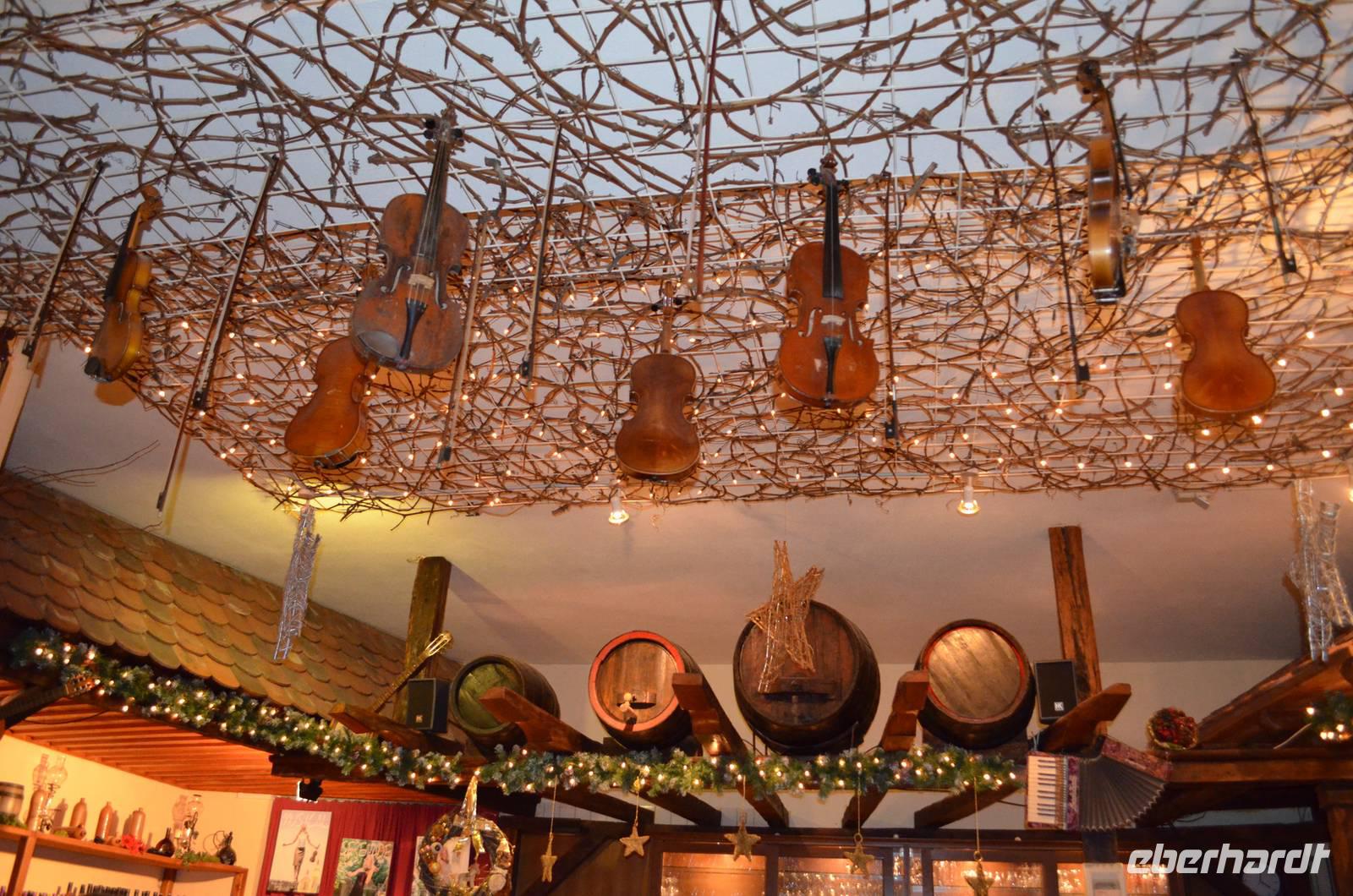 Familie Runge empfing uns herzlich unter ihrem „Himmel voller Geigen" und wir nahmen an den gedeckten Tischen Platz. Dann begann die Musikalische Weinprobe mit Herrn Gerhard Runge, dem „Singenden Winzer". Sechs Weinproben und ein deftiger Brotzeitteller haben allen sehr gut geschmeckt und das Unterhaltungsprogramm mit den Liedern und Texten von Runge hat auch gefallen. Es wurde zünftig Frankenwein eingekauft und fröhlich erfolgte die Rückfahrt zu unserm Hotel nach Werneck, wo auch dieser Tag beim gemeinsamen Abendessen mit drei Gängen harmonisch endete.