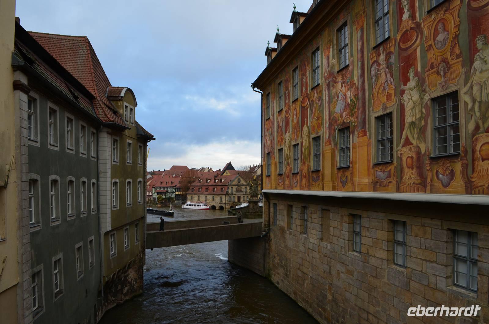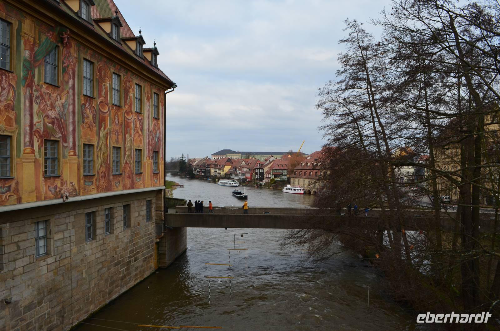 Nahe der alten Bischofsmühle an der Regnitz und der Schranne stiegen wir an einer Stadtbushaltestelle aus. Wir spazierten über die Brücken der Regnitz auf romantischen Wegen durch die Altstadt, rund um das historische Rathaus. Dann ging es weiter zur Dominikanerstrasse und zur Rauchbierschänke „Schlenkerla", wo wir uns gemeinsam für 12:00 Uhr verabredeten.