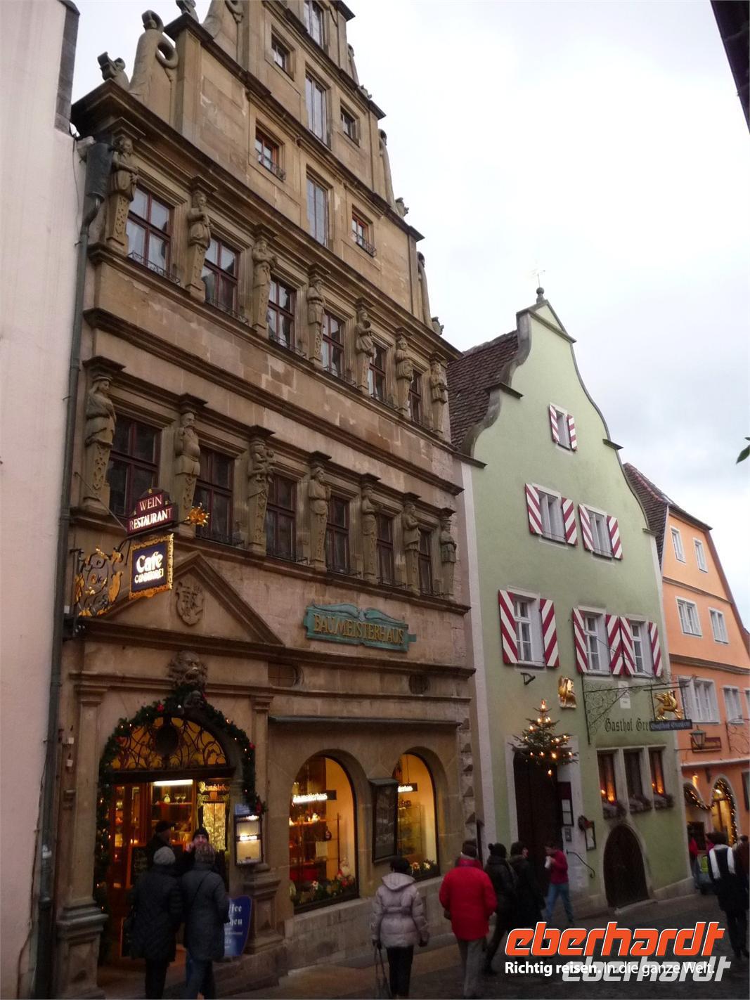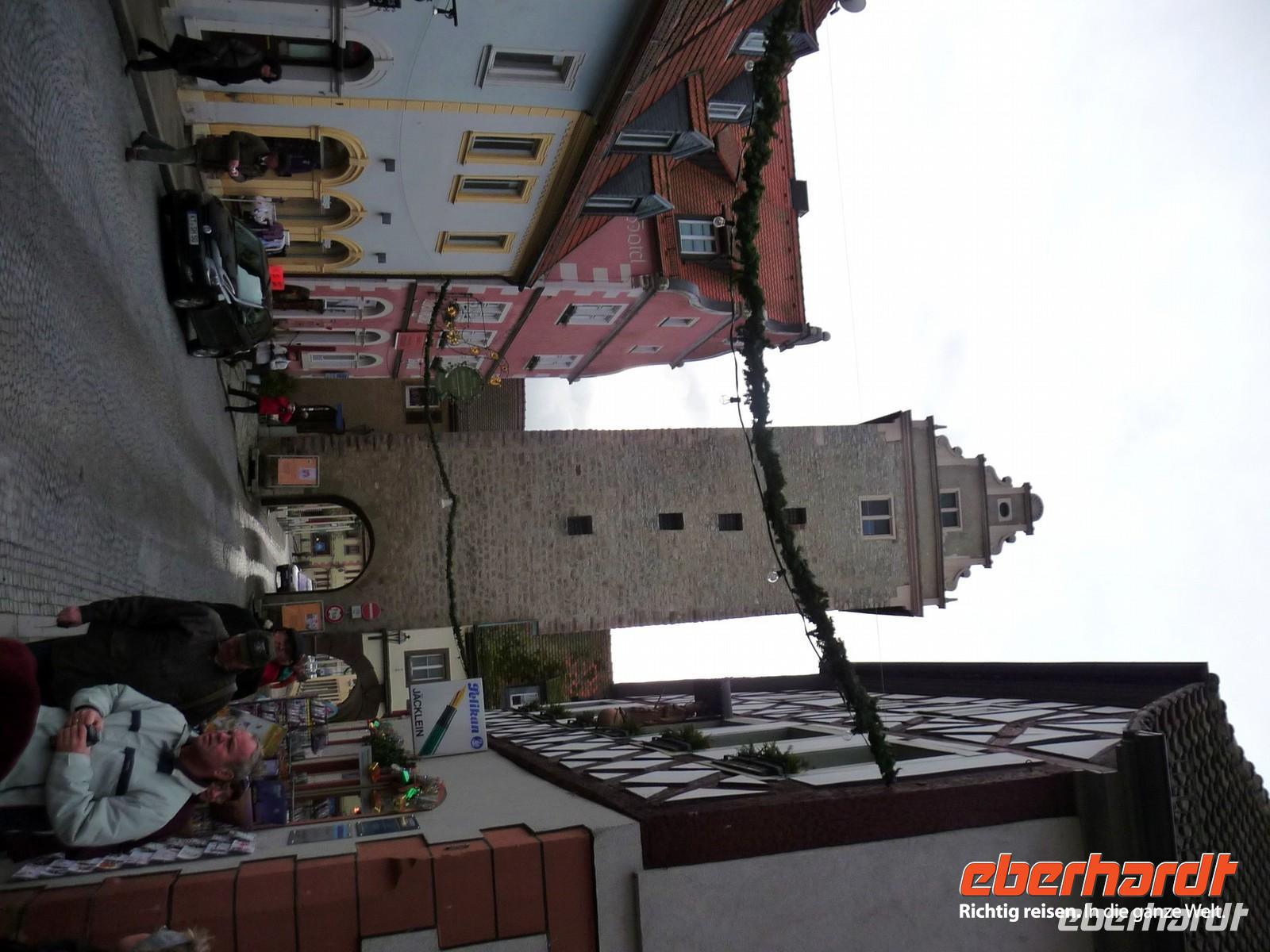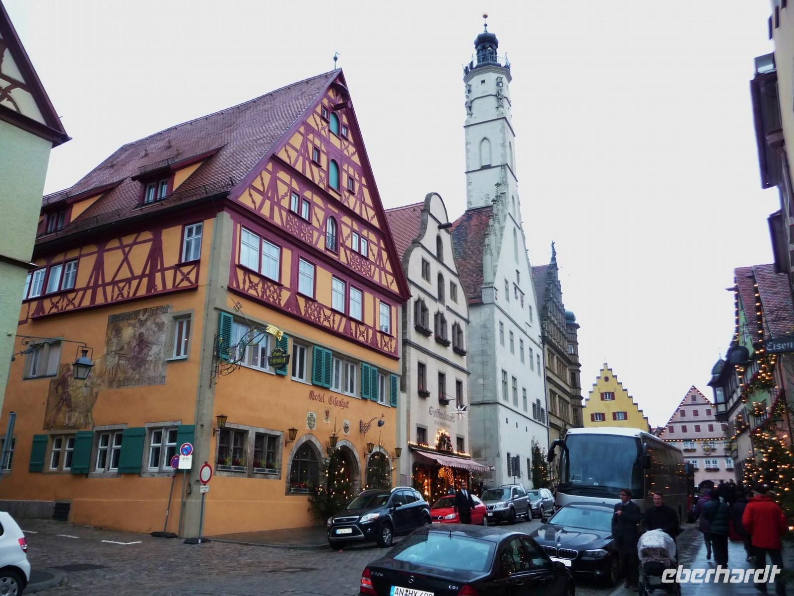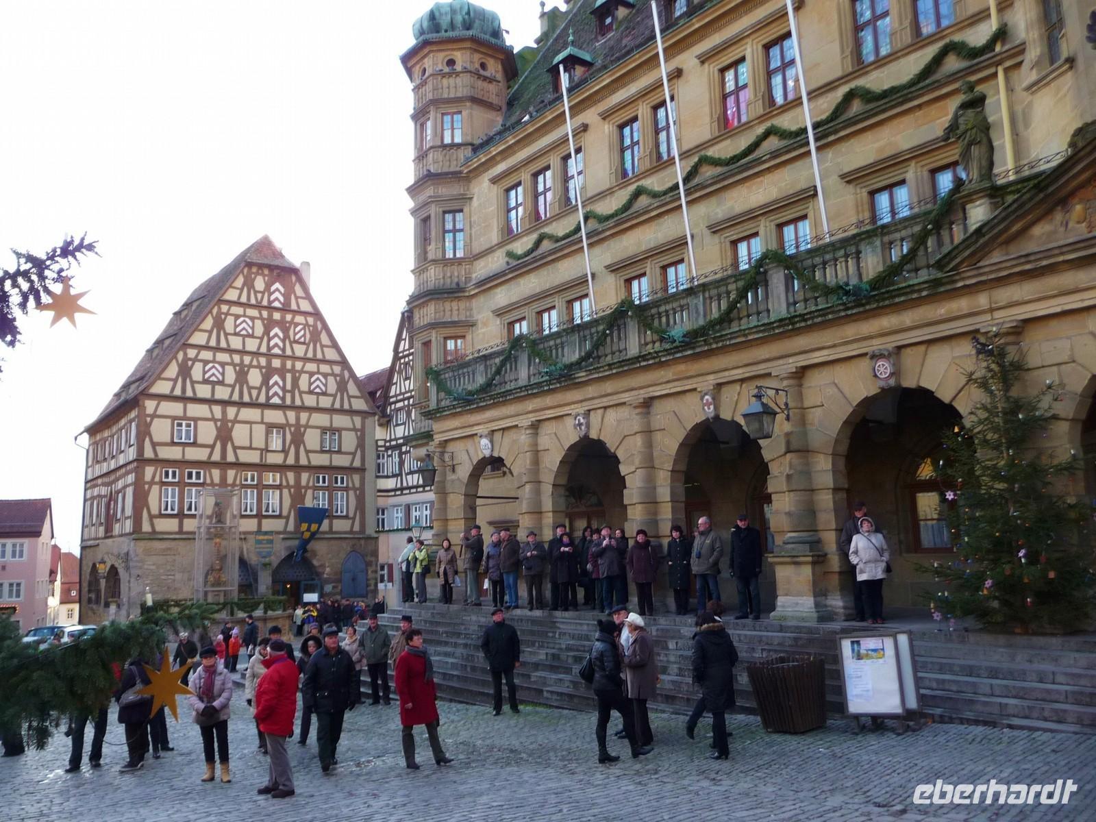 Bei der anschließenden Weiterfahrt über das Fichtelgebirge sahen wir dann etwas Schnee und komplettierten unsere Busgäste. Nun war die Reisegruppe komplett und es ging in reibungsloser Fahrt, vorbei an Bayreuth und Nürnberg, mit einer kleinen Mittagspause am Rastplatz danach zum Autobahnkreuz Feuchtwangen und von hier zu unserem ersten Reiseziel, der alten freien Reichsstadt Rothenburg ob der Tauber, die sich noch ein so sehenswertes mittelalterliches ‚Stadtbild erhalten hat. Von der Bastei im Süden spazierten wir durch das Spitaltor in die wunderschön weihnachtlich geschmückte Stadt. Vorbei am Plönlein mit seinem berühmten Fotomotiv, dem Topplerhaus und dem Bürgerhaus mit den sieben Todsünden und den sieben Tugenden ging es zum Marktplatz der Stadt. Der Brunnen des heiligen Georg, das Fleisch- und Tanzhaus, das Rathaus, die Ratstrinkstube mit ihrer Mechanischen Uhr beeindruckten uns hier. Alle wurden mit Stadtplänen ausgestattet und genau 15:00 Uhr besichtigten wir an der Turmuhr der Ratsstube den „Meistertrunk“.