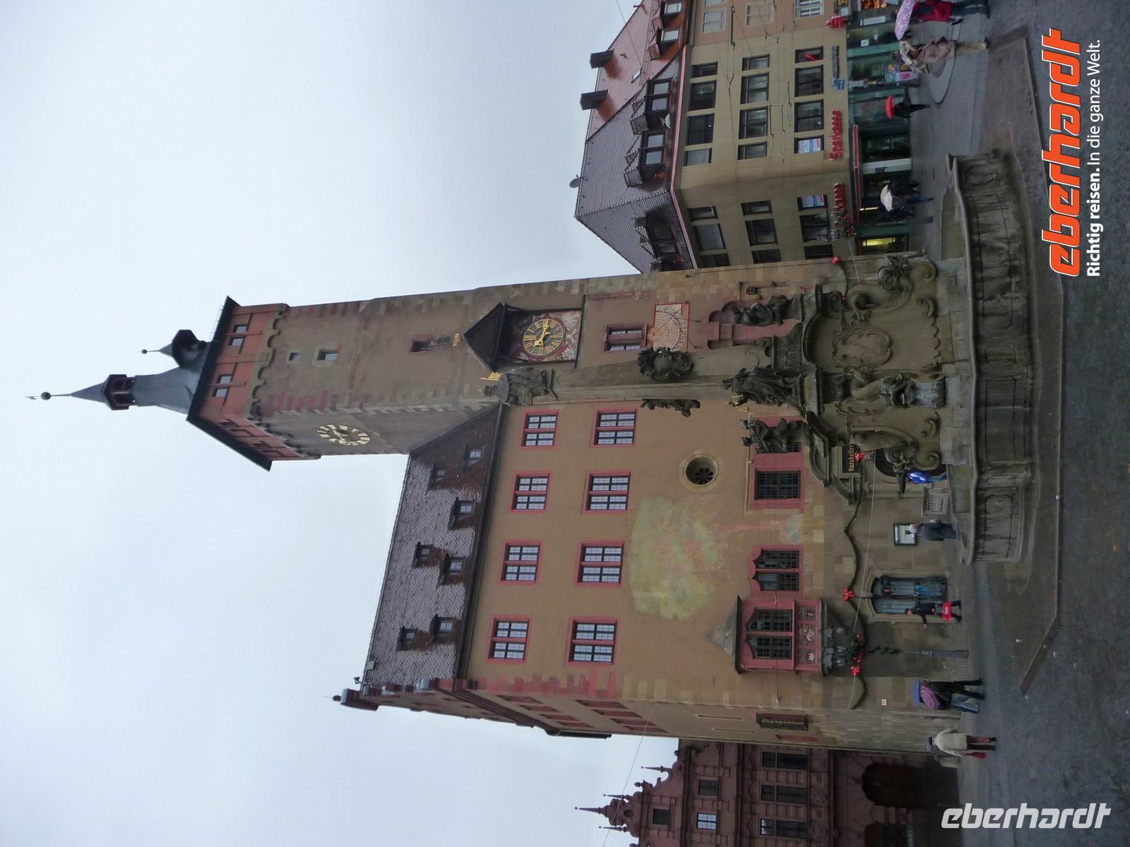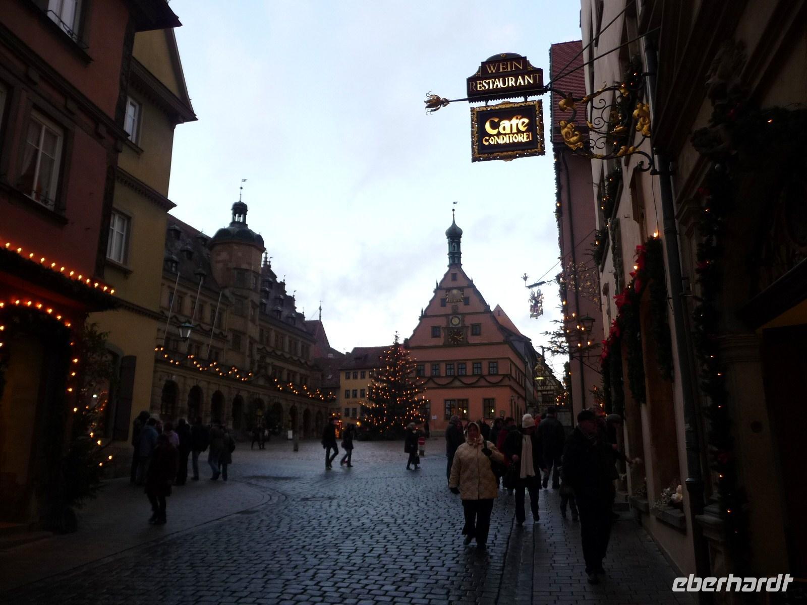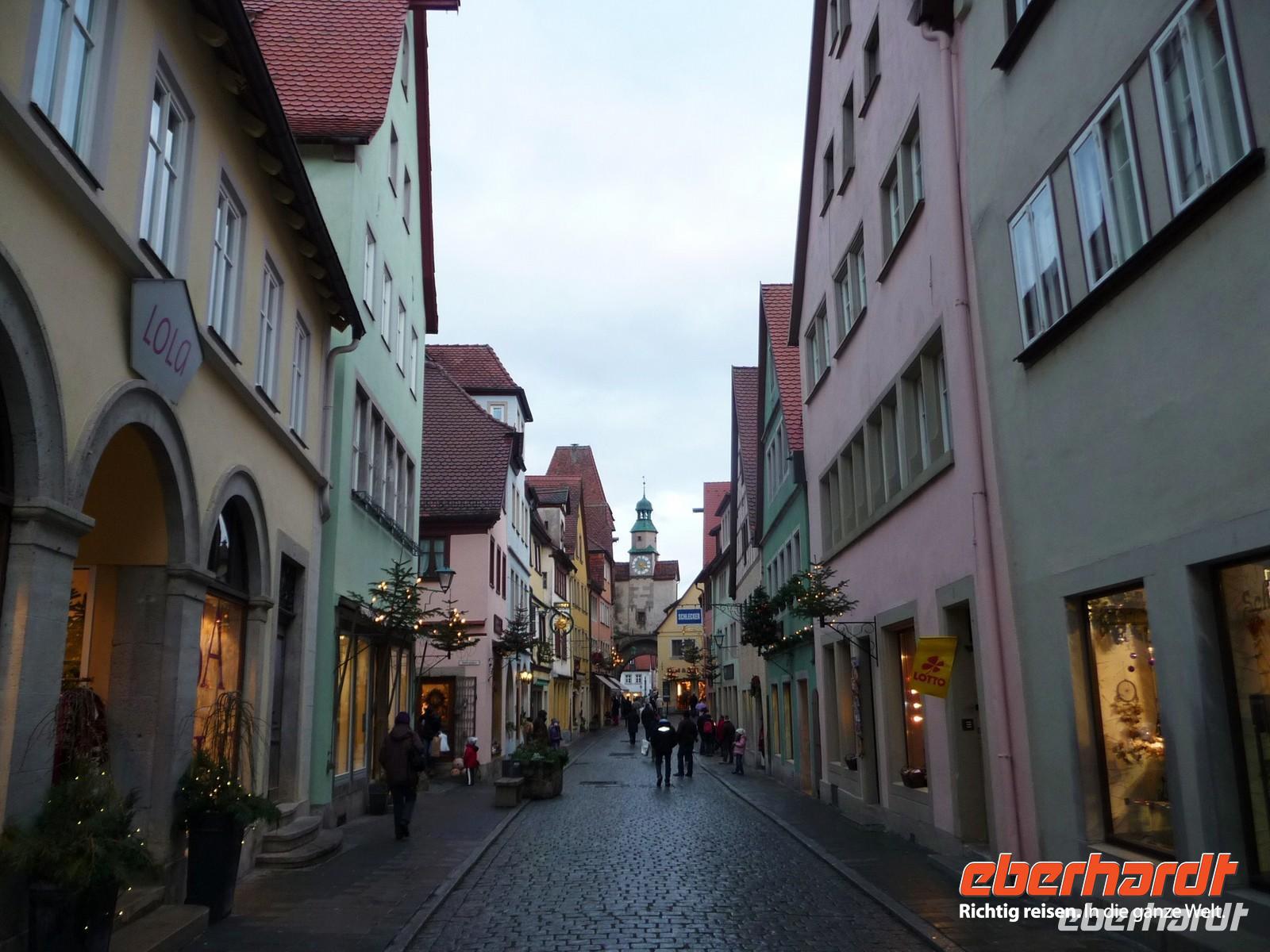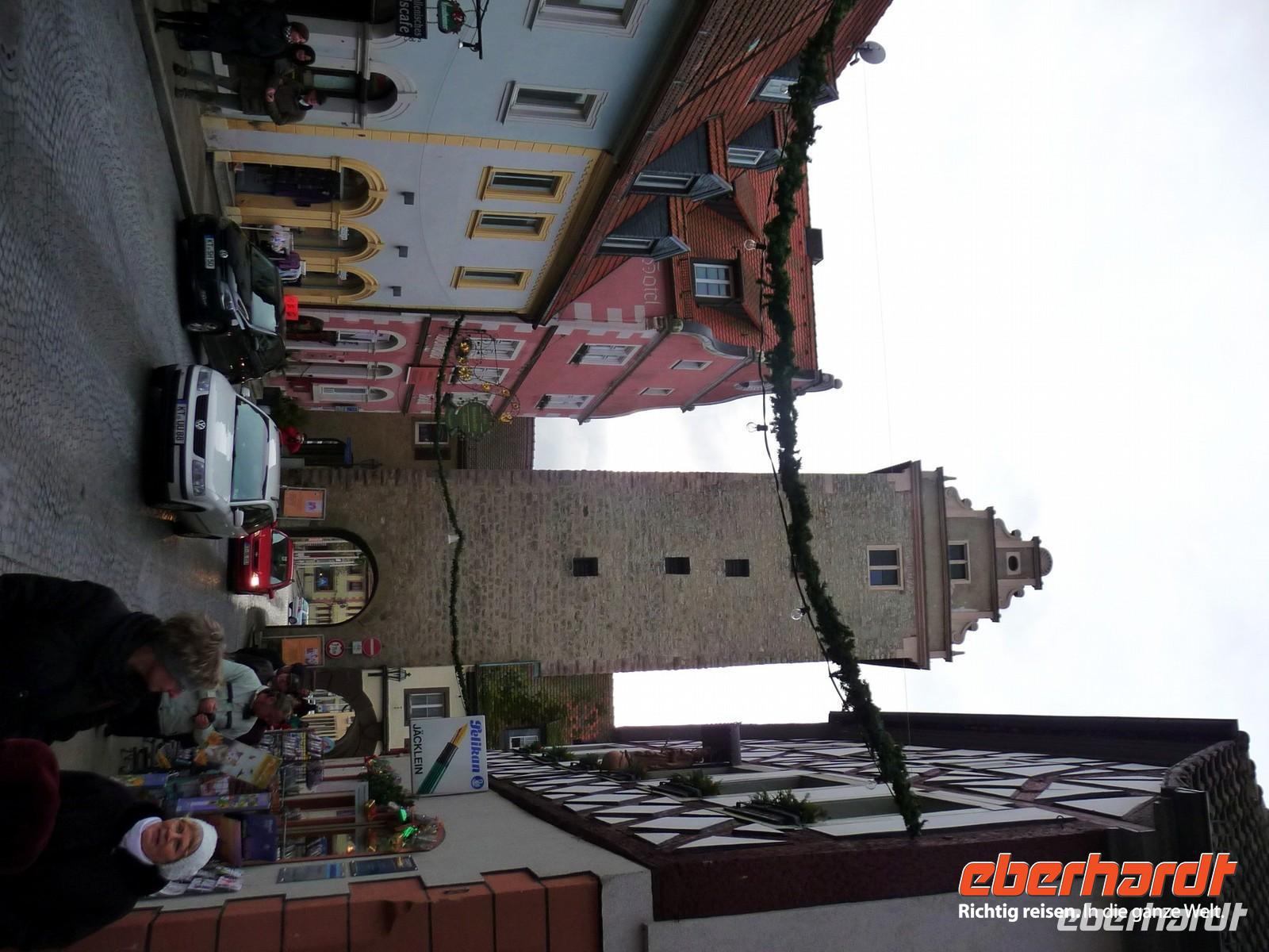 Bei der anschließenden Weiterfahrt über das Fichtelgebirge sahen wir dann etwas Schnee und komplettierten unsere Busgäste. Nun war die Reisegruppe komplett und es ging in reibungsloser Fahrt, vorbei an Bayreuth und Nürnberg, mit einer kleinen Mittagspause am Rastplatz danach zum Autobahnkreuz Feuchtwangen und von hier zu unserem ersten Reiseziel, der alten freien Reichsstadt Rothenburg ob der Tauber, die sich noch ein so sehenswertes mittelalterliches ‚Stadtbild erhalten hat. Von der Bastei im Süden spazierten wir durch das Spitaltor in die wunderschön weihnachtlich geschmückte Stadt. Vorbei am Plönlein mit seinem berühmten Fotomotiv, dem Topplerhaus und dem Bürgerhaus mit den sieben Todsünden und den sieben Tugenden ging es zum Marktplatz der Stadt. Der Brunnen des heiligen Georg, das Fleisch- und Tanzhaus, das Rathaus, die Ratstrinkstube mit ihrer Mechanischen Uhr beeindruckten uns hier. Alle wurden mit Stadtplänen ausgestattet und genau 15:00 Uhr besichtigten wir an der Turmuhr der Ratsstube den „Meistertrunk“.