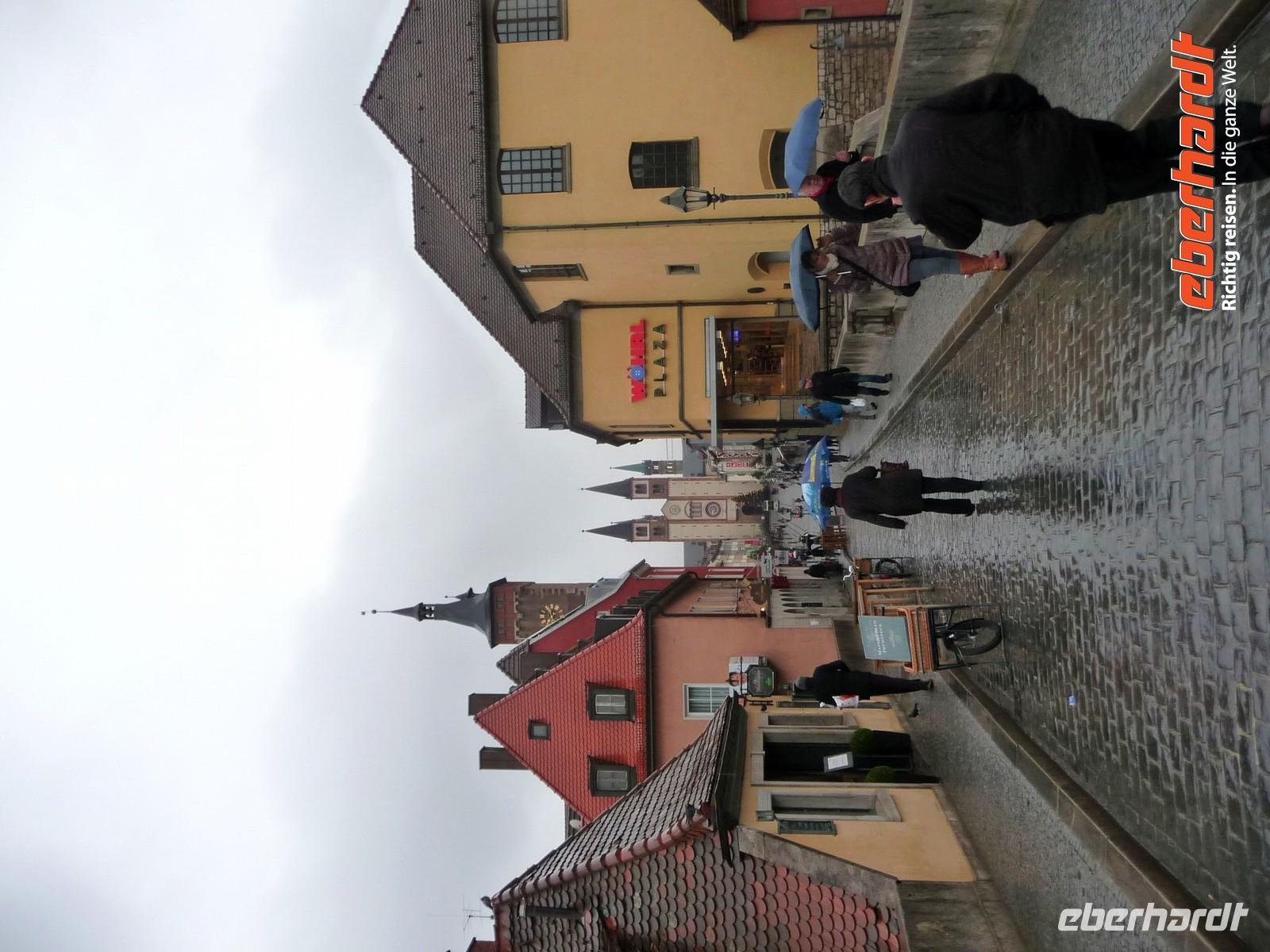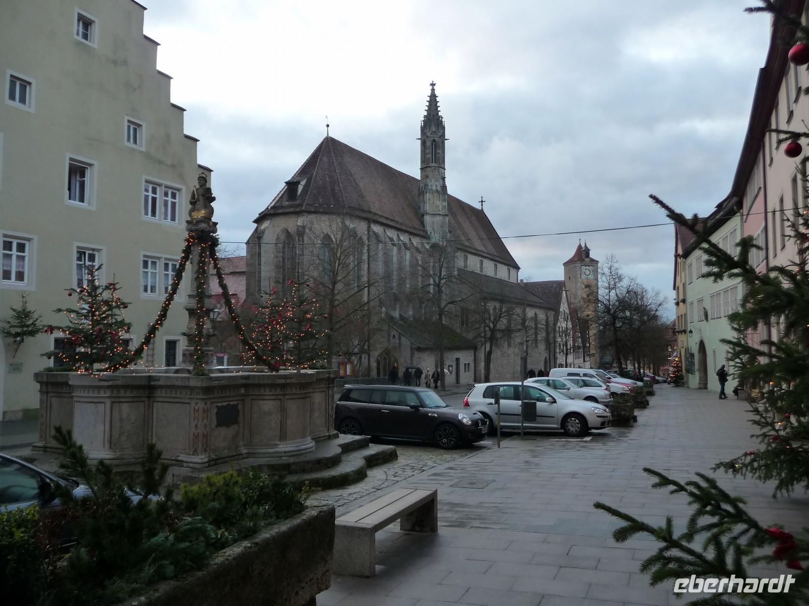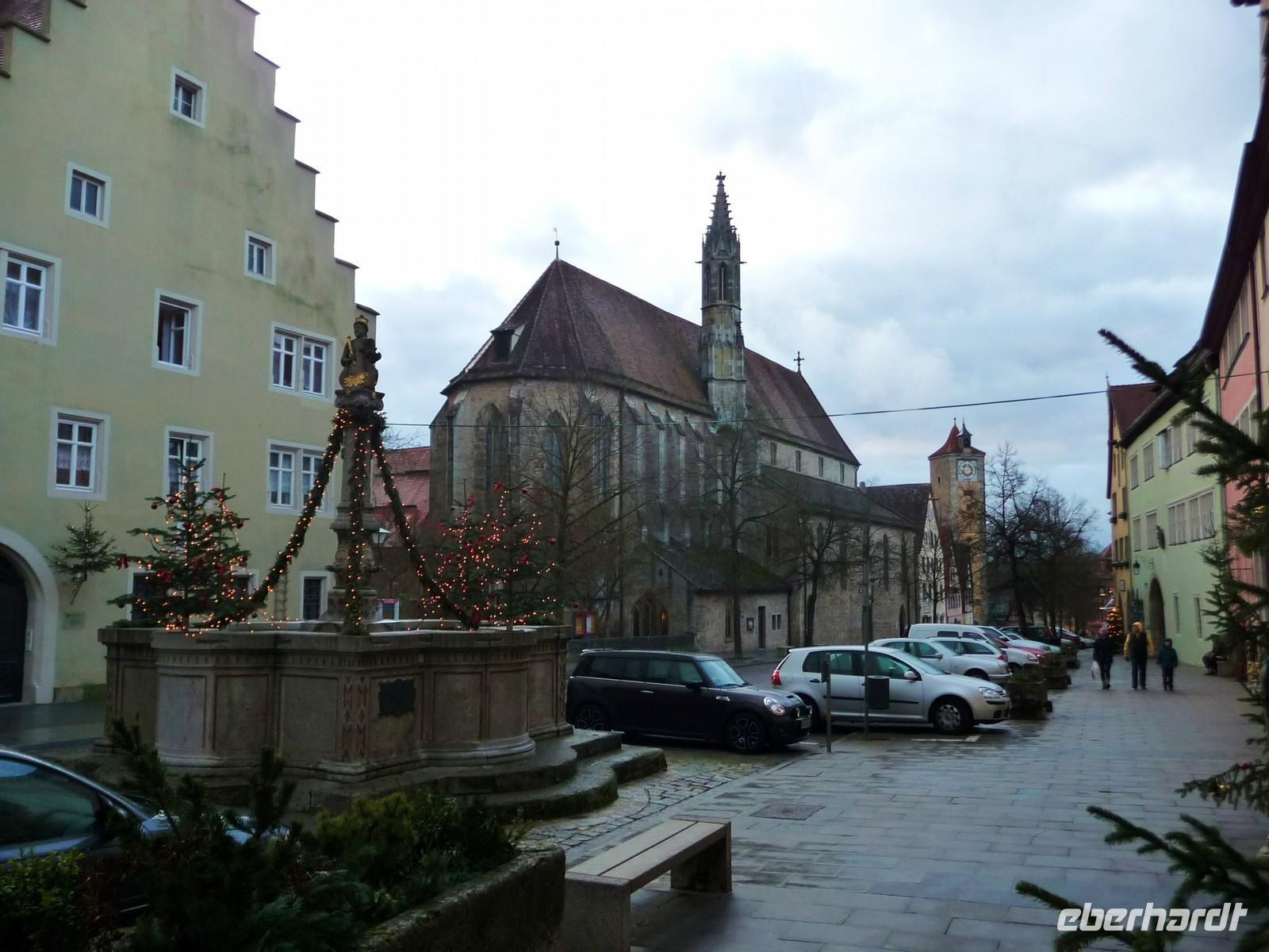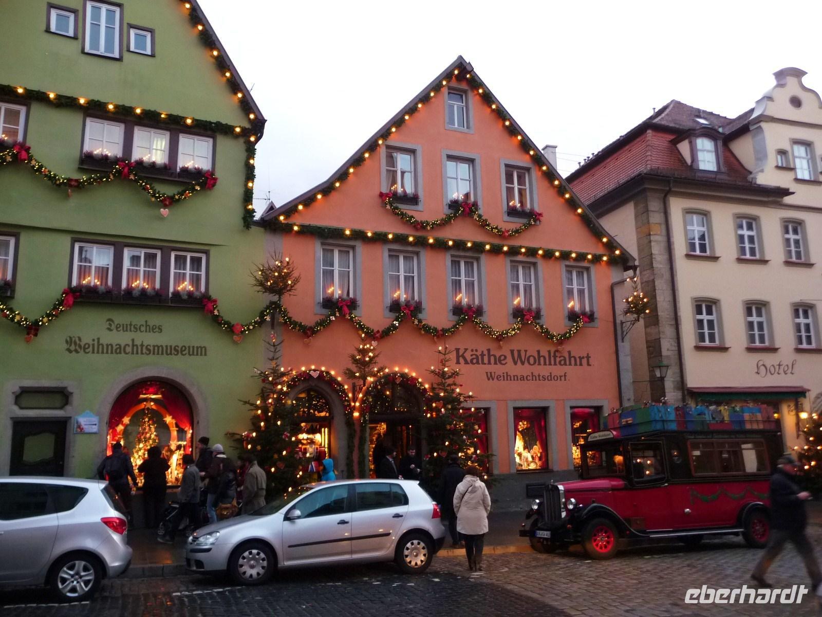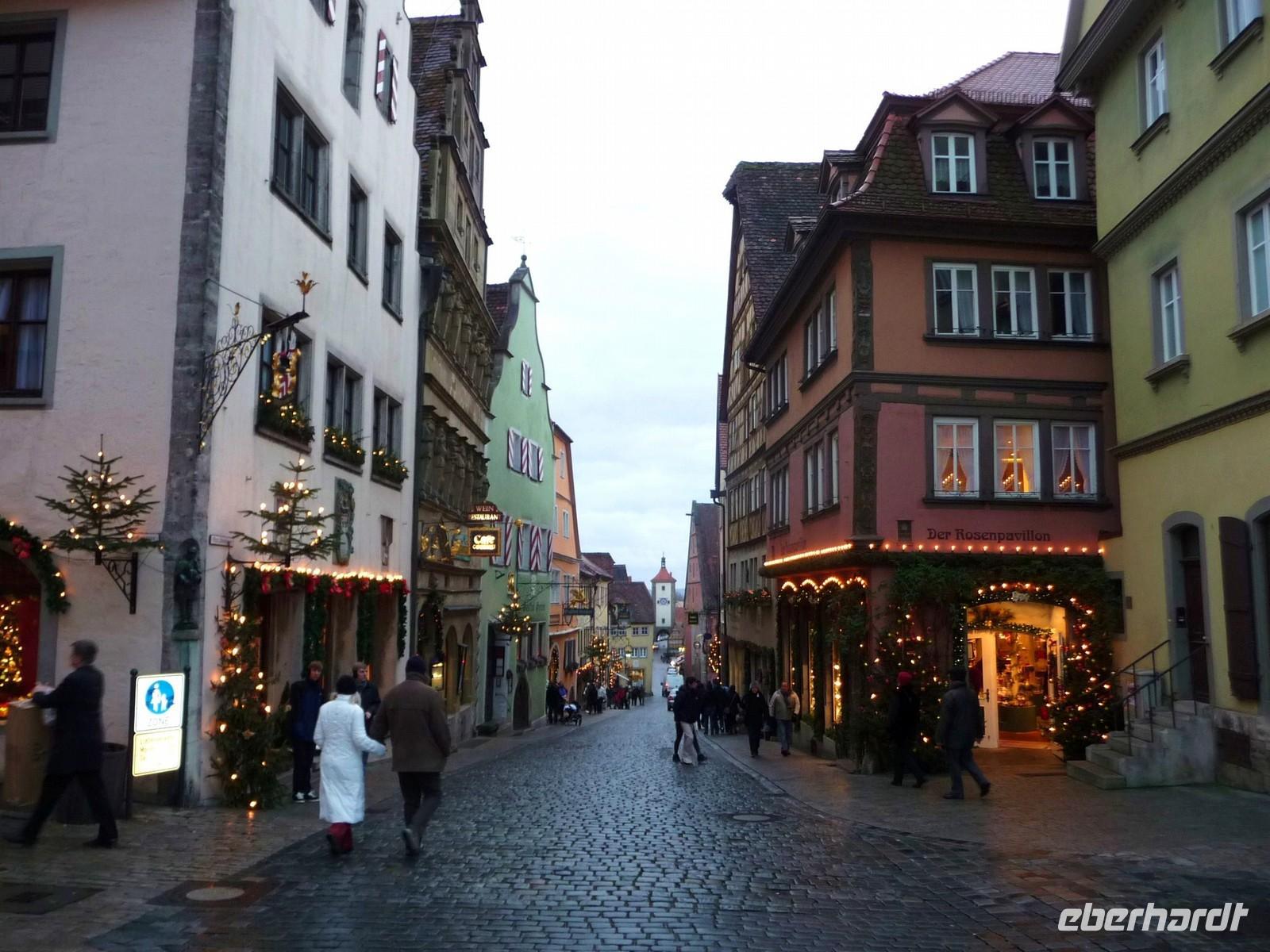 Bei der anschließenden Weiterfahrt über das Fichtelgebirge sahen wir dann etwas Schnee und komplettierten unsere Busgäste. Nun war die Reisegruppe komplett und es ging in reibungsloser Fahrt, vorbei an Bayreuth und Nürnberg, mit einer kleinen Mittagspause am Rastplatz danach zum Autobahnkreuz Feuchtwangen und von hier zu unserem ersten Reiseziel, der alten freien Reichsstadt Rothenburg ob der Tauber, die sich noch ein so sehenswertes mittelalterliches ‚Stadtbild erhalten hat. Von der Bastei im Süden spazierten wir durch das Spitaltor in die wunderschön weihnachtlich geschmückte Stadt. Vorbei am Plönlein mit seinem berühmten Fotomotiv, dem Topplerhaus und dem Bürgerhaus mit den sieben Todsünden und den sieben Tugenden ging es zum Marktplatz der Stadt. Der Brunnen des heiligen Georg, das Fleisch- und Tanzhaus, das Rathaus, die Ratstrinkstube mit ihrer Mechanischen Uhr beeindruckten uns hier. Alle wurden mit Stadtplänen ausgestattet und genau 15:00 Uhr besichtigten wir an der Turmuhr der Ratsstube den „Meistertrunk“.