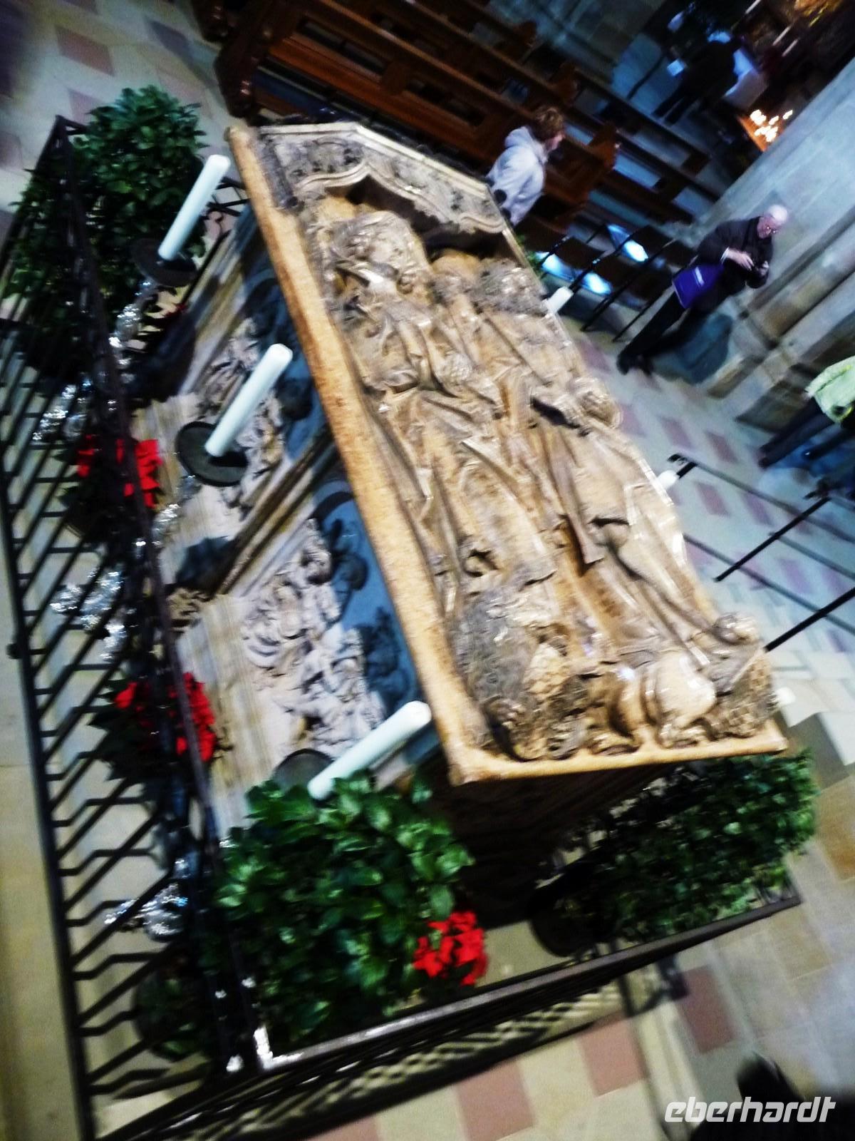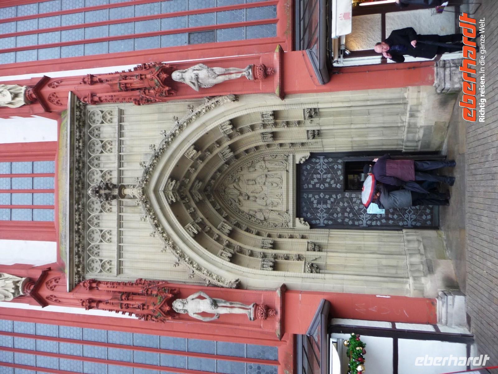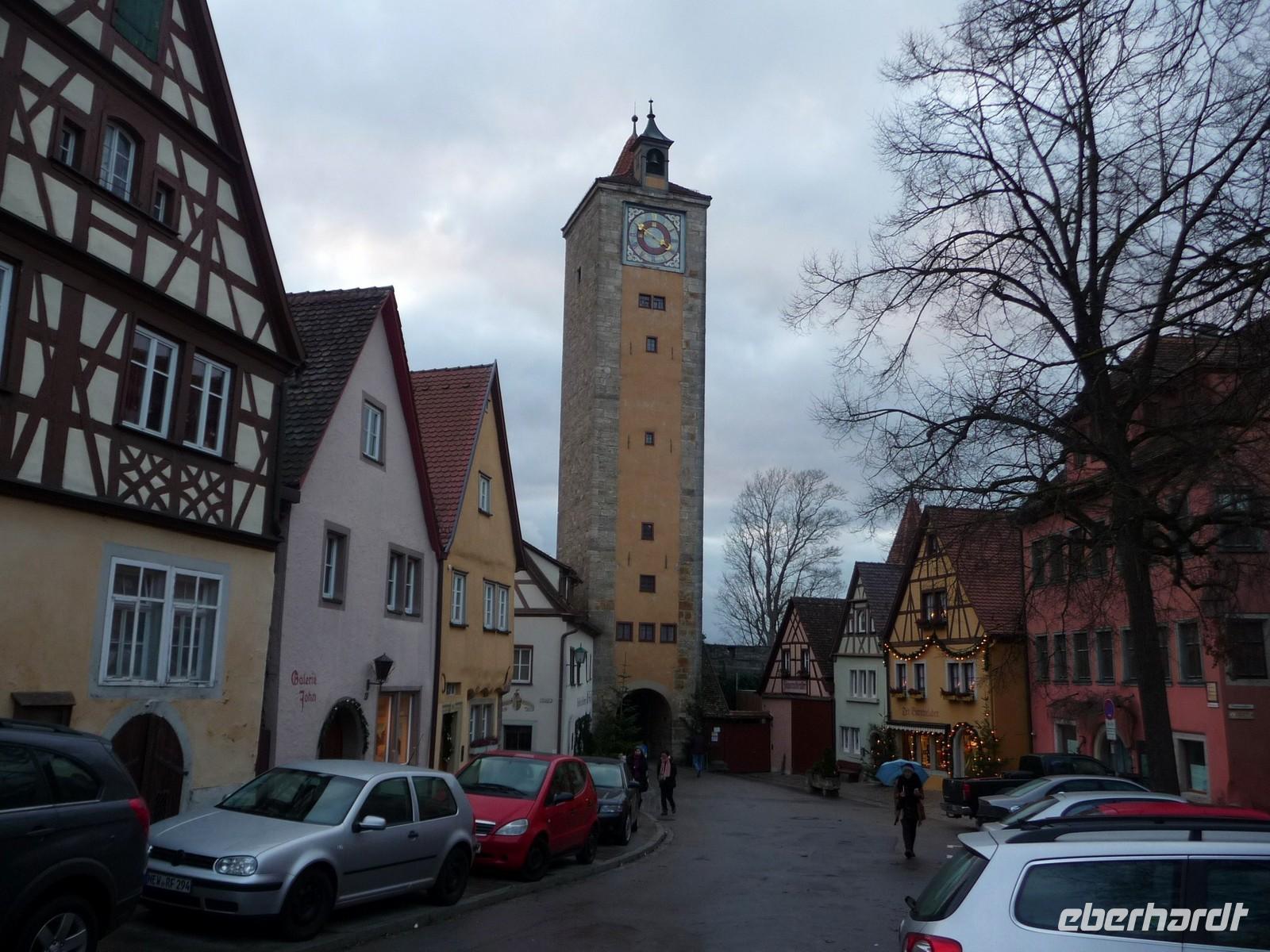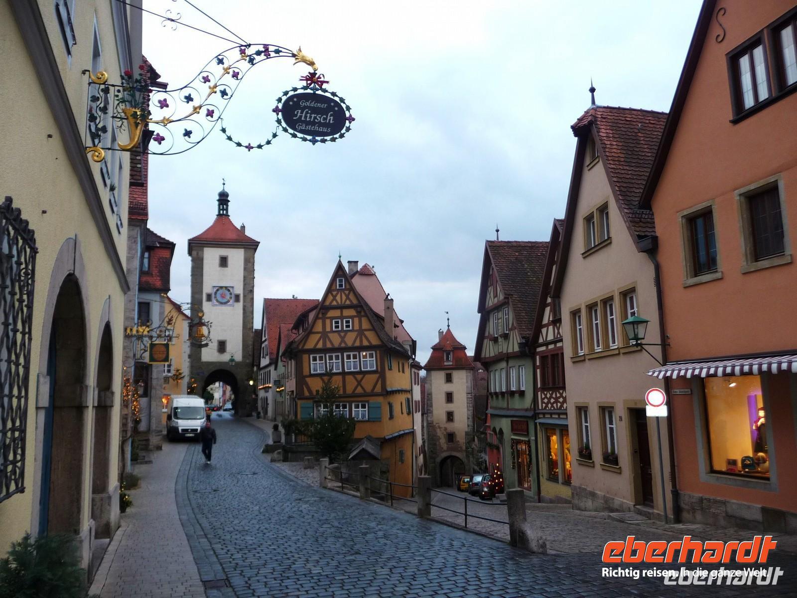 Bei der anschließenden Weiterfahrt über das Fichtelgebirge sahen wir dann etwas Schnee und komplettierten unsere Busgäste. Nun war die Reisegruppe komplett und es ging in reibungsloser Fahrt, vorbei an Bayreuth und Nürnberg, mit einer kleinen Mittagspause am Rastplatz danach zum Autobahnkreuz Feuchtwangen und von hier zu unserem ersten Reiseziel, der alten freien Reichsstadt Rothenburg ob der Tauber, die sich noch ein so sehenswertes mittelalterliches ‚Stadtbild erhalten hat. Von der Bastei im Süden spazierten wir durch das Spitaltor in die wunderschön weihnachtlich geschmückte Stadt. Vorbei am Plönlein mit seinem berühmten Fotomotiv, dem Topplerhaus und dem Bürgerhaus mit den sieben Todsünden und den sieben Tugenden ging es zum Marktplatz der Stadt. Der Brunnen des heiligen Georg, das Fleisch- und Tanzhaus, das Rathaus, die Ratstrinkstube mit ihrer Mechanischen Uhr beeindruckten uns hier. Alle wurden mit Stadtplänen ausgestattet und genau 15:00 Uhr besichtigten wir an der Turmuhr der Ratsstube den „Meistertrunk“.