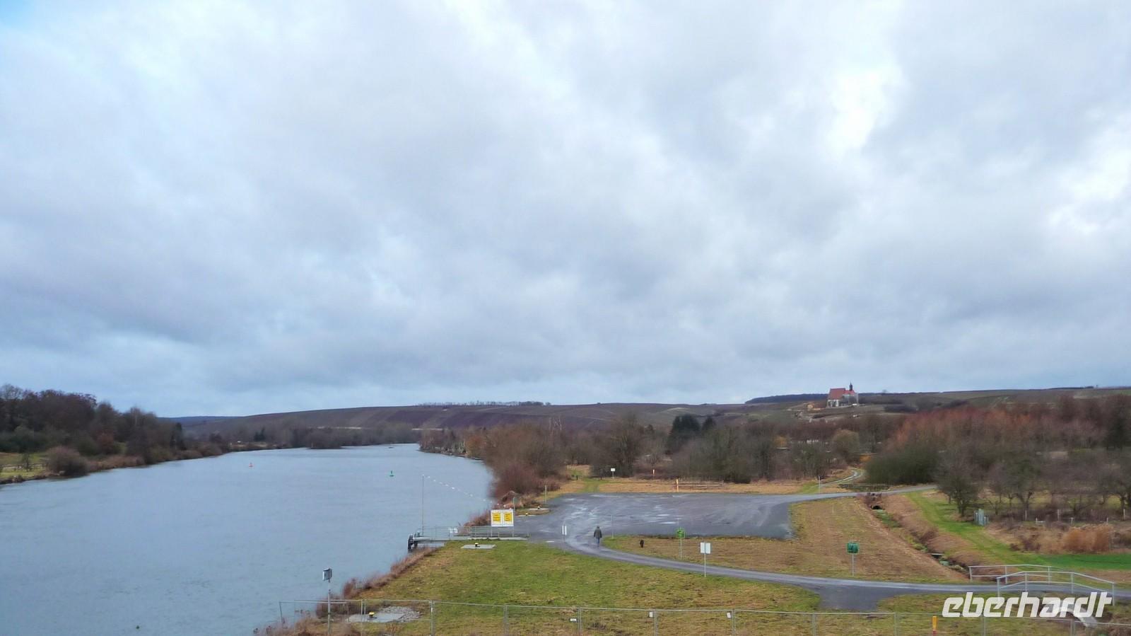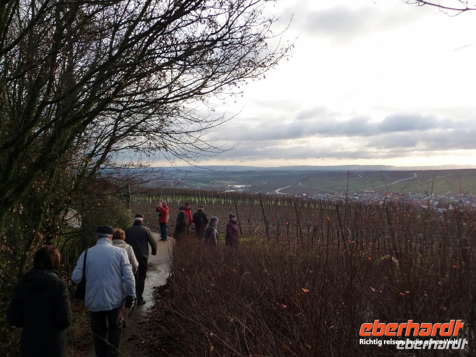 Ab 8:00 bis 9:00 Uhr erwachte der Tag beim gemeinsamen Frühstück und sehr gut gestärkt starteten wir zu unserer Fahrt von Werneck zur Mainschleife nach Volkach. Über Nacht hatte es geregnet und an diesem Morgen fiel das Thermometer. Es gab teilweise Blitzeis, also ging es vorsichtig durch die kleinen Dörfer und Felder, vorbei an zahlreichen Bildstöcken hinüber an den Main und dann mainabwärts durch die Weinberge und hübschen Orte zum Beginn der Mainschleife. Nach der Auffahrt zum Vogelsberg hielten wir am Parkplatz der Aussicht und nachdem wir diese gemeinsam erklommen hatten, genossen wir den Blick auf das Flusstal und diese Windung des Mains.