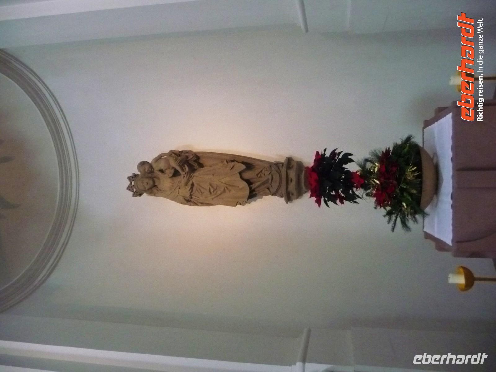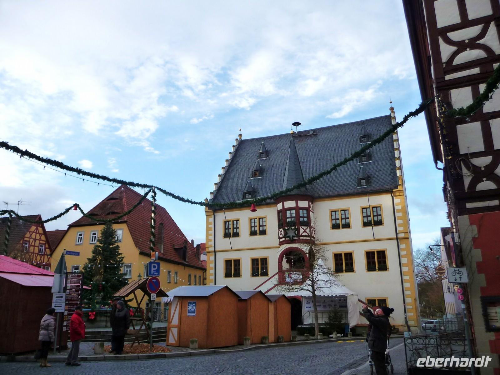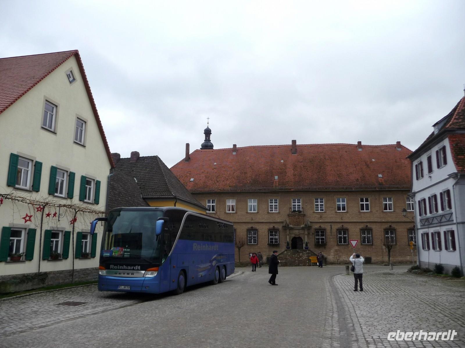 Die anschließende Weiterfahrt brachte uns in die historische Stadt Volkach. Vom Oberen Stadttor spazierten wir durch die Stadt, vorbei an den sehenswerten Gebäuden der Altstadt zum Markt mit seinem Renaissance-Rathaus, weiter zum unteren Tor und durch die Promenaden am Ufer der Volkach entlang zur Mainbrücke. Von hier aus sahen wir ebenfalls die Flussschleife und die Kirche Maria am Weinberg, deren Riemenscheider-Madonna im Winter leider nicht besichtigt werden kann.