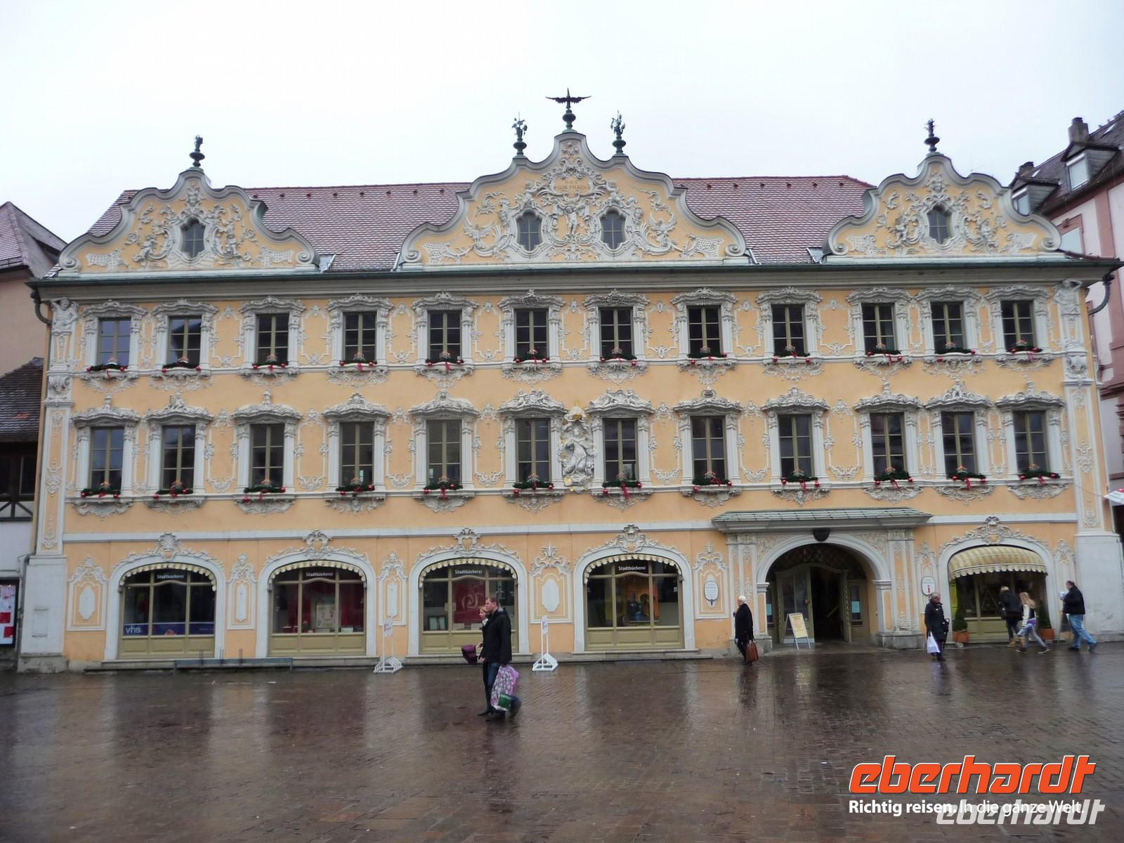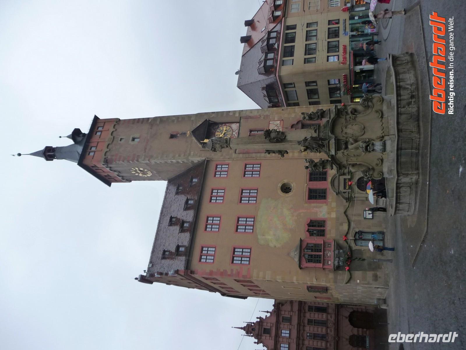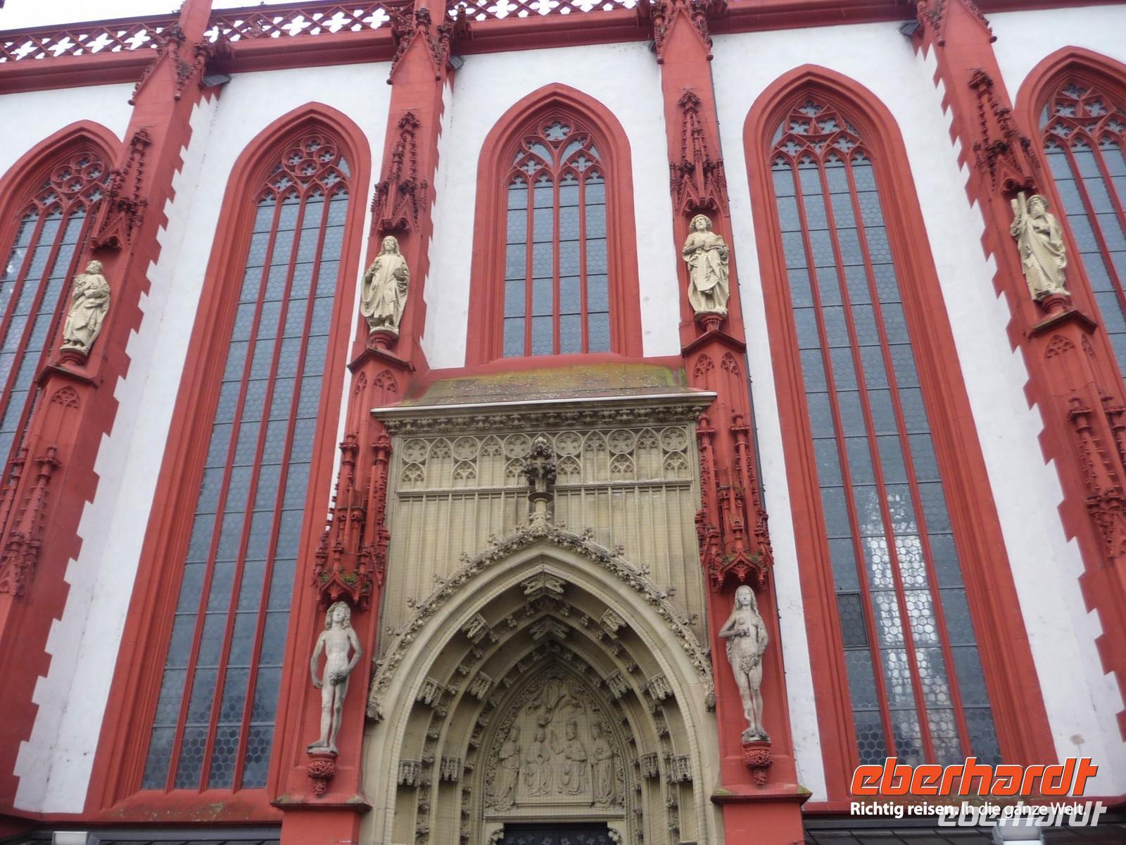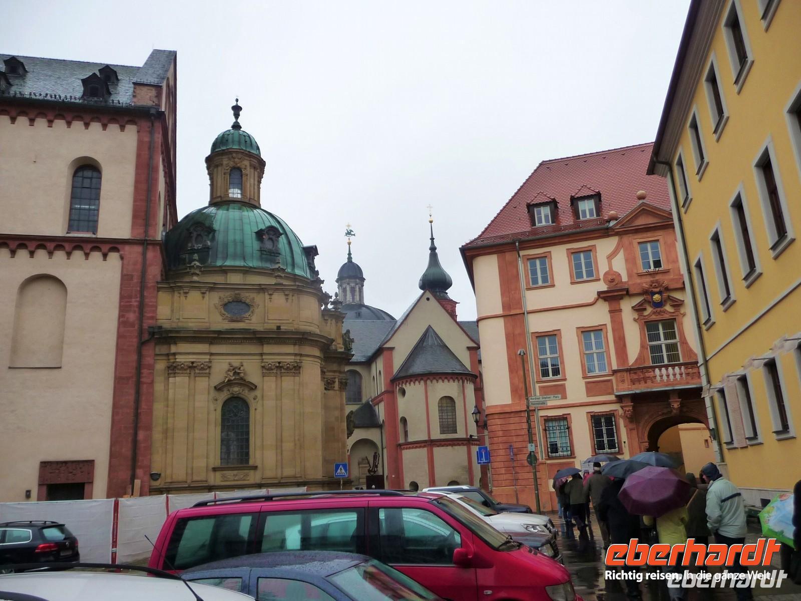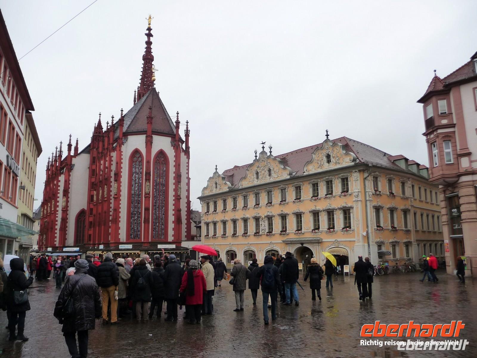Heute regnete es und wir fuhren nach herzhaftem Frühstück nach Würzburg, in die barocke Residenzstadt der Fürstbischöfe. Die zwei netten und aufgeweckten Stadtführerinnen Frau Bösel und Frau Linkesch erwarteten uns schon am Parkplatz nahe der Friedensbrücke in Würzburg. Schnell war unsere Reisegruppe in zwei Gruppen geteilt und schon ging es los, mainaufwärts zur alten Mainbrücke und hinüber in die Stadt. Rathaus, Dom St. Kilian mit der Grabplatte Tilman Riemenschneiders,