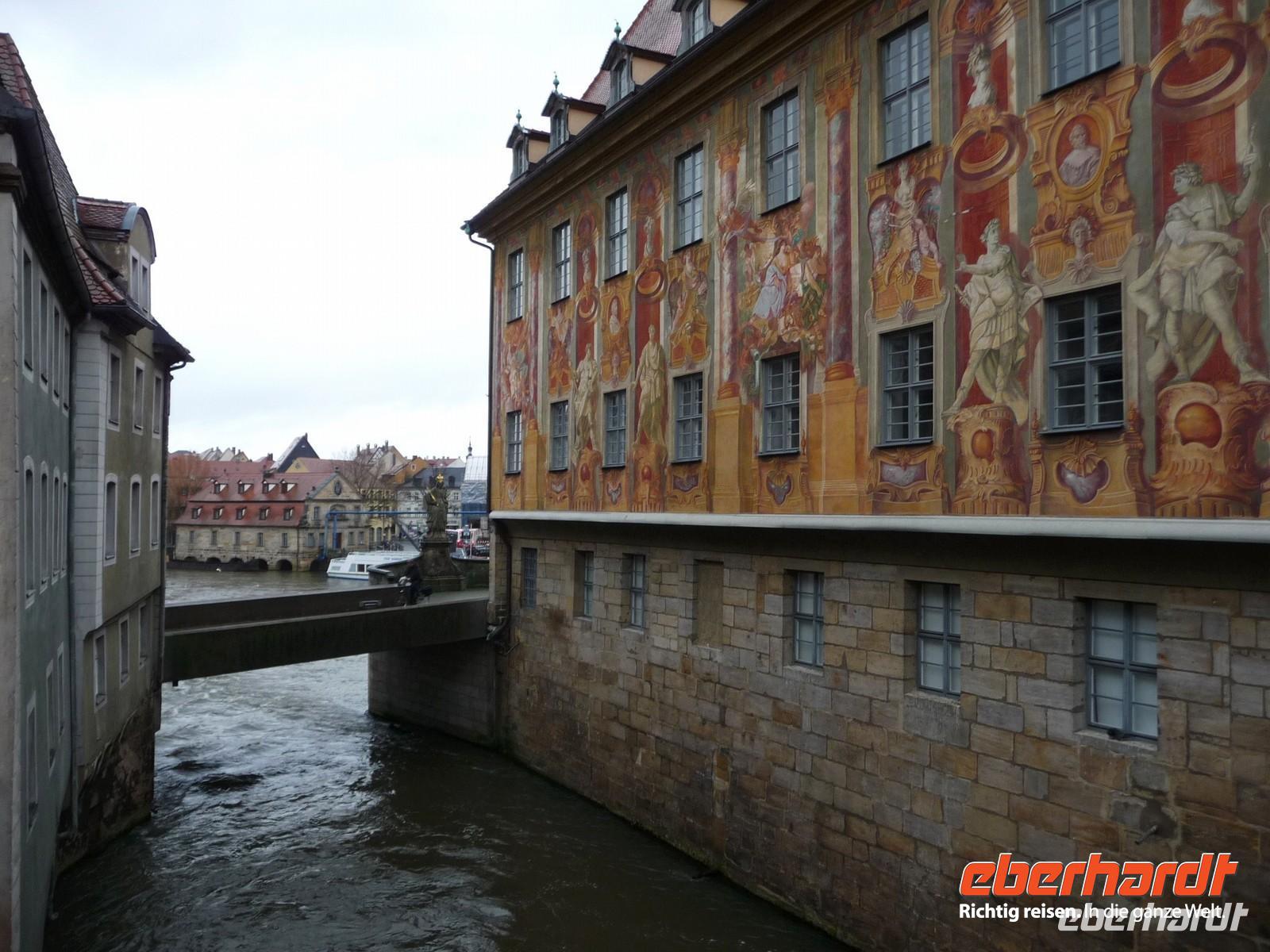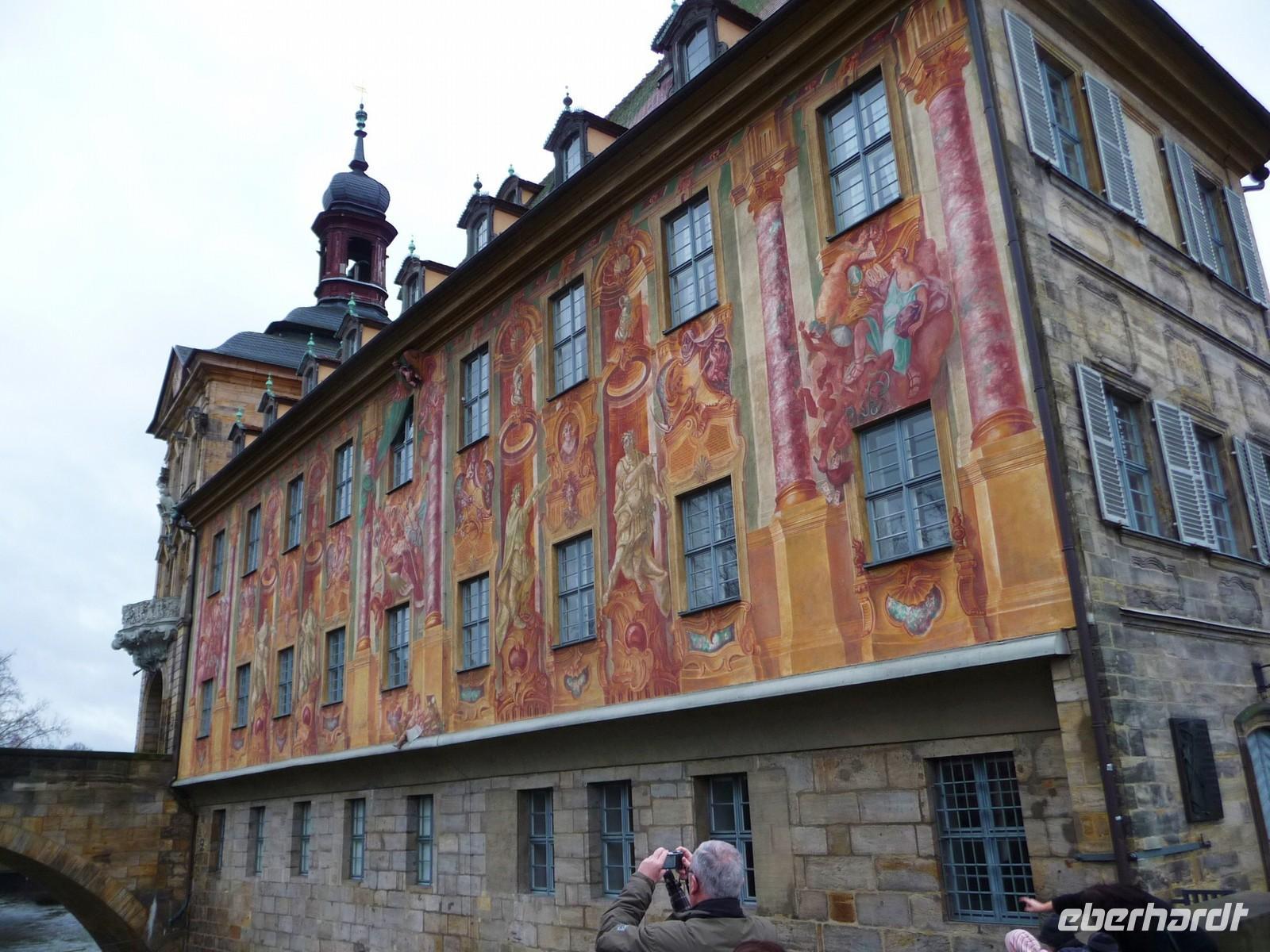 Unser letzter Tag, leider wieder Regen. Nach dem Frühstück luden wir die Koffer und nach herzlichem Abschied von der gesamten Familie Wegscheid fuhren wir nach Bamberg. Nahe der alten Mühlen an der Pegnitz stiegen wir an einer Stadtbushaltestelle aus, spazierten über die Brücken der Pegnitz auf romantischen Wegen durch die Altstadt, rund um das historische Rathaus.