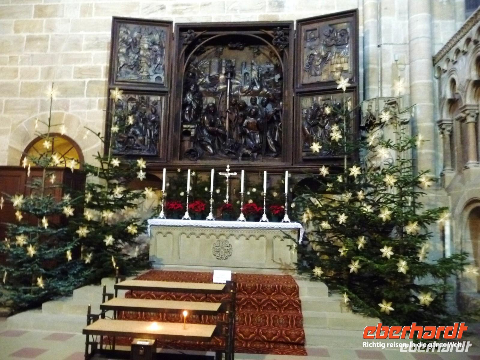 Der weitere Spaziergang führte uns hinauf zum Schlossberg und zur Besichtigung des Dom mit dem Bamberger Reiter, der Gruft von Heinrich dem II und Kunigunde, dem Veit-Stoß-Altar und dem Fürstenportal. Danach gingen wir zum Rosengarten an der Neuen Residenz mit Blick hinüber zum Dominikanerkloster auf dem Nachbarhügel und auf die Dächer der Stadt. Anschließend zur Alten Hofhaltung und hinab in die Gassen der Altstadt.