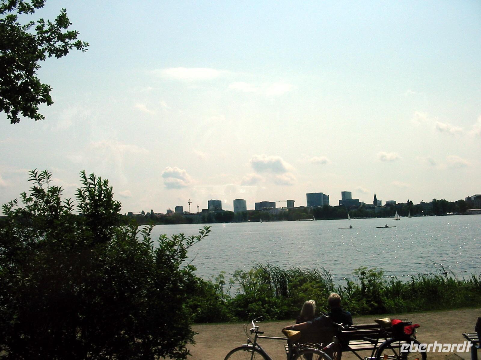 Hamburgs. Rund um die Außenalster ziehen sich Fußwege und Radwege, die bei Hamburgern zur Erholung und zum Joggen sehr beliebt sind.