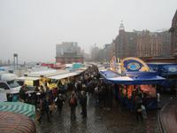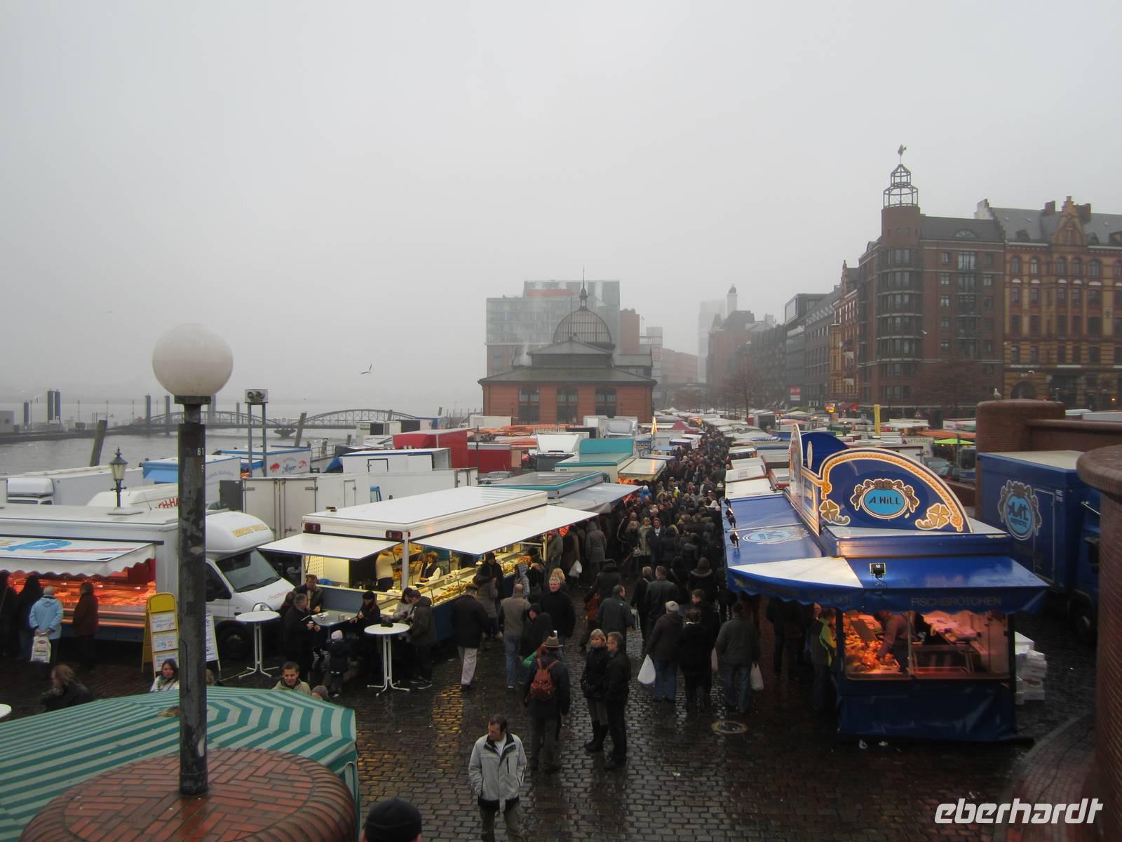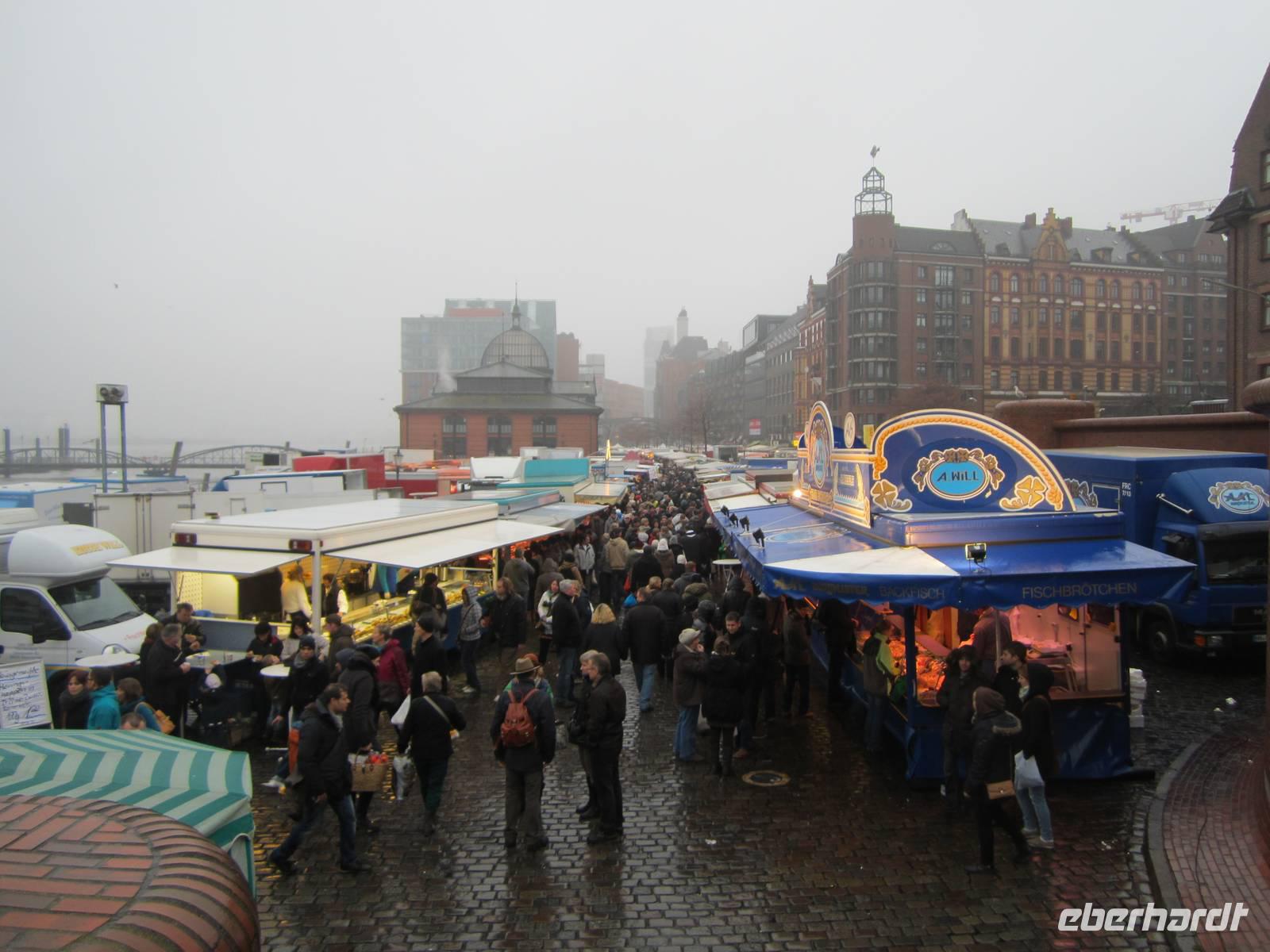 Wenn man am Sonntag in Hamburg ist, dann ist der Fischmarkt ein Muss und somit fällt die Nacht für einen Teil der Gruppe etwas kürzer aus. Wir fahren gegen 8.00 Uhr zum Fischmarkt. Die Auktionshalle lädt mit Musik zum Feiern und Aufwärmen ein. Gehandelt wird auf dem Fischmarkt nicht nur Fisch und so kommt es, dass wir mit Fisch, Obst, Schokolade und Käse gepackten Taschen an den Landungsbrücken auf Gerd und dem Bus warten. Gegen Mittag endet unser Hamburgbesuch und wir sind uns einig, mehr Hamburg geht nicht in der kurzen Zeit.