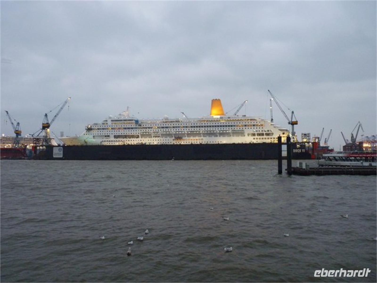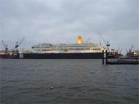 Gegenüber im Hafenbecken hatte die Queen Mary 2 zur Reparatur angelegt.