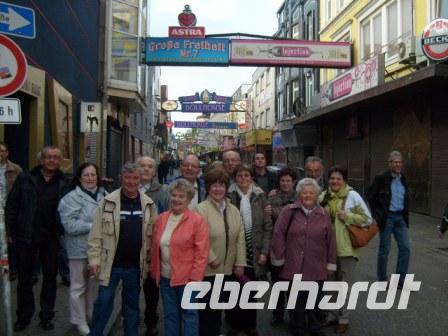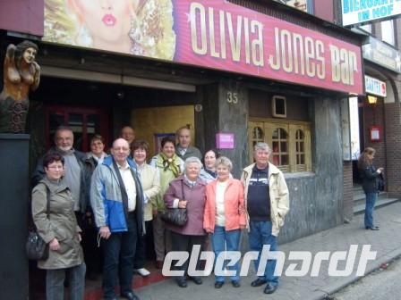 Woher kommt der Name Reeperbahn? In früheren Zeiten wurden auf dieser Strasse hundertmeterlange Schiffstaue, die Reepe, gedreht. Heute gilt die Reeperbahn im Vergnügungs- und Rotlichtviertel St. Pauli als die „sündigste Meile der Welt“. Und wer kennt ihn nicht, den von Hans Albers gesungenen Liedtext: „Auf der Reeperbahn nachts um halb eins“. Die Betonung liegt auf nachts, denn wer am Tag über den Hamburger „Kietz“ läuft, findet eher eine Meile mit einigen Geschäften vor, und wundert sich womöglich über viele verschlossene Türen. Doch wenn es dunkel wird, dann tobt das Leben auf St. Pauli. Unsere Gruppe konnte an diesem Abend bei einem geführten Rundgang dies erleben.