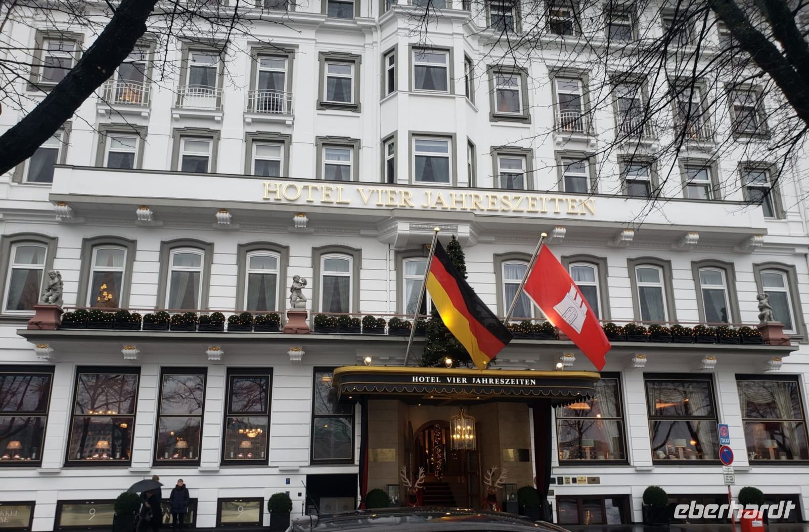Ein Teil der Gruppe trifft sich, um gemeinsam um die Binnenalster eine Runde zu drehen. Auch wenn es leicht regnet, genießen wir den Spaziergang sehr. Wir statten den beiden beliebtesten Hotels Hamburgs einen Besuch ab, das feudale Vier Jahreszeiten und das Hotel Atlantik.