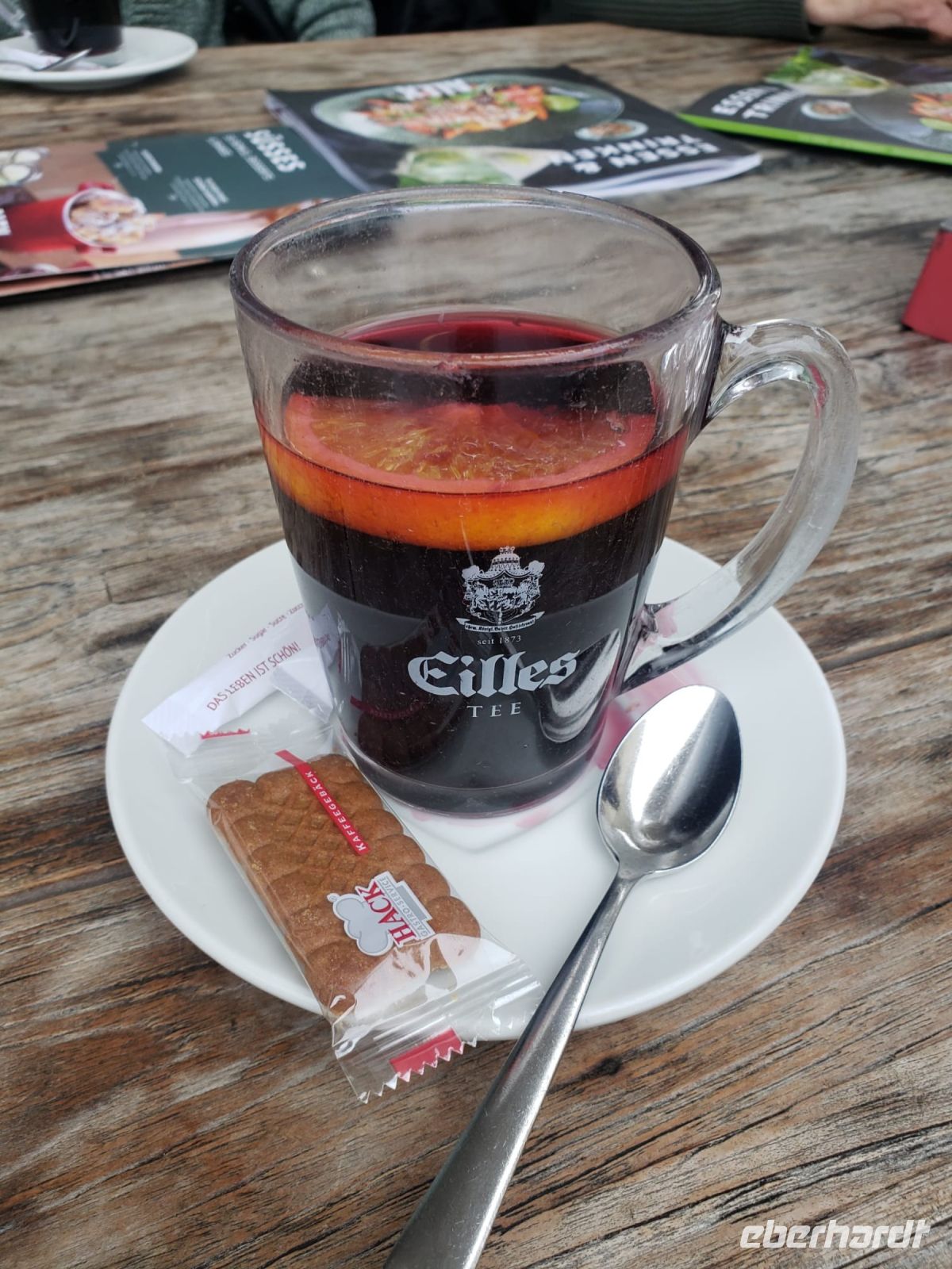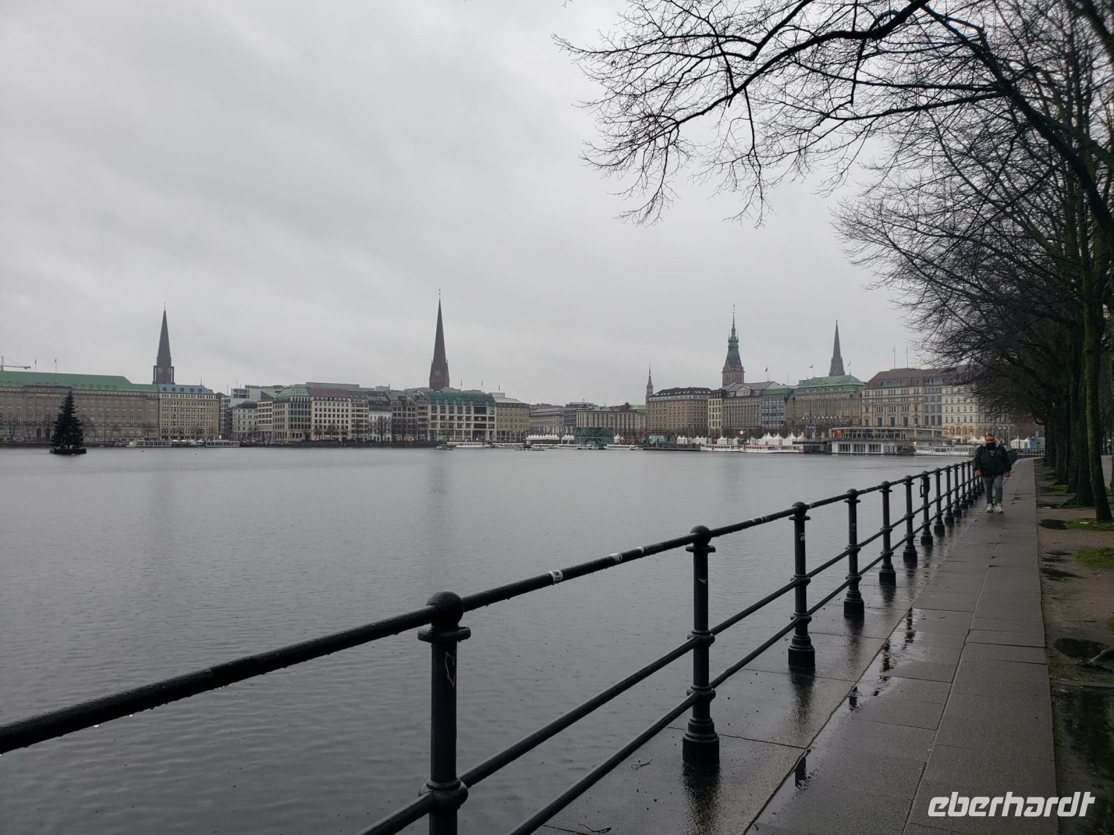 Natürlich legen wir auch eine Pause ein, wir sitzen aufgrund der warmen Temperaturen auf der Terrasse des Alsterpavillons und trinken einen Glühwein.