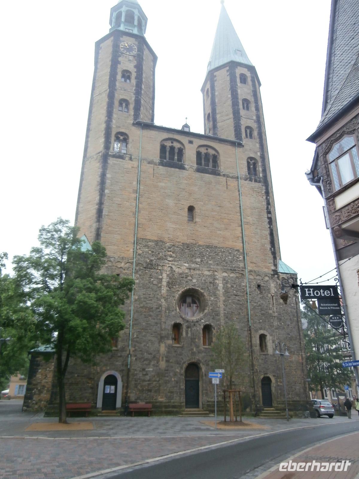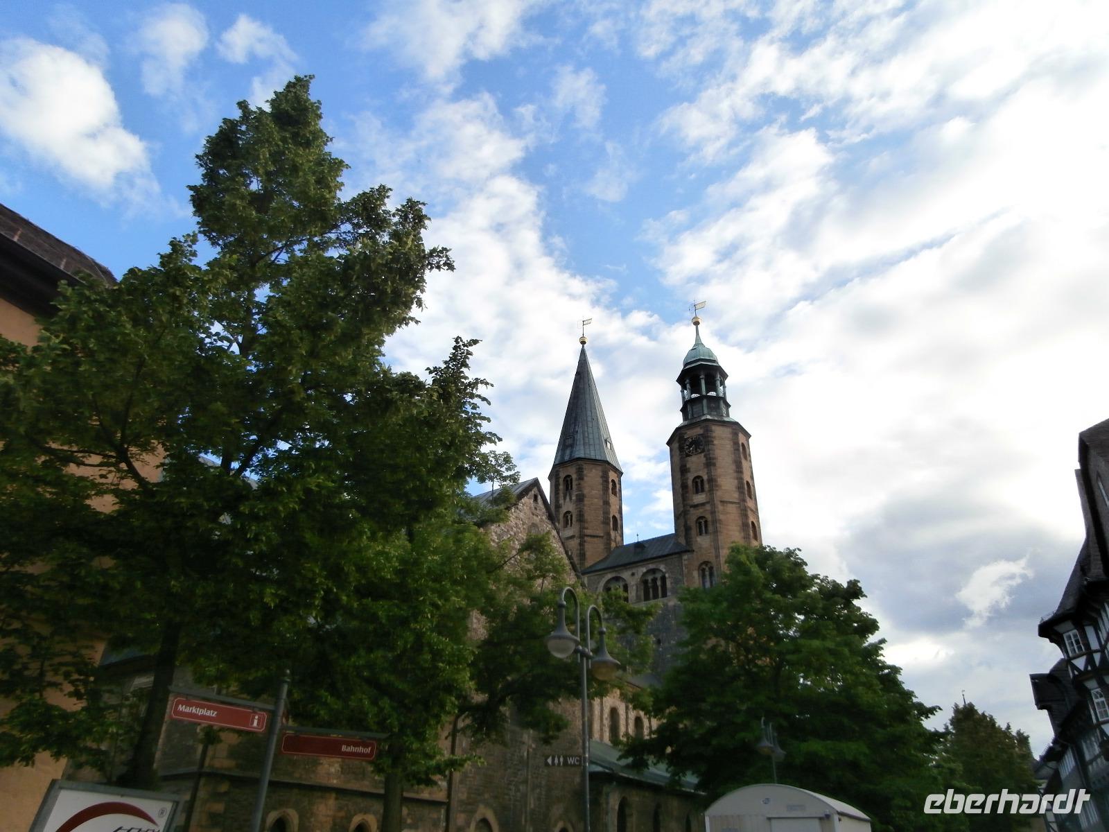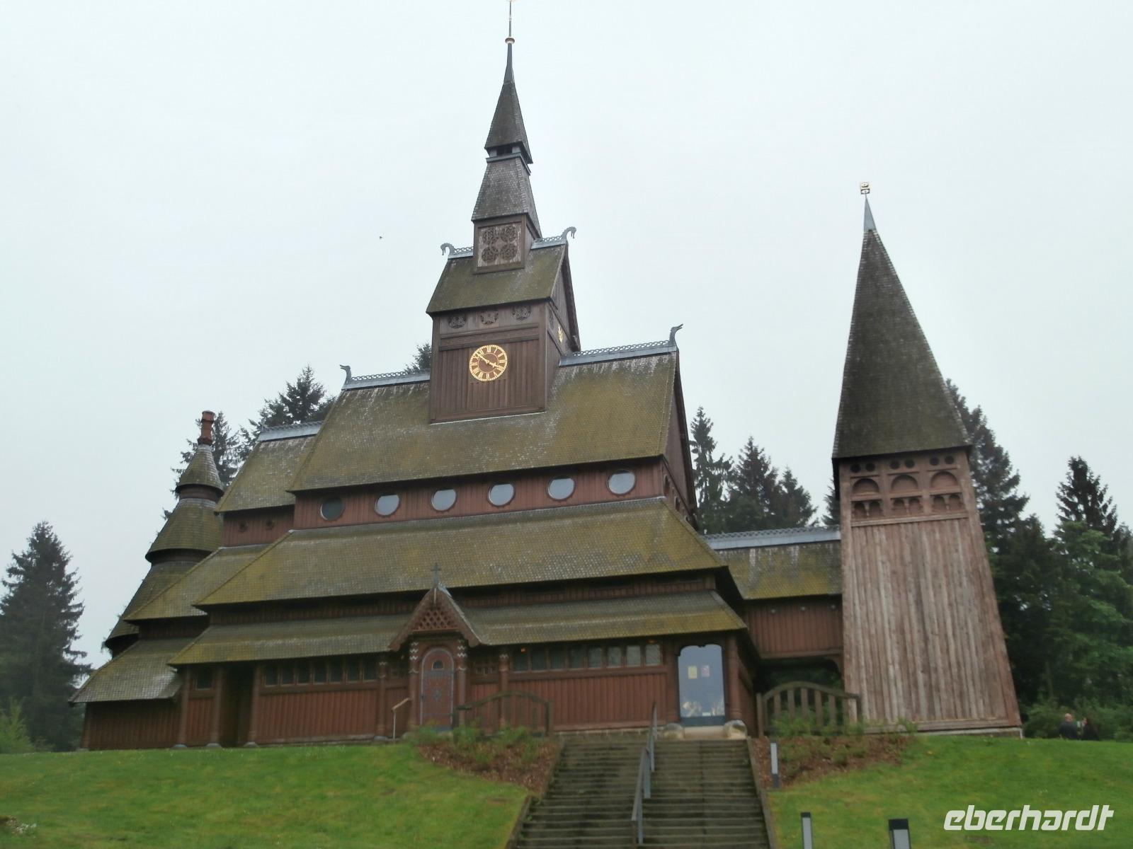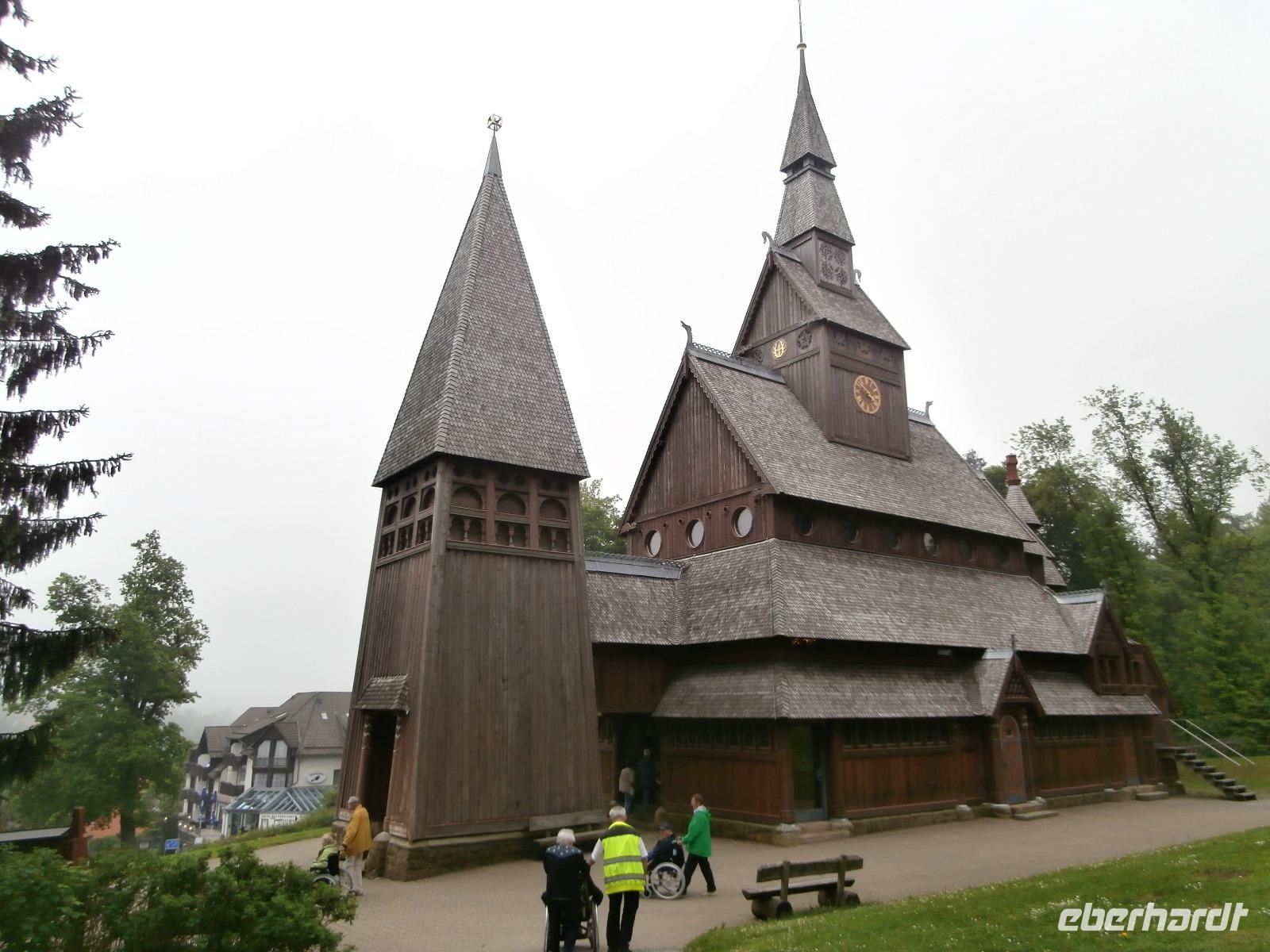 Bei trübem Wetter stehen heute Vormittag die Kaiserstadt Goslar und die Kaiserpfalz auf unserem Programm. Ab Hotel beginnt unser Rundgang mit der örtlichen Gästeführerin durch diese alte einst Freie Reichsstadt mit den kopfsteingepflasterten Gassen, die wir teilweise umfahren. Wir erhalten einen schönen Gesamteindruck von der Fülle der sehr unterschiedlichen Fachwerksubstanz, die reichlich verziert ist, in dieser Stadt. Der Marktplatz ist das Herzstück der Altstadt mit dem Marktbrunnen, dem Rathaus, welches grad umfassend restauriert wird und dem Glocken-und Figurenspiel, es ist mehrmals am Tage in Aktion zu erleben. Weiter Eckpunkte unseres Rundganges sind die Marktkirche, sie war eine dreischiffige Basilika um 1150 erbaut, das Patrizierhaus Brusttuch aus 1526 und dann kommen wir an der mächtigen Kaiserpfalz, als Romanischer Pfalz Bau im 11. JH errichtet, an. Mit einem Lift haben wir bequem Zugang zum großen Saal mit den fantastischen Wandmalereien zur deutschen Geschichte. Nach Freizeit und Aufenthalt im Hotel machen wir uns am zeitigen Nachmittag mit dem Bus auf den Weg nach Hahnenklee. Hier steht die einzige Stabkirche in Deutschland, errichtet nach dem Baustil der norwegischen Stabkirchen. Für uns etwas ganz Besonderes, diese Stabkirche im Harz zu sehen. Ingrid hat eine Anlehnrampe in der Kirche organisiert, so dass wir mit den Rollis bequem hineinfahren können. Von einer CD gibt es sehr viel Informatives zur Stabkirche, als kleine Spende von Eberhardt Travel ausgegeben. Ingrid singt noch ein Lied „Dona Nobis Pazem", es ist für uns alle ein sehr schönes Erlebnis in der Stabkirche zu Hahnenklee.