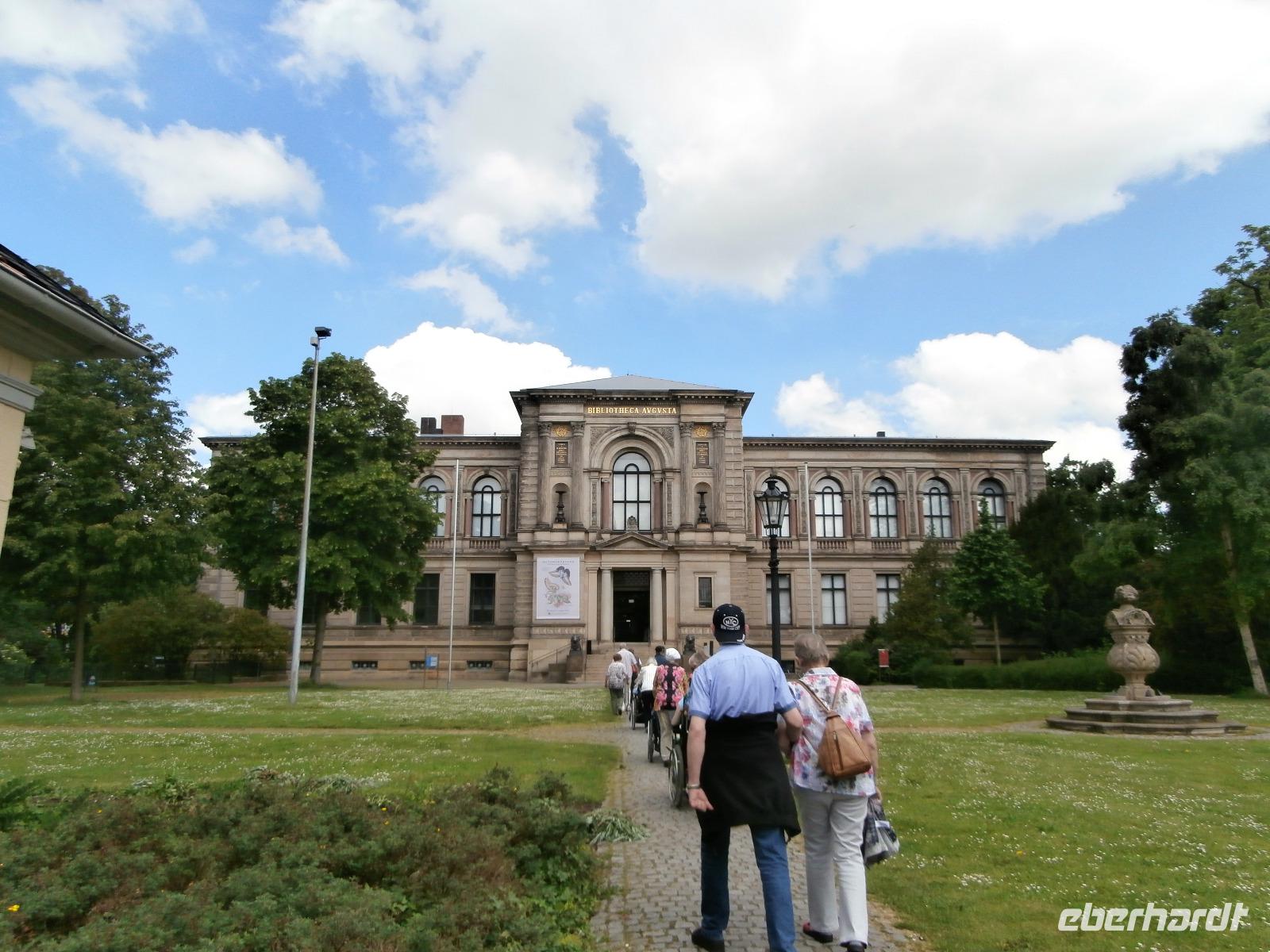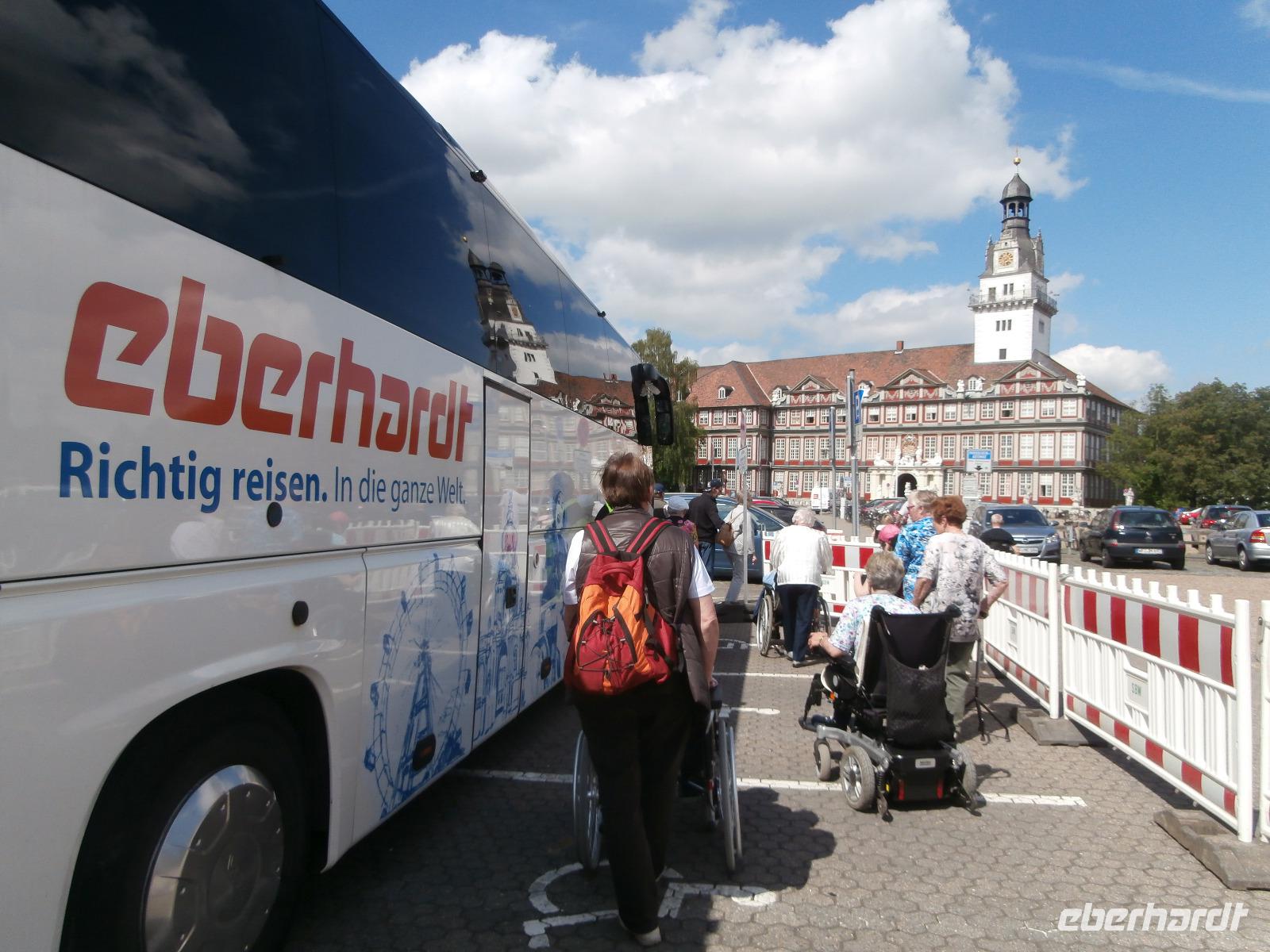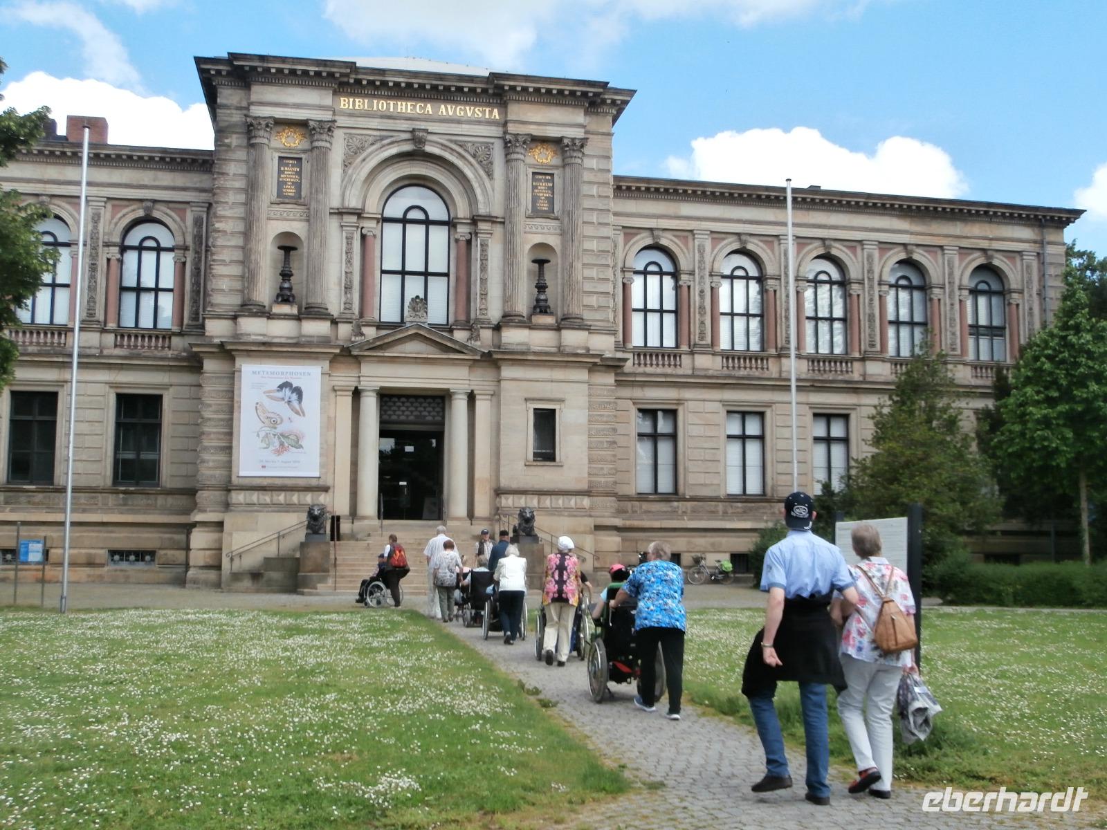 Wolfenbüttel zwischen Harz und Heide gelegen, hat sich infolge der vergleichsweise geringen Kriegsschäden ein nahezu geschlossenes historisches Stadtbild erhalten. Prägend für die Stadt und ihr heutiges Aussehen waren die Welfen. Die gut erhaltenen alten Bauten waren auch ein Grund dafür, dass die neuere Fassung der Feuerzangenbowle mit Nadja Tiller und Walter Giller hier in Wolfenbüttel gedreht wurde. Wolfenbüttel steht etwas im Schatten von Braunschweig muss sich aber nicht verstecken. Am Schlossplatz werden wir von unserem Stadtführer Herrn Higl schon erwartet. Schnell sind unsere Rollis ausgeladen und bei schönstem Sommerwetter rollen wir vom Schloss hinüber zum Lessinghaus. Später verweilen wir vor der Herzog August Bibliothek mit der Steinsonnenuhr auf dem Rasen davor. Übrigens verweilte Casanova für eine Woche zu Studierzwecken in der Bibliothek. Vorbei am Zeughaus rollen wir in Richtung Markt und Rathaus von Wolfenbüttel. Zuvor schauen wir uns das schmalste Haus aus 1751 an, es ist zu vermieten. Wunderschöne Fachwerkbauten sehen wir am Marktplatz, wo auch das Reiterdenkmal von Herzog August steht und ein ganzes Ensemble von Fachwerkhäusern, die alle zum Rathaus gehören. Nach der großen Kulturrunde durch Wolfenbüttel legen wir in einem der zahlreichen Cafés und Restaurants in der Fußgängerzone eine Mittagspause ein. Später werden wir am Schloss zur Führung im einzigen originalen Residenzschloss der Braunschweiger Welfen erwartet. Mit einem Lift kommen wir in die oberen Stockwerke, von wo aus wir unsere Führung erleben. Vier von den sechsräumigen Herzogappartements sehen wir während des Rundgangs. Die spätbarocken Prunkgemächer dürfen nur über den roten Teppich betreten werden und auch das Fotografieren nur für private Zwecke muss genehmigt werden. Nach so viel Prunk und Glanz sind wir doch ganz froh, wieder im Bus bei Jens zu sitzen. Hier gibt es Kaffee und Cappuccino, auch gut gekühltes Radler trinken wir, hat sich doch der Sommer mit Hitze eingestellt. Vorbei an Salzgitter geht unsere Rückfahrt nach Goslar. Hier hat es schon geregnet und das Wetter ändert sich auch in der Nacht.