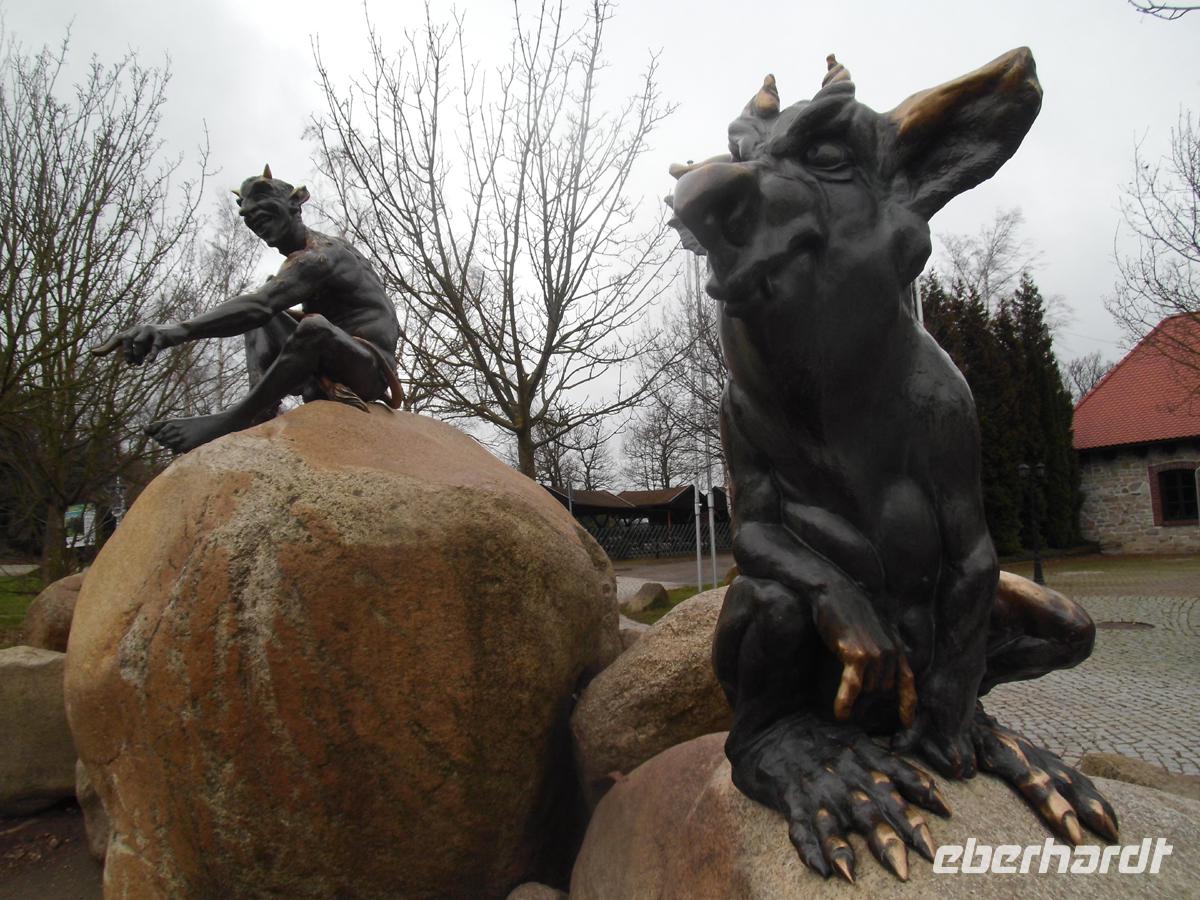 Wir durchqueren das erste Mal den Harz direkt am Hexentanzplatz oberhalb von Thale vorbei. Der wunderbare Blick ins tief unter uns gelegene Bodetal und zur gegenüber liegenden Roßtrappe begeistert alle. Aber es herrscht kräftiger Wind. Bronzeskulpturen erinnern an die Sage, dass sich die Hexen zu Walpurgis, wie an anderen Orten des Harzes mit Luzifer ein Stelldichein geben.