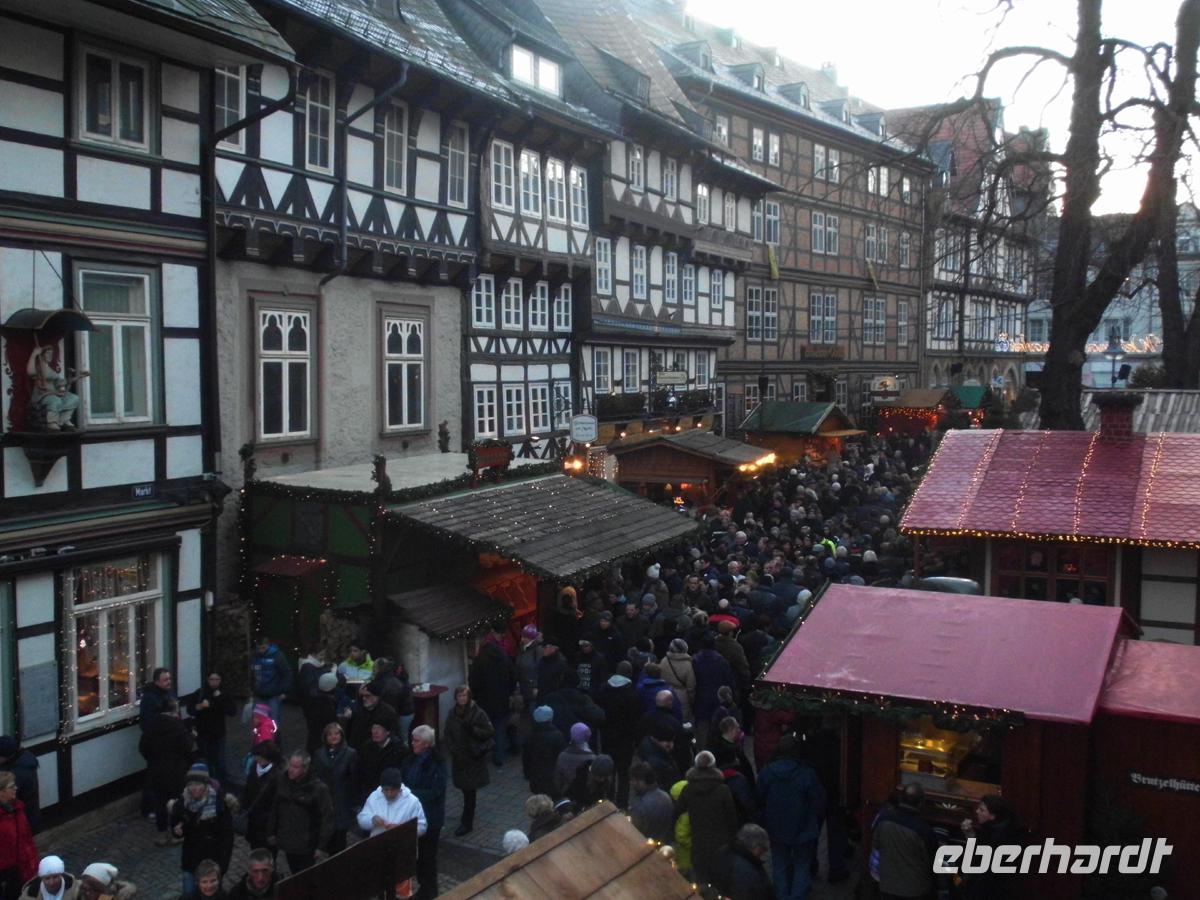 Über die mächtige Staumauer der Rappbodetalsperre reisen wir weiter nach Wernigerode. Optional ist ein Stadtrundgang mit dem Reiseleiter oder das Erkunden der Stadt auf eigene Faust geplant. Die meisten Gäste schließen sich mir an. Wir besuchen das kleinste Haus der Stadt und gehen über den oberen Pfarrkirchhof zum Marktplatz und wieder durch die Breite Strasse zurück zum Bus. Auch die Keimzelle der Stadt, den Oberpfarrhof mit St. Silvestri lassen wir nicht aus. Unterhalb dessen steht das schiefste Haus der Stadt. Ich gebe wichtige Dinge zur Stadtgeschichte und zum Fachwerkbau ab, sowie zu einem der schönsten Rathäuser Deutschlands. In Wernigerode treffen niedersächsischer und hessisch-fränkischer Fachwerkstil wie selten sonst aufeinander. Gerne werden die Gäste auf Dinge aufmerksam gemacht, die man leicht übersieht. So auch auf steinerne Brandmauern zwischen den Fachwerkhäusern. Sie sind oft viel älter als die Häuser zwischen ihnen, weil nur sie selbst die vielen Stadtbrände überdauert haben, deren Ausbreitung sie eigentlich verhindern sollten. Hoch über der Stadt sehen wir das märchenhafte Schloss der Grafen zu Stolberg-Wernigerode.15 Uhr treffen sich alle zum Kaffeetrinken im Restaurant. Der Weihnachtsmann bringt Geschenke für die Kinder unter den Gästen und eine Pianistin spielt Weihnachtslieder!