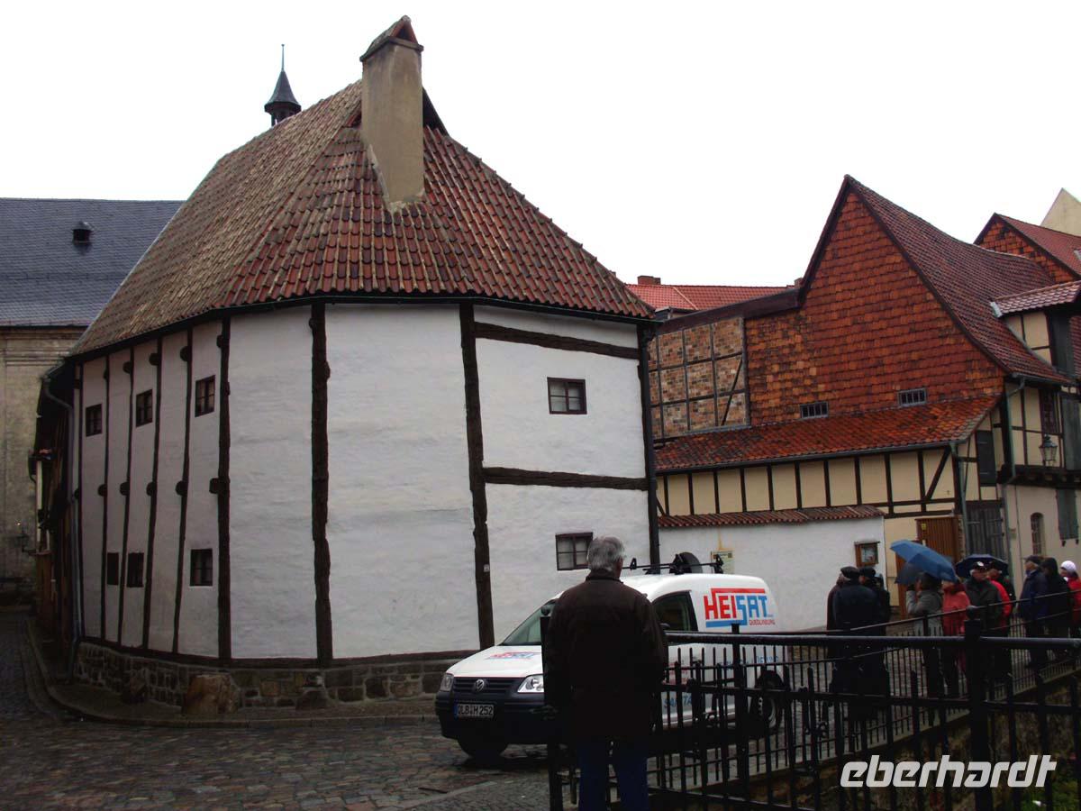 Nur 2 Minuten vom Markt hält der Bus auf einem großen Parkplatz. Die Gästeführerin wartet schon auf uns und 13.30 Uhr machen wir uns auf den Weg durch die Welterbestadt mit 1600 Fachwerkhäusern aus 600 Jahren. Und über allem trohnt die Stiftskirche mit der Grablege Heinrichs I. und seiner Frau Mathilde.