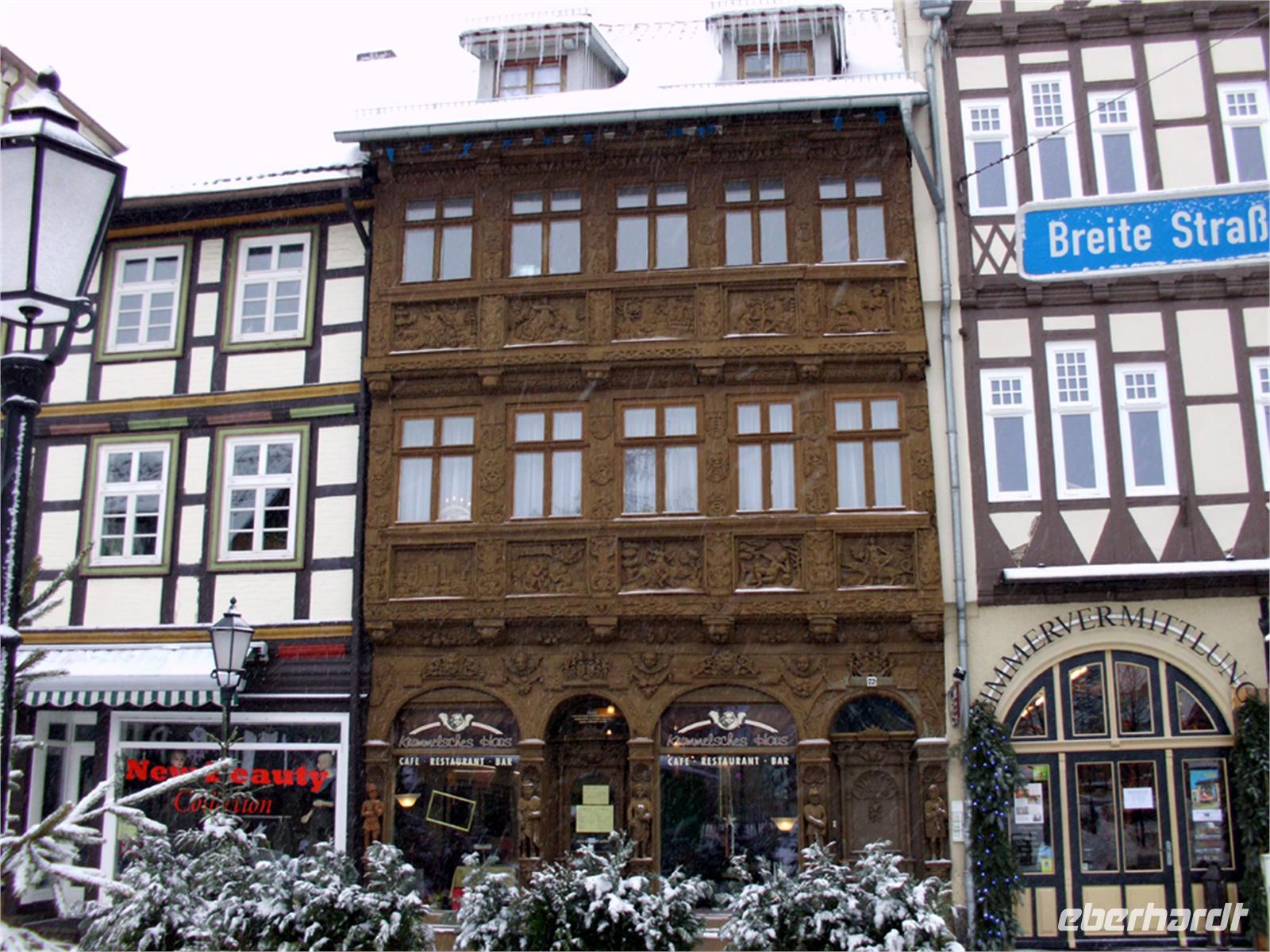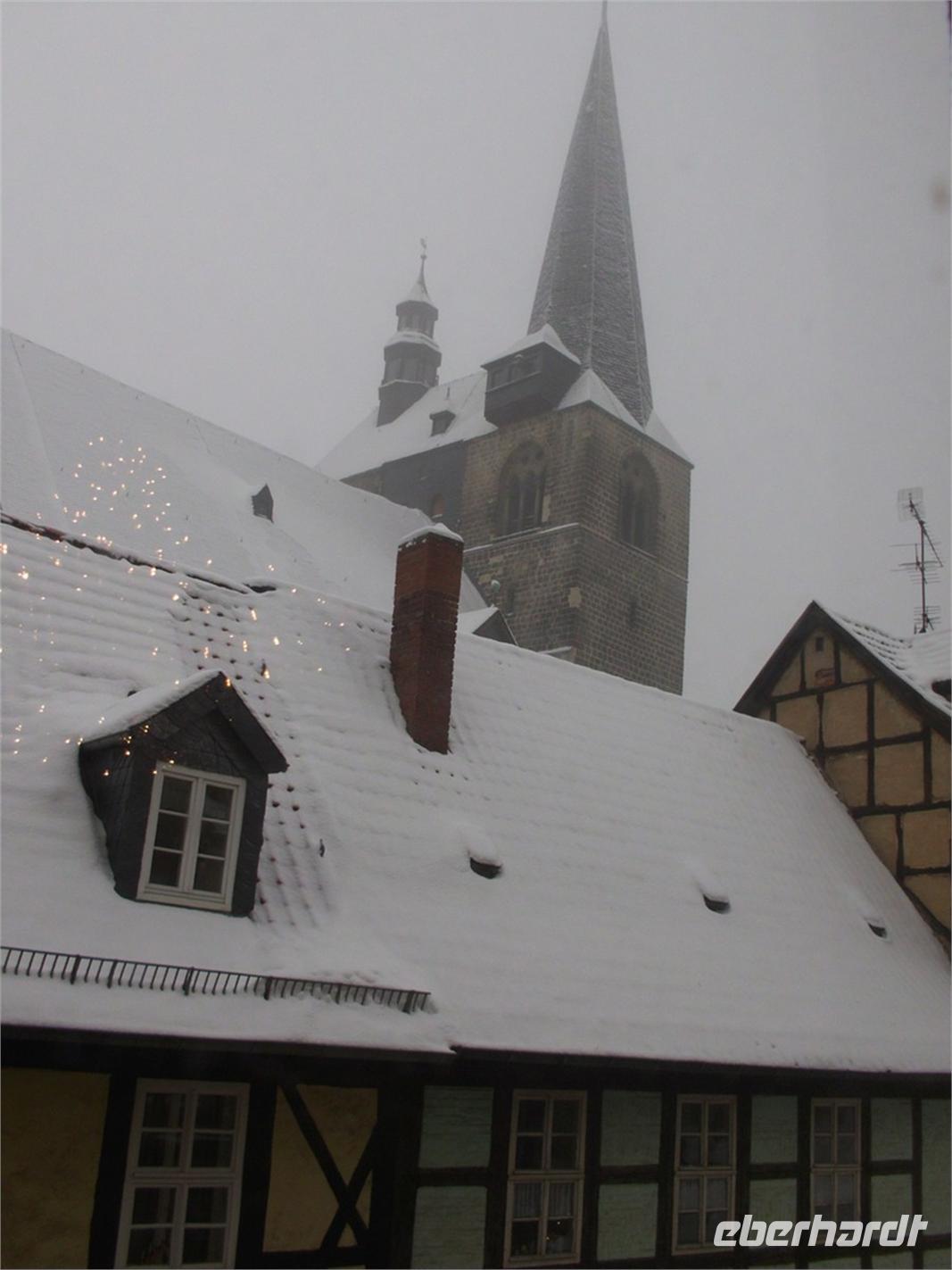 Weiter geht es an der Ratswaage vorbei auf den Severinskirchplatz, der Keimzelle der Stadt. Hier lagen die Stadthöfe des Adels. Hoch über der Stadt sehen wir das märchenhafte Schloss der Grafen zu Stolberg-Wernigerode.