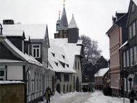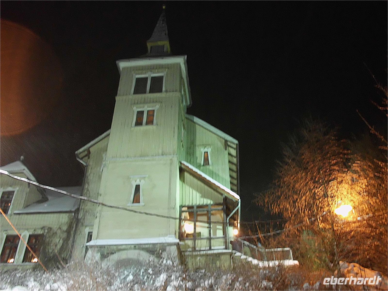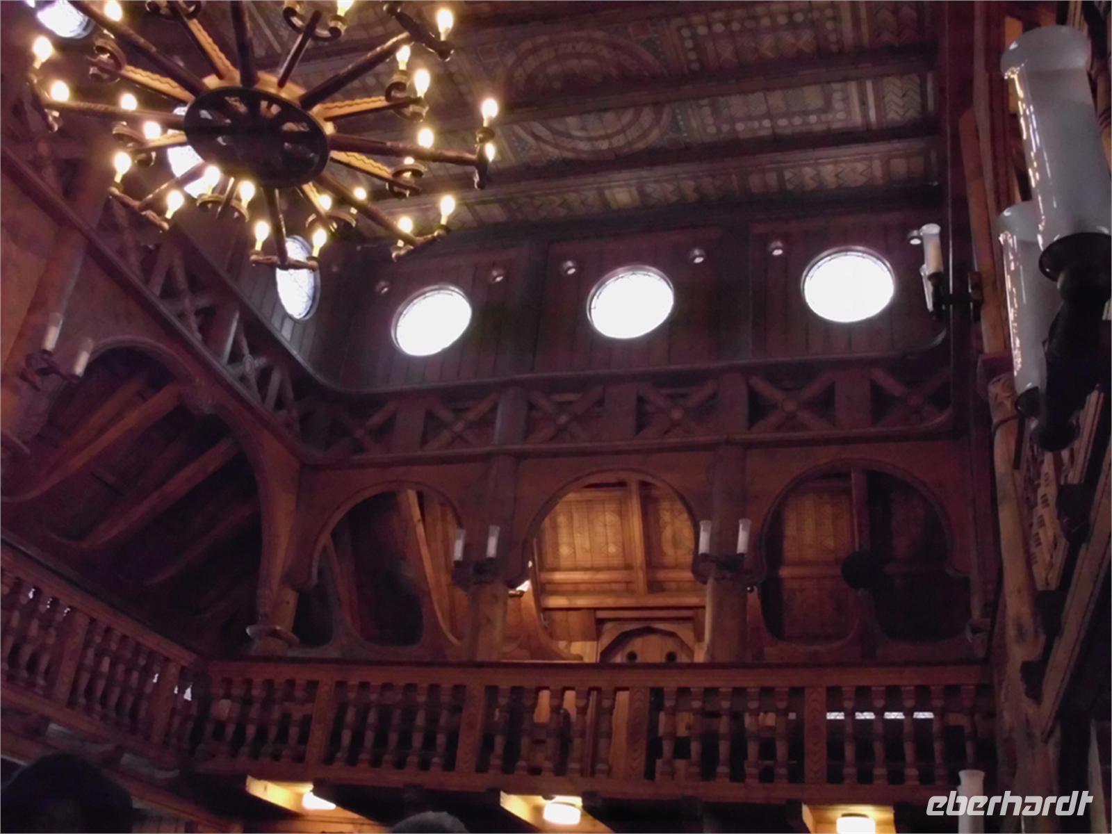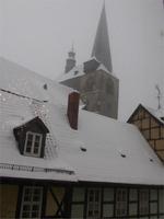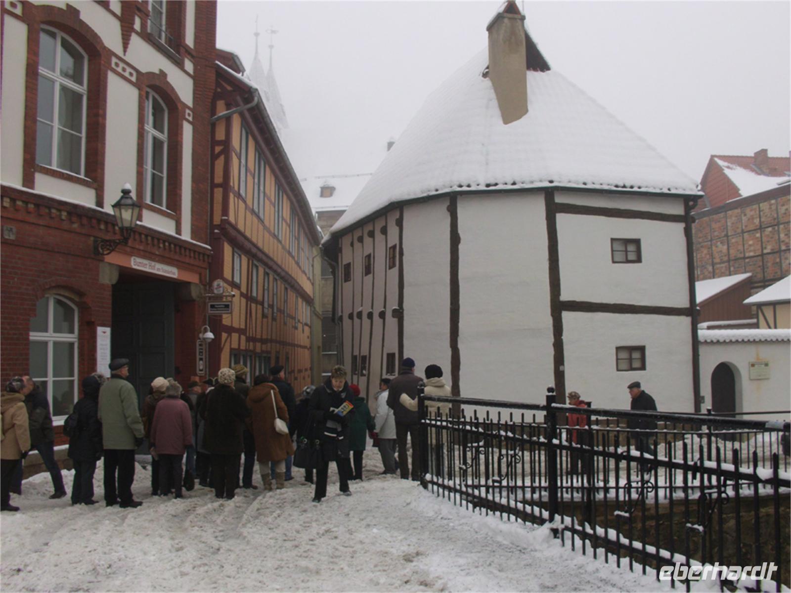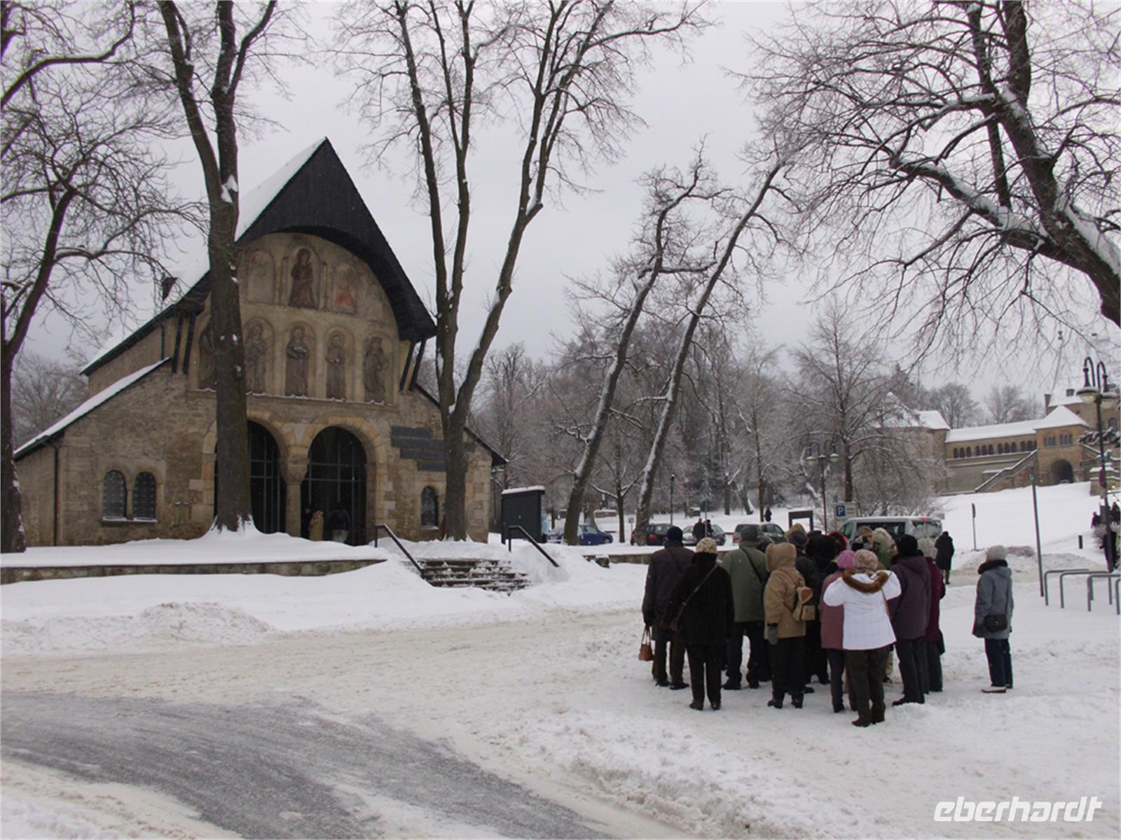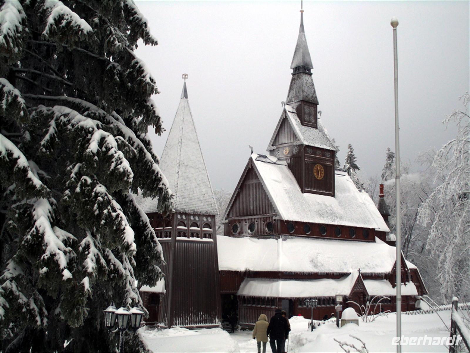 Es geht Richtung Westen zu Stabkirche in Hahnenklee. Sie ist einzigartig in Deutschland und kopiert ein Original von Borgund aus Norwegen, ist jedoch viel größer. Vor der Kirche halte ich einen Vortrag über die Geschichte der Stabkirchen, ihre Bauweise und den Zusammenhang mit der wickingerzeitlichen Schiffsarchitektur. Der Eintritt ist frei, aber es wird eine Spende von 1 Euro pro Person erwartet. Uns bietet sich ein malerischer Anblick auf die verschneite Kirche. Alle sind begeistert.