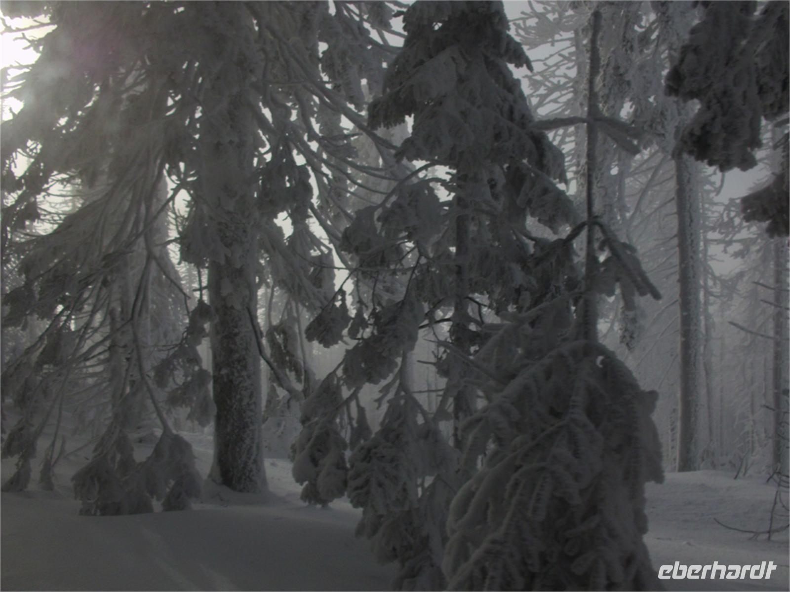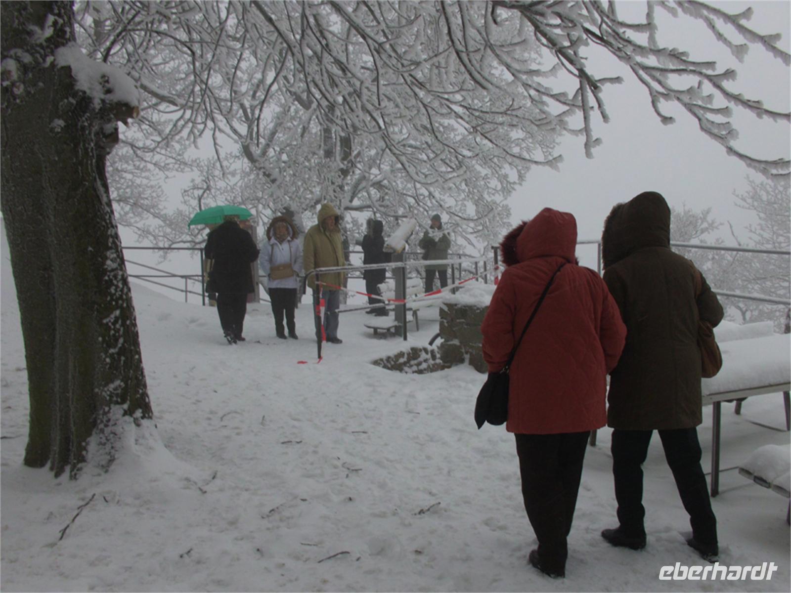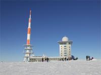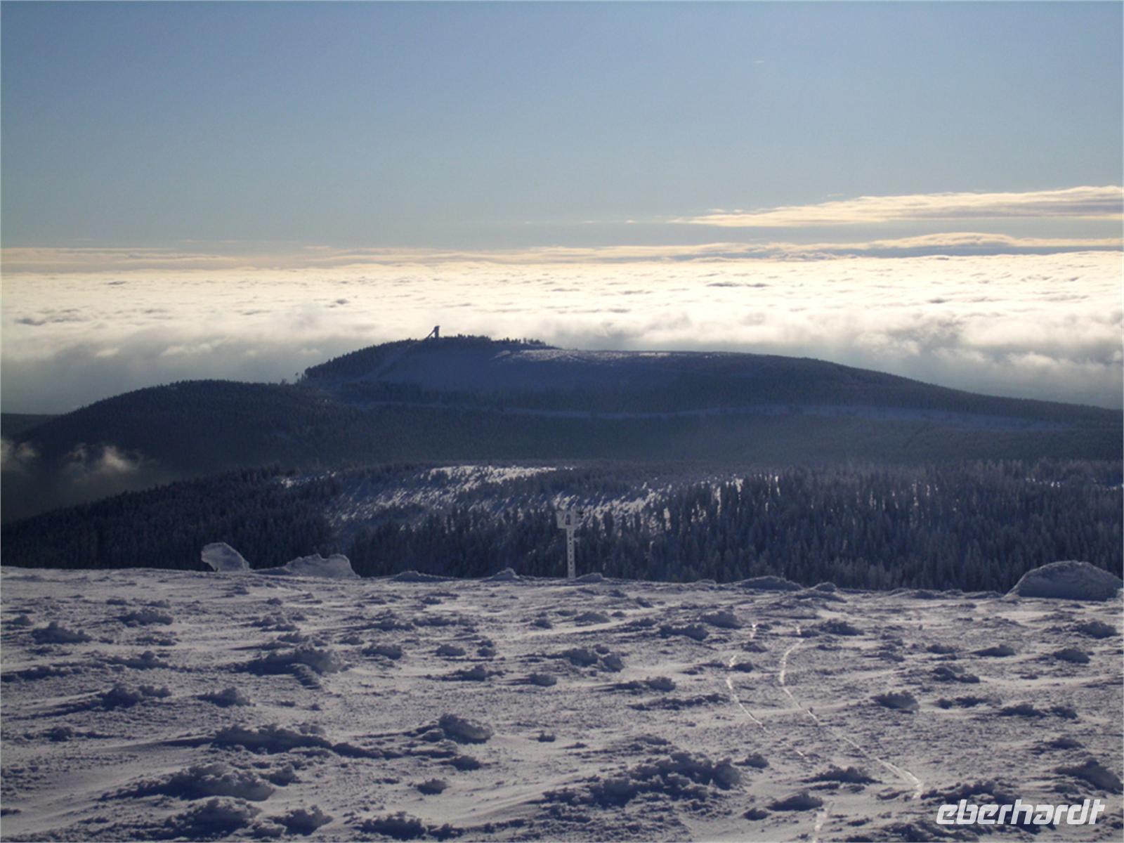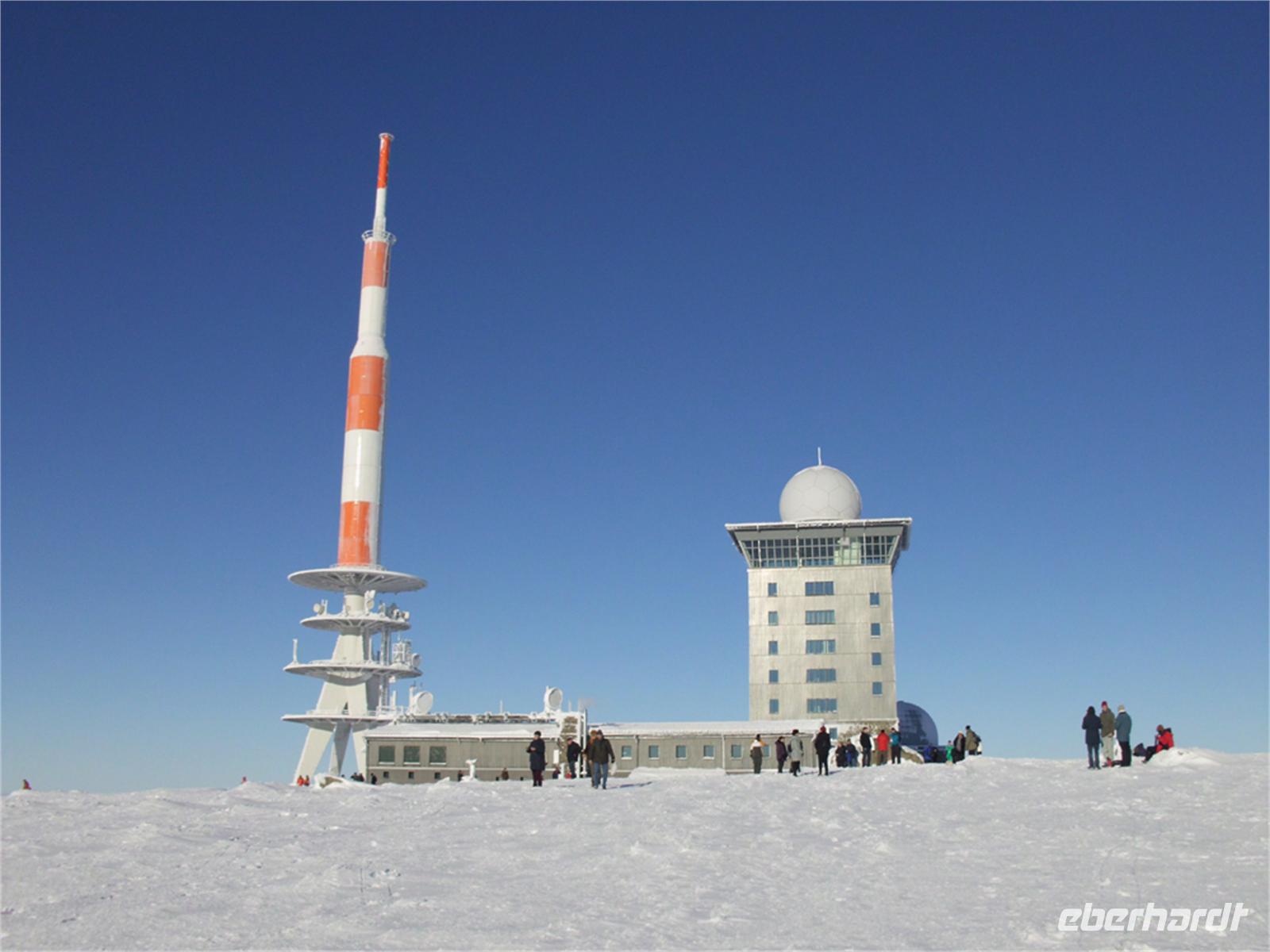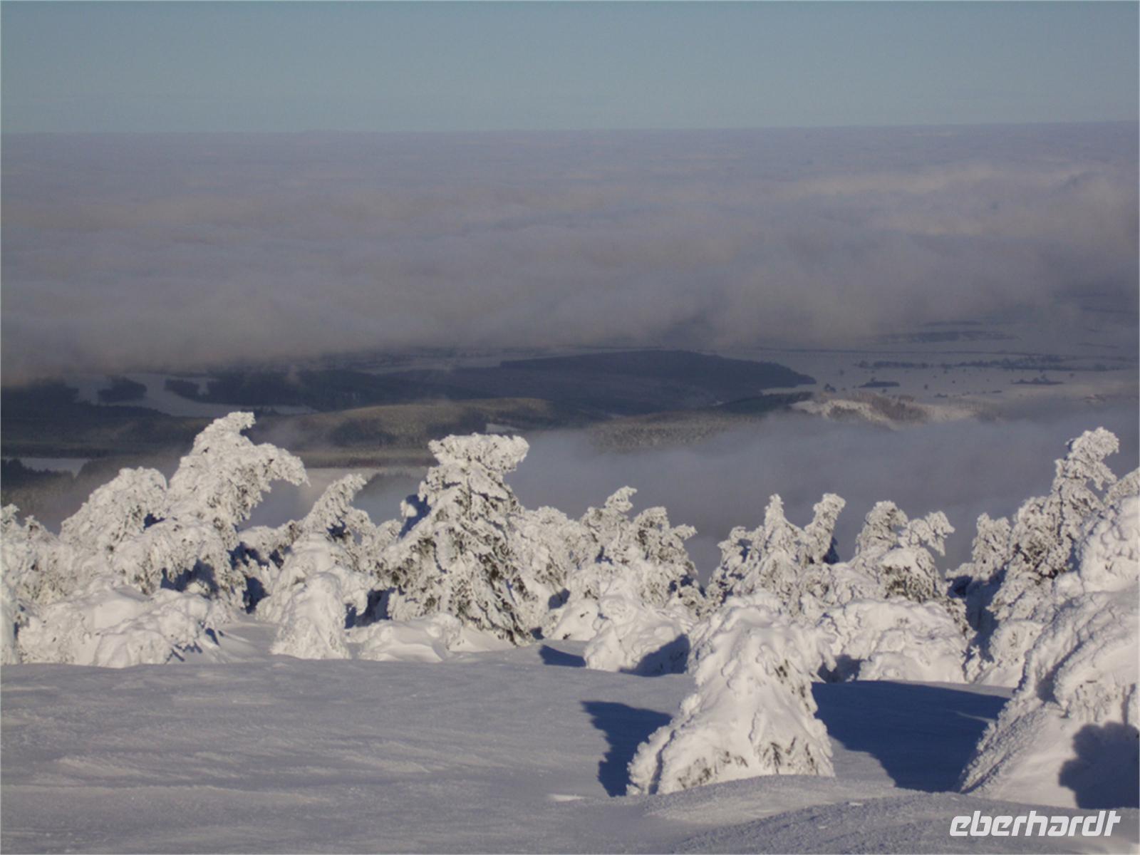 Als wir auf dem Brocken ankommen umfängt uns herrlichster Sonnenschein mit Fernsicht über den Wolken. Das entschädigt alle für die vorangegangenen Nebeltage. Tief verschneit ist das Plateau und die unter der Schneelast gebeugten Bäume weiter unten sehen aus wie Fabelwesen.