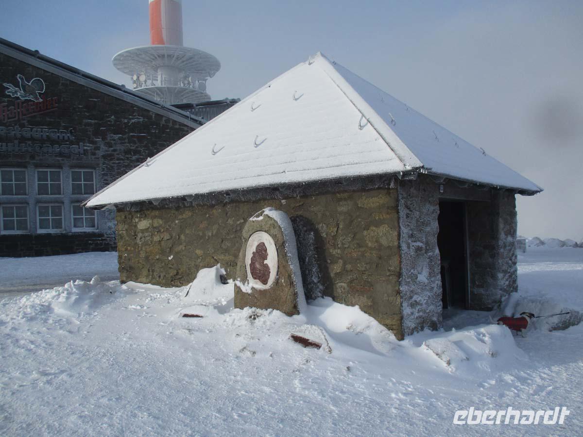 Als wir die Baumgrenze erreichen ahnt jeder, dass es auf dem Gipfel ungemütlich werden kann. Das Wetter ist typisches Brockenwinterwetter. Der Wind pfeift eisig. Aber plötzlich klar es auf und die Sonne scheint. Welch ein Glück.
