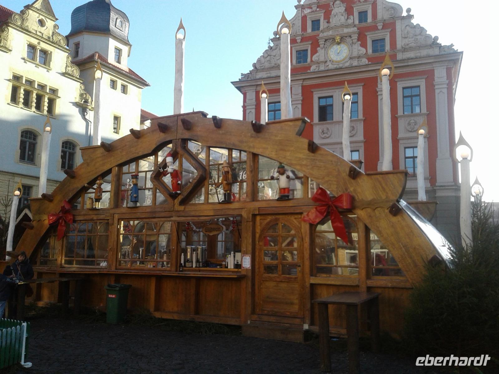 Uns interessierte jedoch - aus gegebenem Anlass unserer Weihnachtsreise, der Gothaer Weihnachtsmarkt, der an mehreren historischen Plätzen zu finden war. Wir spazierten zunächst zum Hauptmarkt den das schöne Renaissancerathaus sozusagen „teilt". Vor dem Rathausturm eröffnet sich der größere Marktteil mit schönem Blick zum Schloss Friedenstein, auf dem unteren Teil sowie dann vor allem auf dem Neumarkt vor der Margarethenkirche waren die Stände zu finden, die jeden Weihnachtsmarkt ausmachen: Glühwein und Thüringer Bratwurst, Gebrannte Mandeln und „schokoliert Früchte" verlockten zum Kosten und erzeugten im Verein mit dem Tannengrün den charakteristischen „Weihnachtsmarkt-Duft".