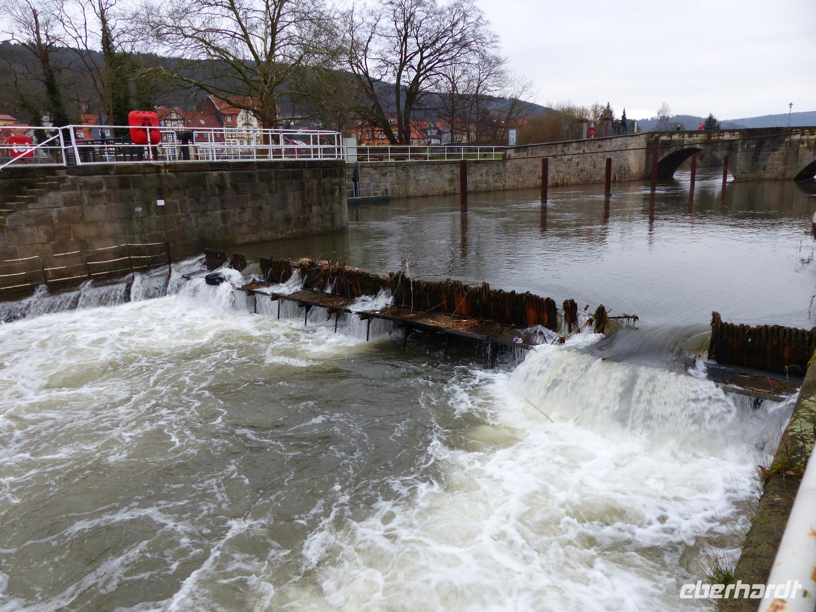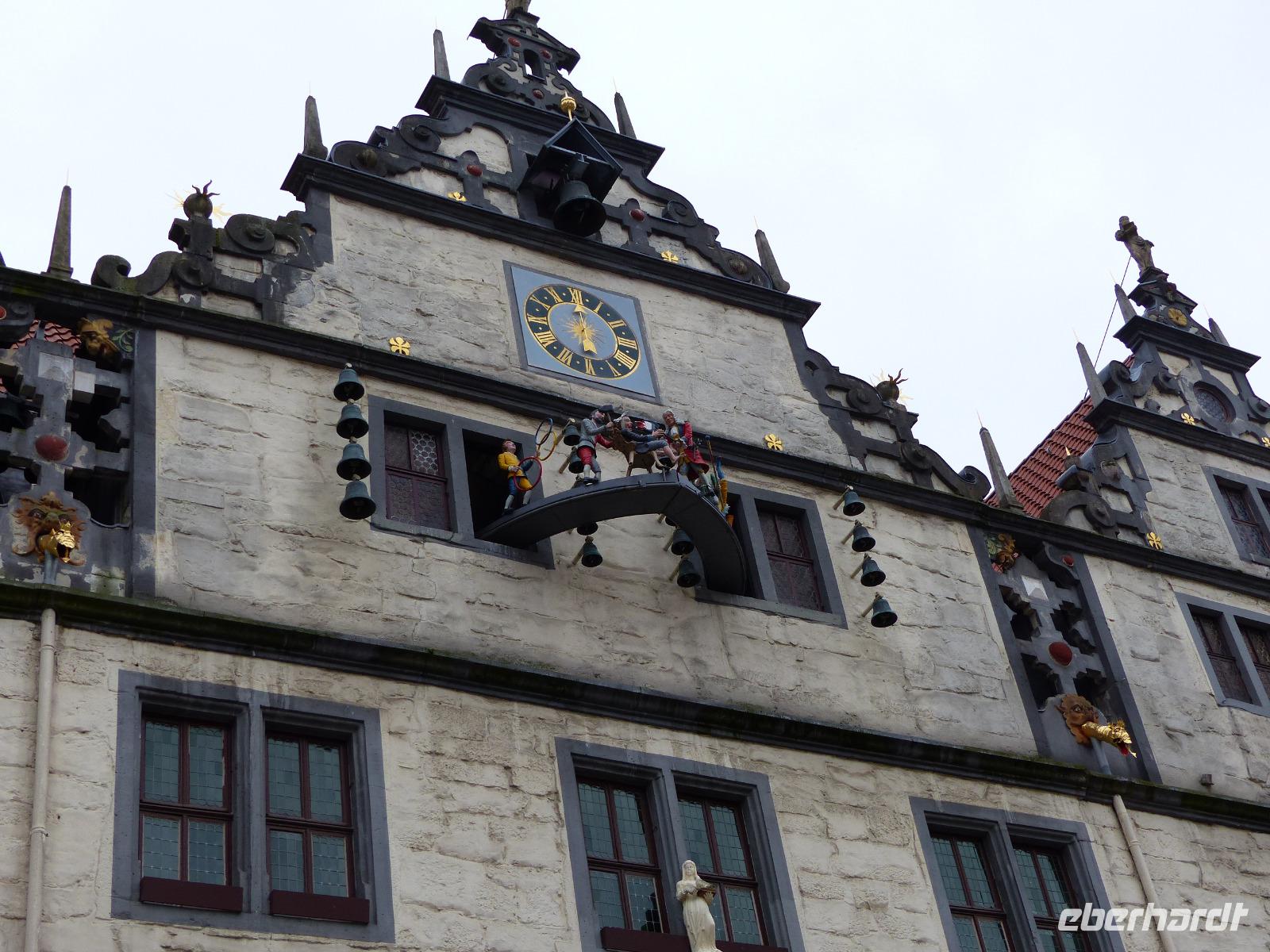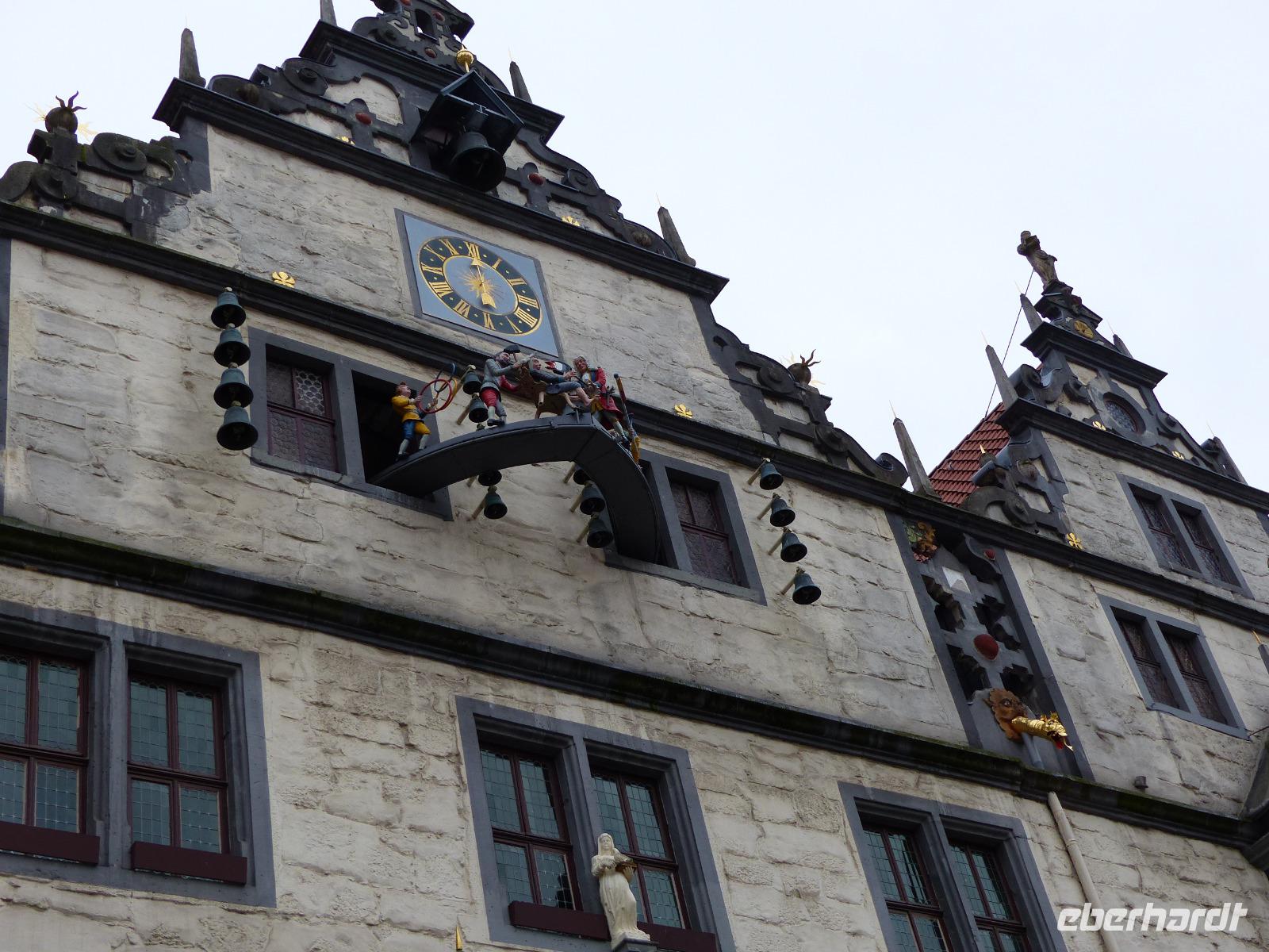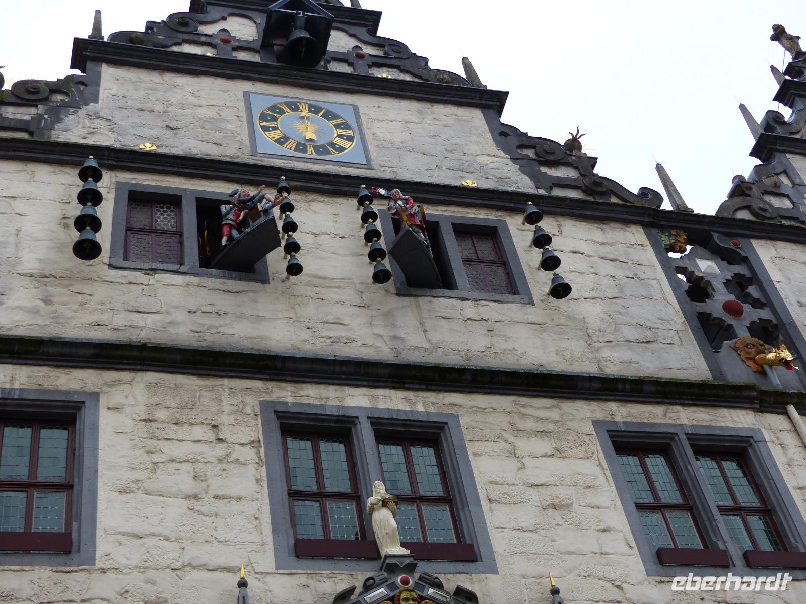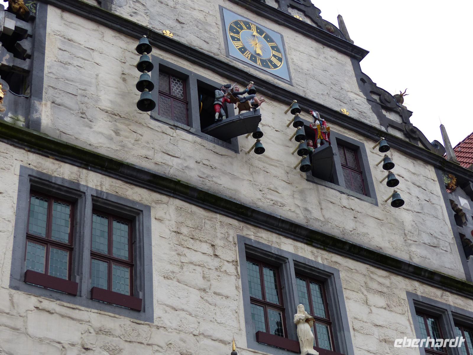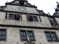 Das heutige Tagesprogramm führte zum Entstehungsort der Weser, einem der längsten Flüsse Deutschlands und dem einzigen großen Strom, der komplett und auch mit all seinen Nebenflüssen in unserem Land fließt, ohne andere Länder zu berühren. In Hannoversch Münden, nach einem viel zitierten Ausspruch Alexander von Humboldts einer der am schönsten gelegenen Städte der Welt, fließen Werra und Fuld zusammen und bilden einen neuen Fluss - die Weser. „Wo Werra sich und Fulda küssen, sie ihren Namen büßen müssen" steht denn auch auf dem historischen Gedenkstein am Zusammenfluss. Dieser „Weserstein" war unser erstes Fotomotiv, als wir am Vormittag in Hann. Münden - der offizielle Stadtname beruht tatsächlich auf dieser Abkürzung" - ankamen. Bei einem ausführlichen Stadtrundgang lernten wir die durch ihre Lage an Handelswegen und schiffbaren Flüssen geschichtlich bedeutsame Kleinstadt kennen, die mit über 700 herrlichen Fachwerkhäusern aufwarten kann. Diese Bebauung verleiht ihr das historisch-romantische Flair, das sie auch zum beliebten Touristenort macht. Auch Reste der Stadtbefestigung, die alte Werrabrücke, die historischen Packhöfe und das Welfenschloss sind sehenswert. Besonders interessant war für uns das historische Rathaus. Das im Kern aus dem 14. Jh. stammende Gebäude mit der Anfang des 17. Jh. entstandenen Schaufassade hat etwas besonders Interessantes: Das schon vor langer Zeit im Obergeschoss eingebaute Obergeschoss zeigt einen Figurenumlauf mit Szenen aus dem Leben des hier im Ort verstorbenen und begrabenen bekannten Wundarztes und Chirurgen Dr. Eisenbarth. Das bekannte, erst um 1800 entstandene volkstümliche Lied „ich bin der Doktor Eisenbarth" erklingt dazu und begleitet das hübsche Figurenspiel am Rathaus.