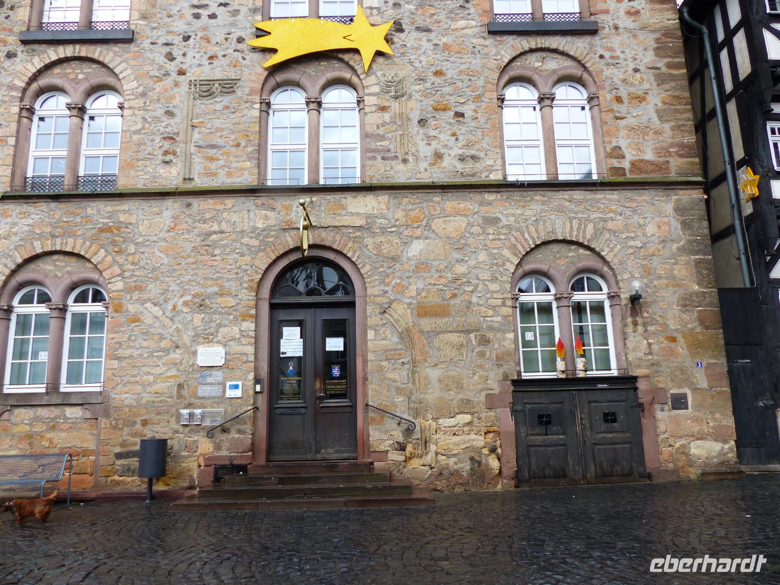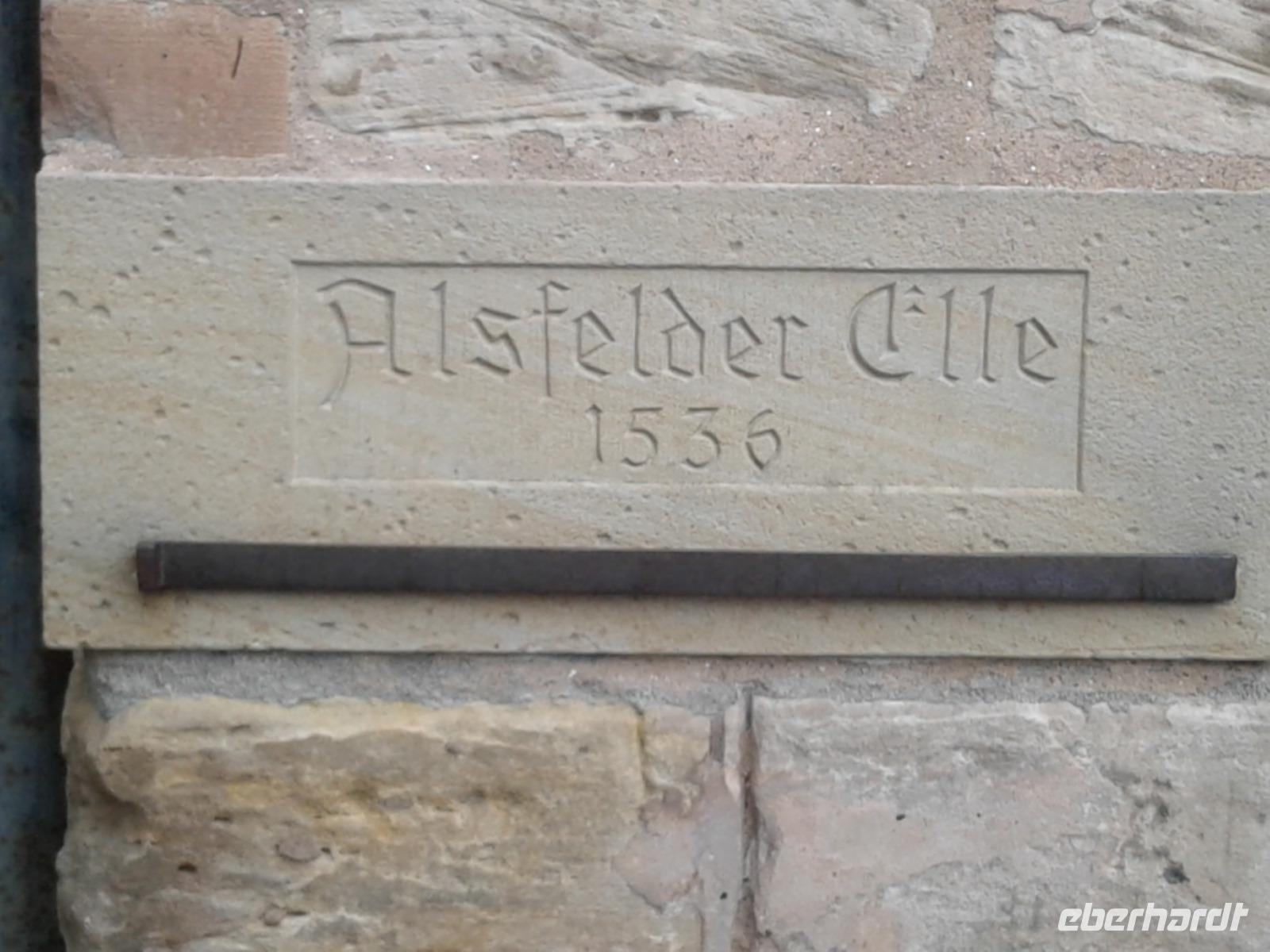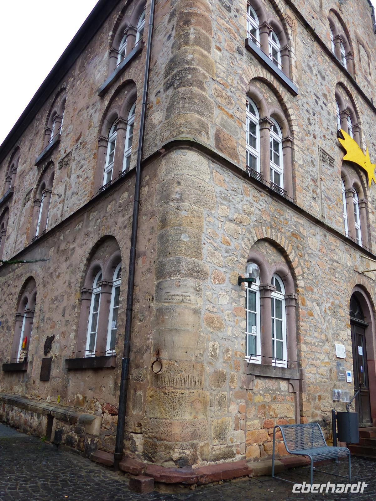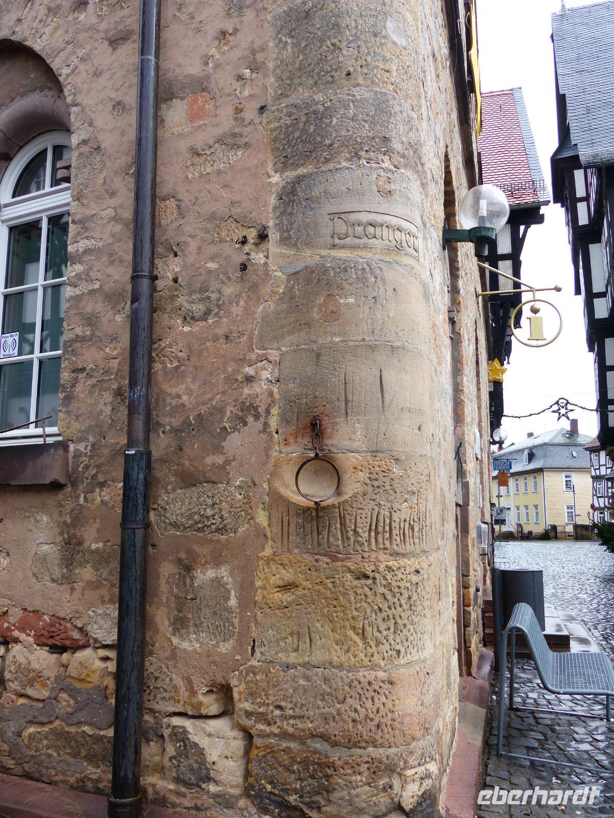 Das Alsfelder Rathaus, auf dem mit drei Arkaden versehenen steinernen Unterbau einer Markt- und Gerichtshalle in Rähmbauweise Anfang des 16. Jh. errichtet, gilt als eines der schönsten Rathäuser Deutschlands. Als Wahrzeichen der Stadt ziert es verschiedene Firmenlogos und war auch schon Motiv auf einer Briefmarke der Deutschen Post. Dicht neben dem Rathaus steht der Steinbau des Weinhauses. Bemerkenswert an dem Bau mit Staffelgiebelk ist seine Ecke: hier befindet sich noch heute der Pranger, ein mittelalterliches Straf-Gerät. In Alsfeld ist dies ein fest im Mauerwerk an einer kurzen Kette verankerter und verschließbarer Eisenring, der Delinquenten nach ihrer Aburteilung um den Hals gelegt wurde. Damit waren Ärmsten wehrlos dem Spott oder der Gewalttätigkeit ihrer Mitmenschen ausgeliefert. Da der - deutlich vielfach benutzte - Pranger über einen Trittstein verfügt, kann er verschiedenen Körpergrößen „angepasst" werden.